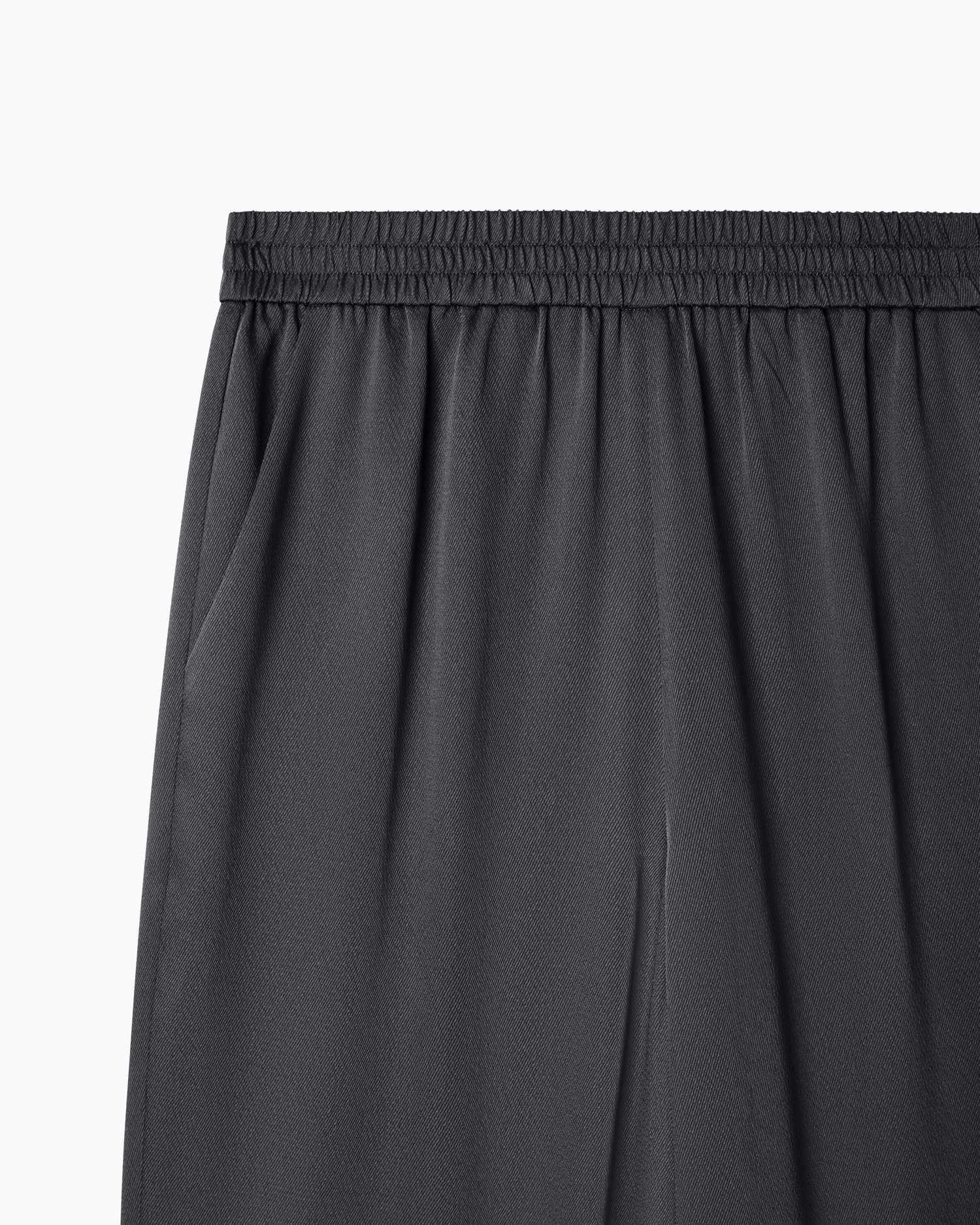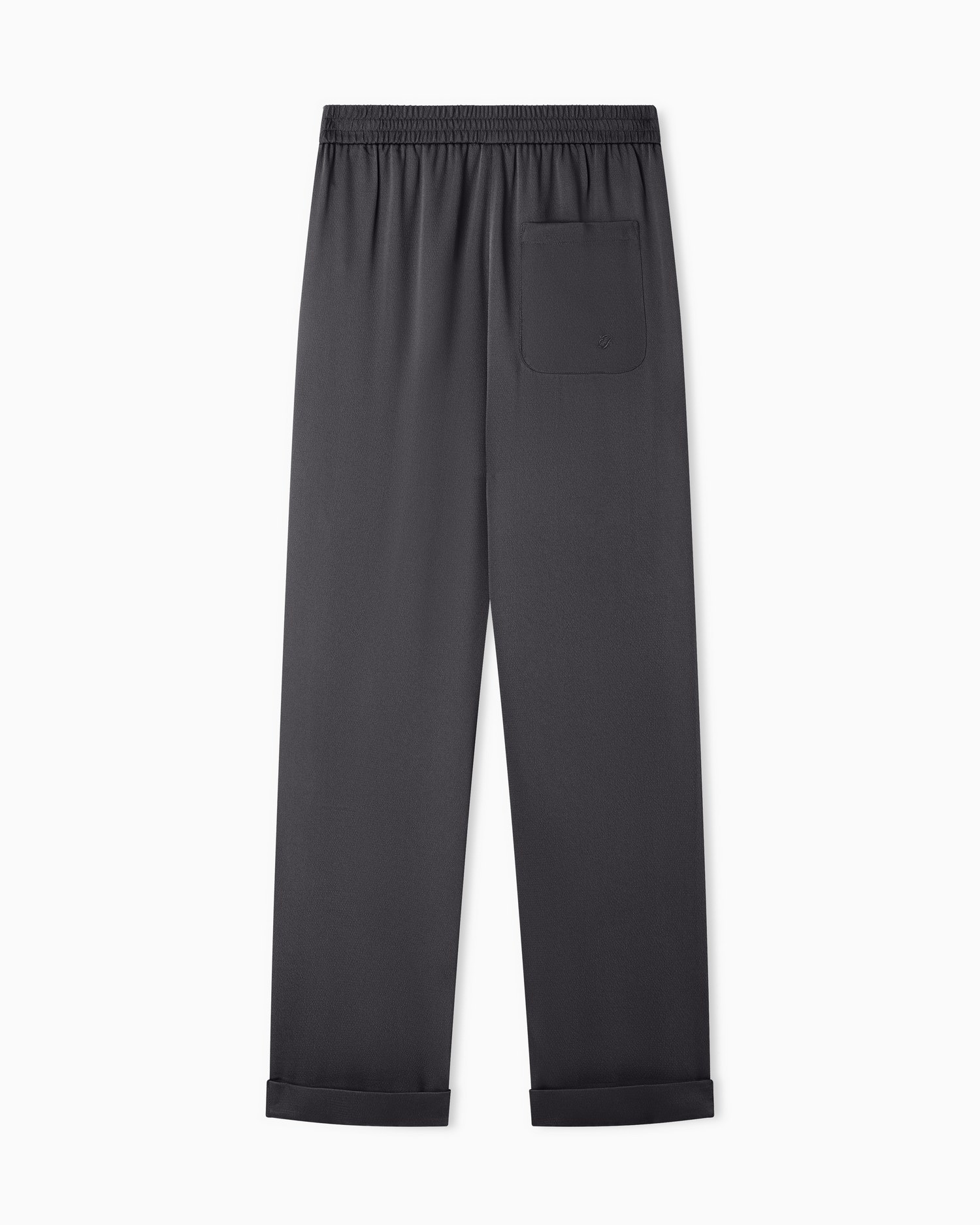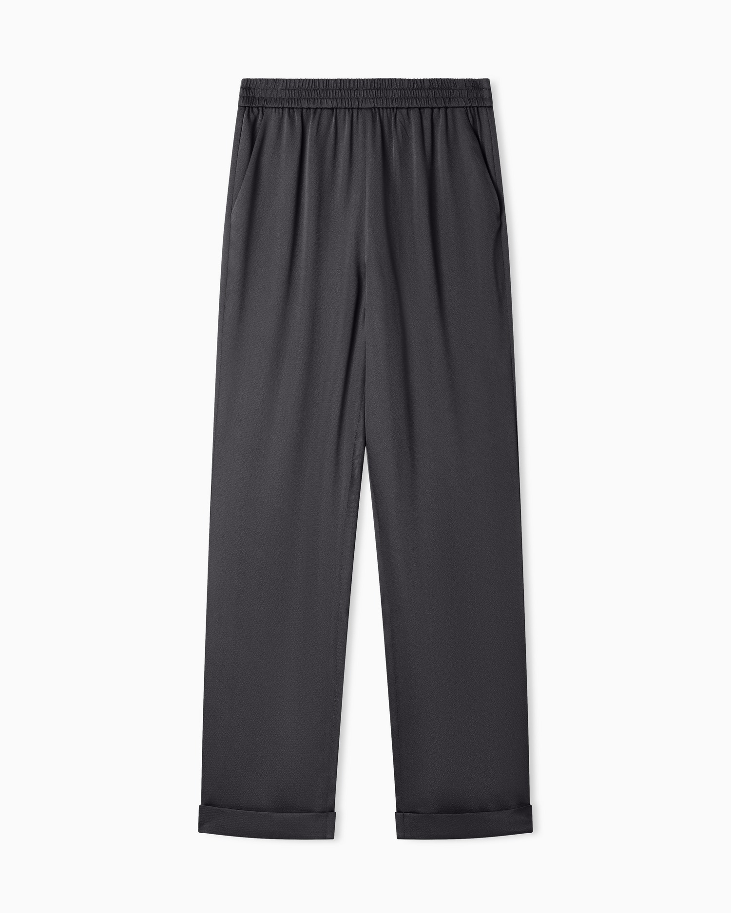 Pantaloni a vita elastica in twill crepe, tasche laterali, risvolto fisso sul fondo e tasca con ricamo logo sul retro.