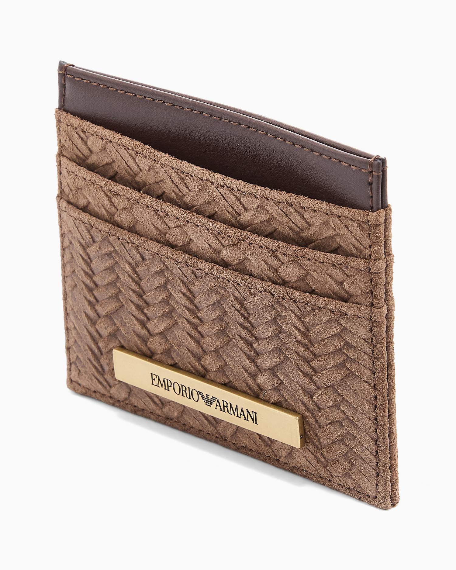 Portacarte in suede con dettagli in metallo gold, placca logata e scomparti multipli per carte.