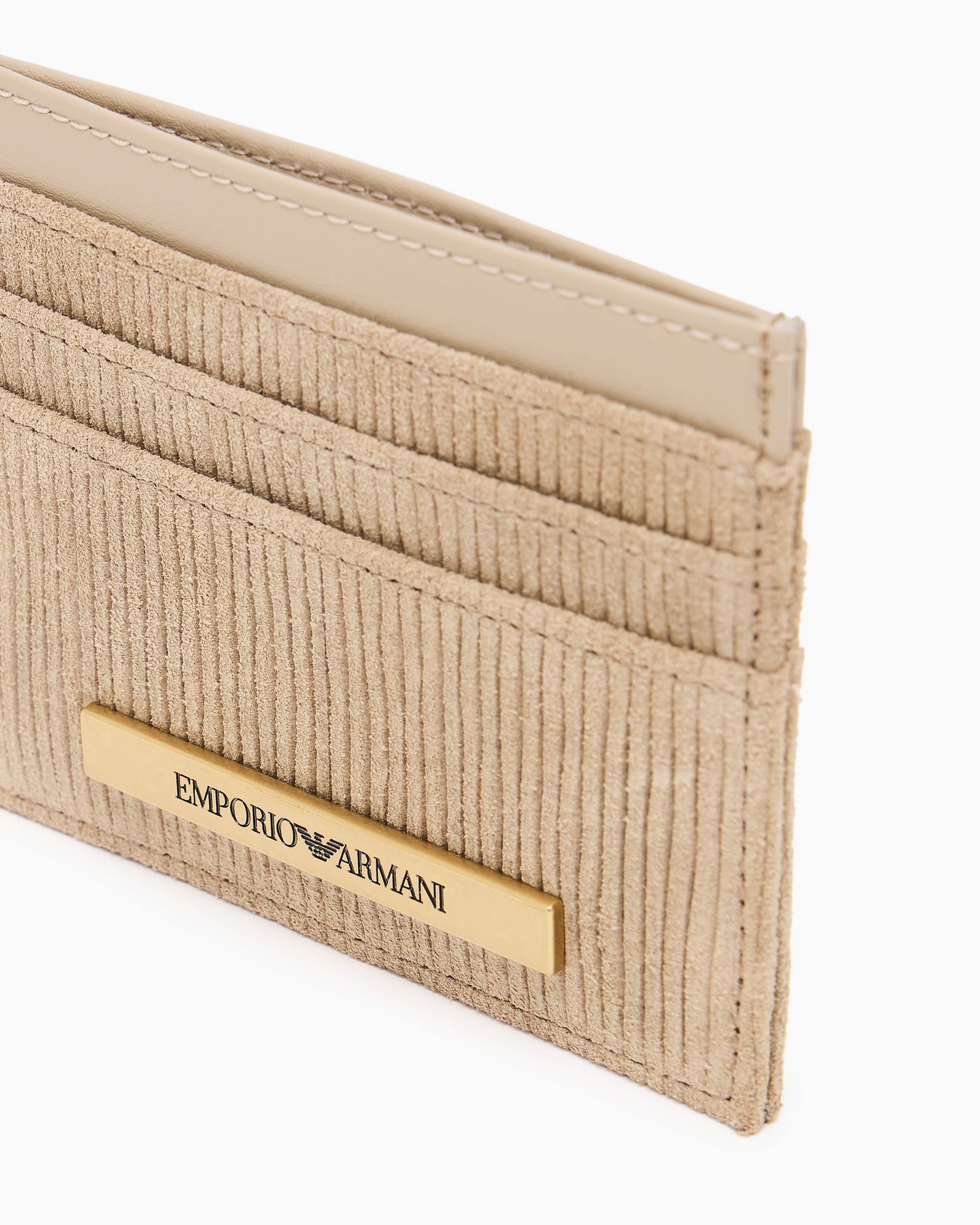 Portacarte in suede con dettagli in metallo gold, placca logata e scomparti multipli per carte.