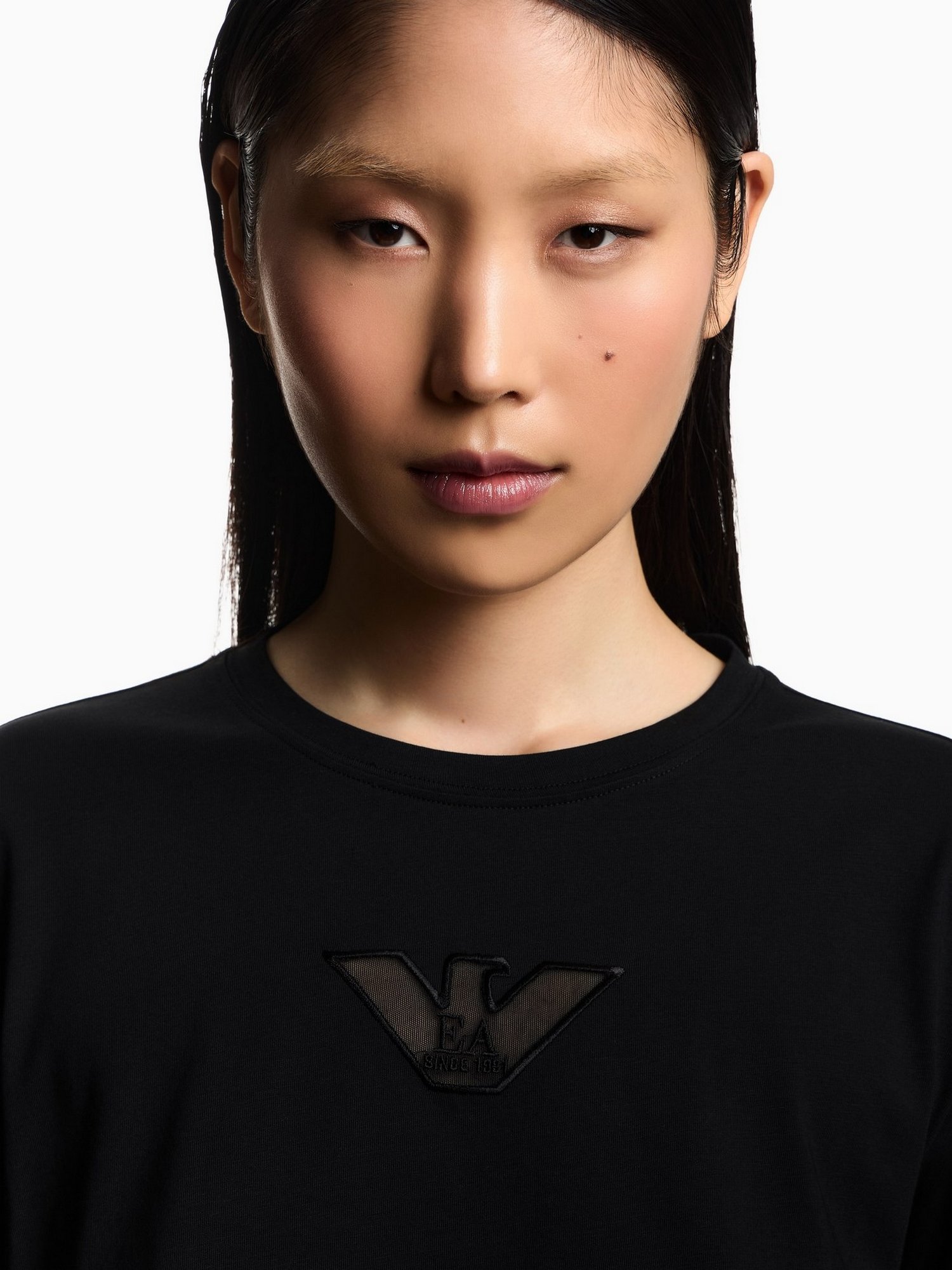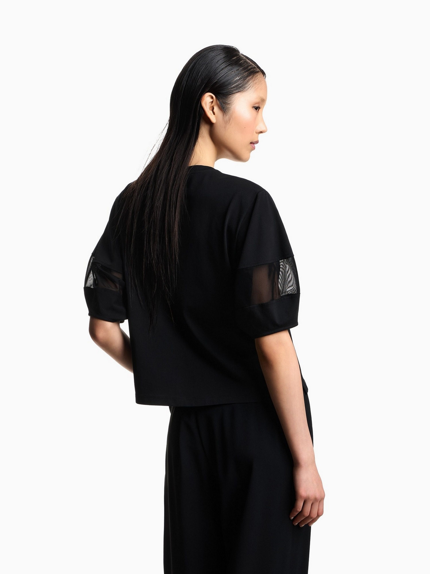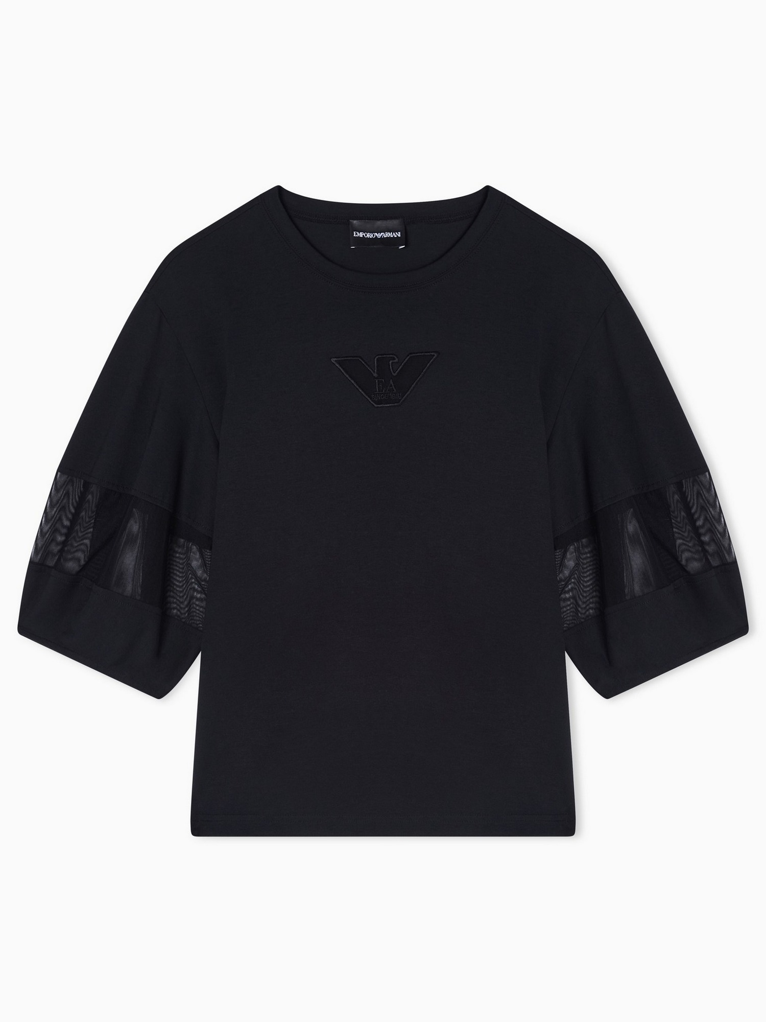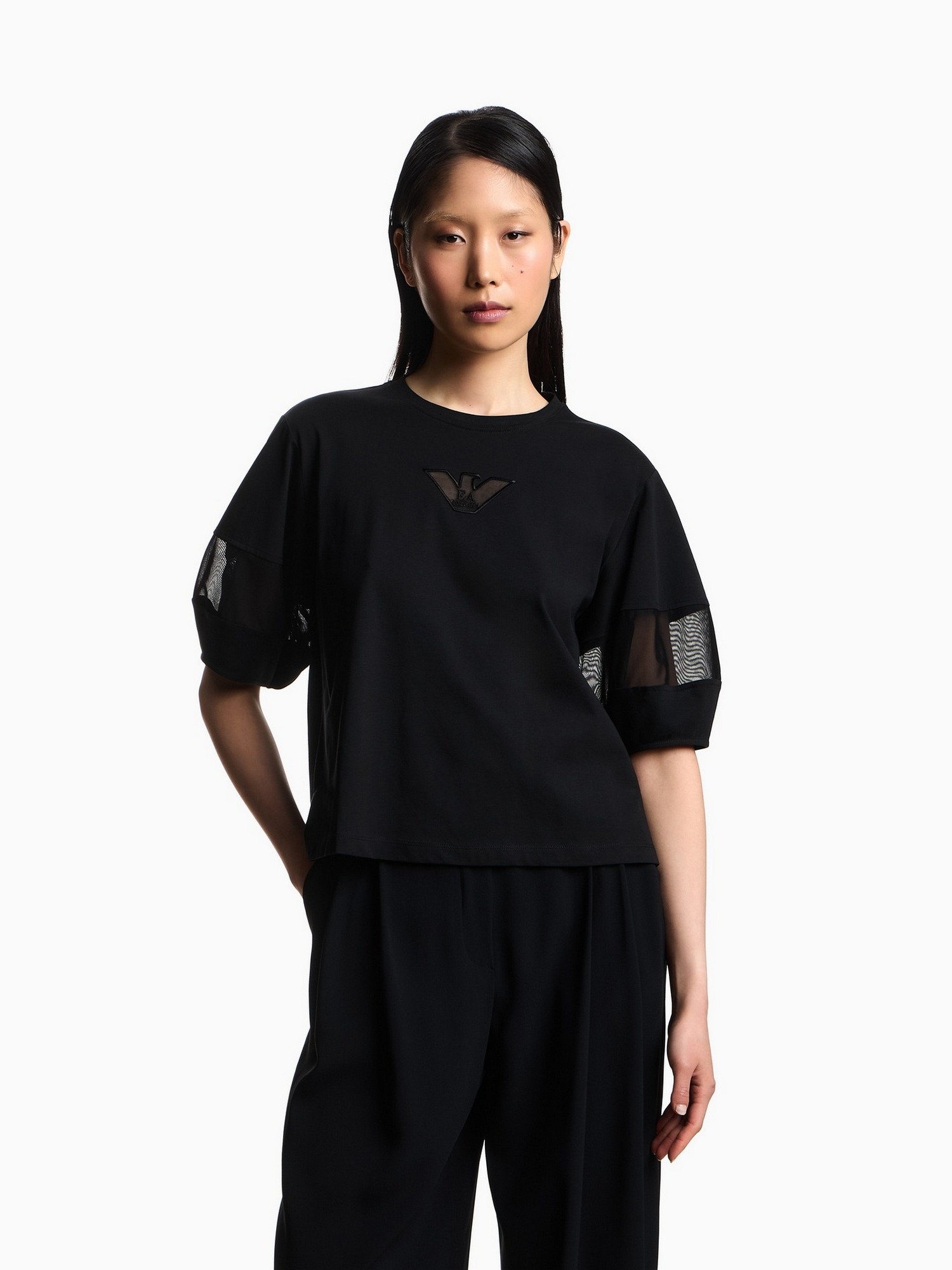 T-shirt in jersey con inserti in mesh, scollo tondo, aquila frontale e fondo con spacchetti laterali.