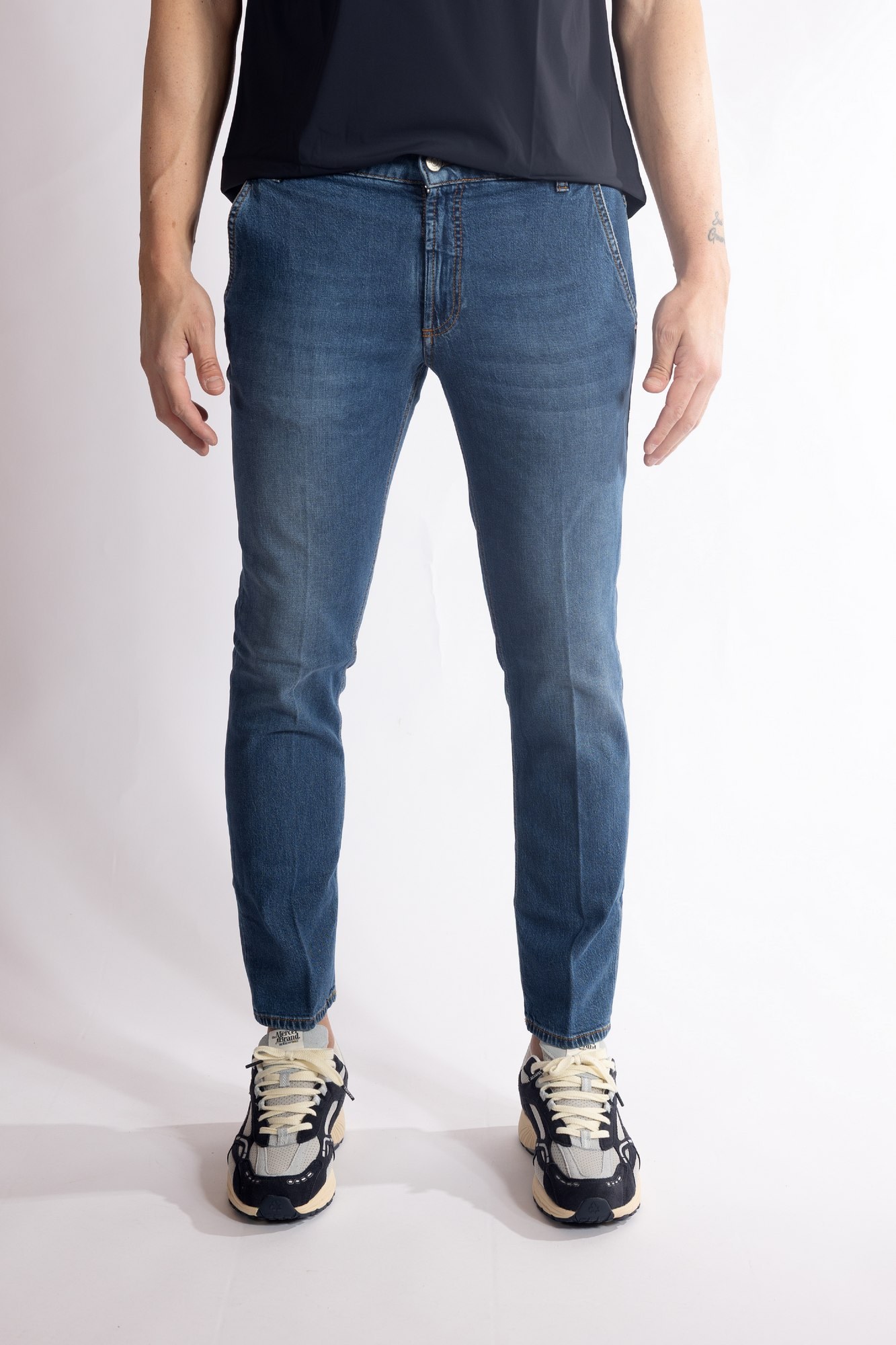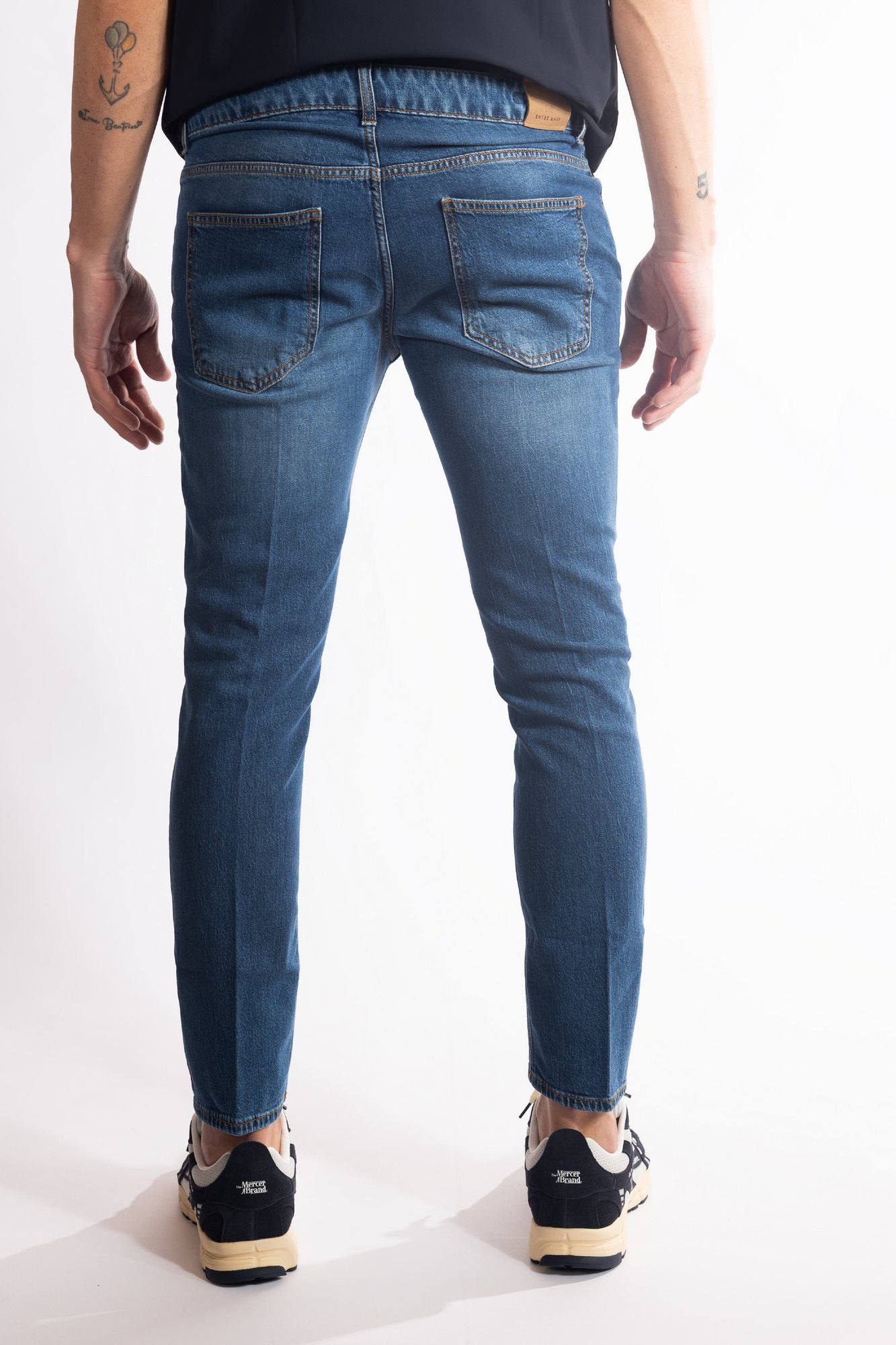 Jeans 5 tasche con gamba affusolata, chiusura frontale con bottone e zip e salpa in pelle sul retro con logo impresso.