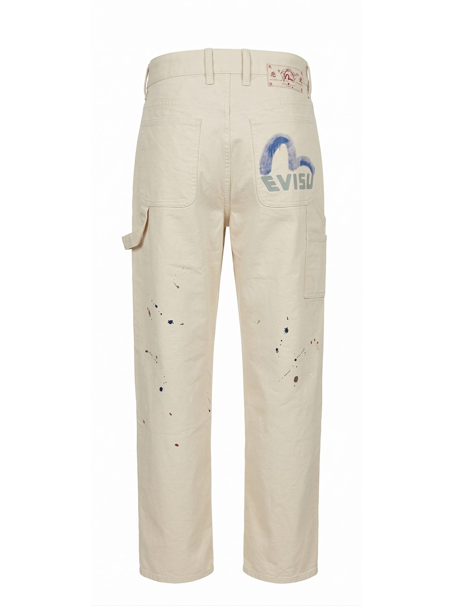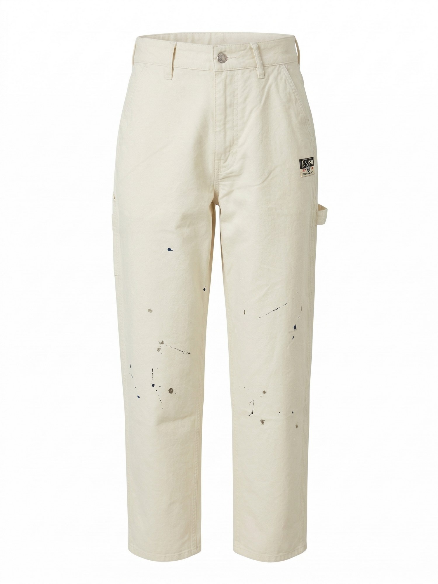 Pantaloni chino con tasche laterali, stampa pittura, patch posteriore e bottone personalizzato.