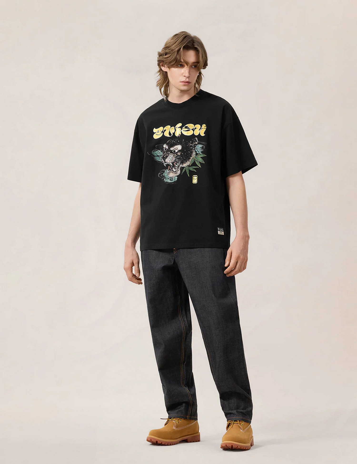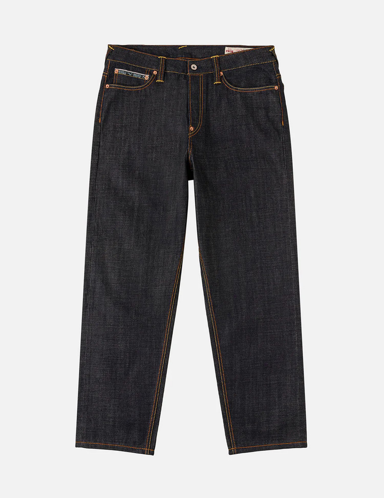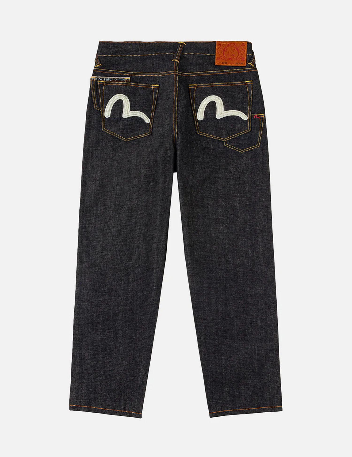 Jeans relax fit con cimosa di alta qualità, 7 tasche, ricamo Seagull, patta con cerniera e chiusura a bottone.