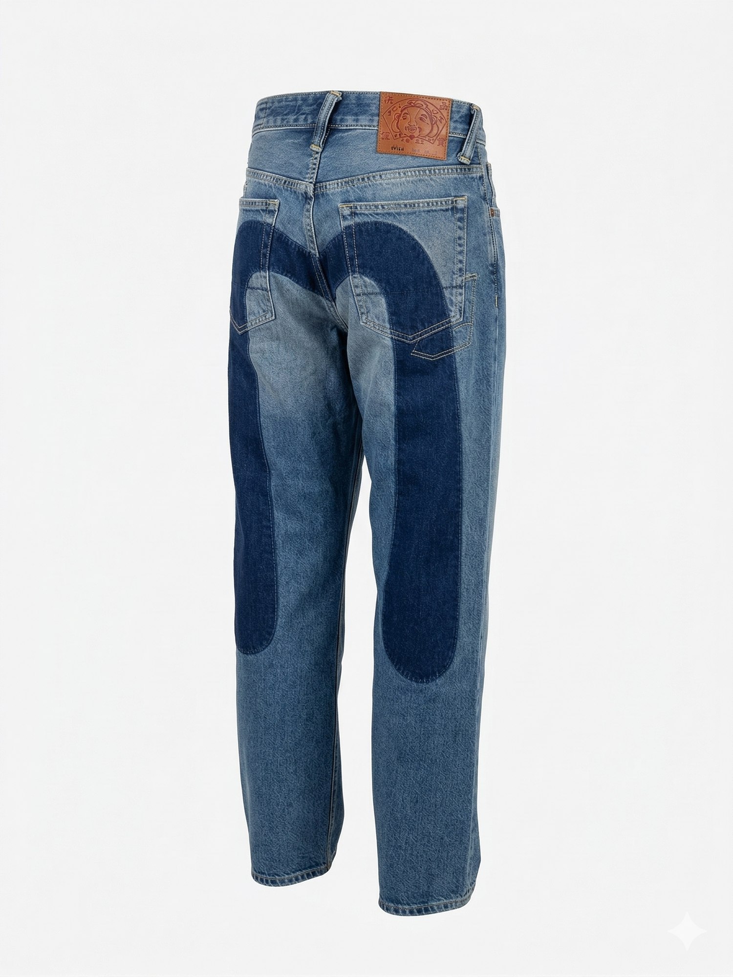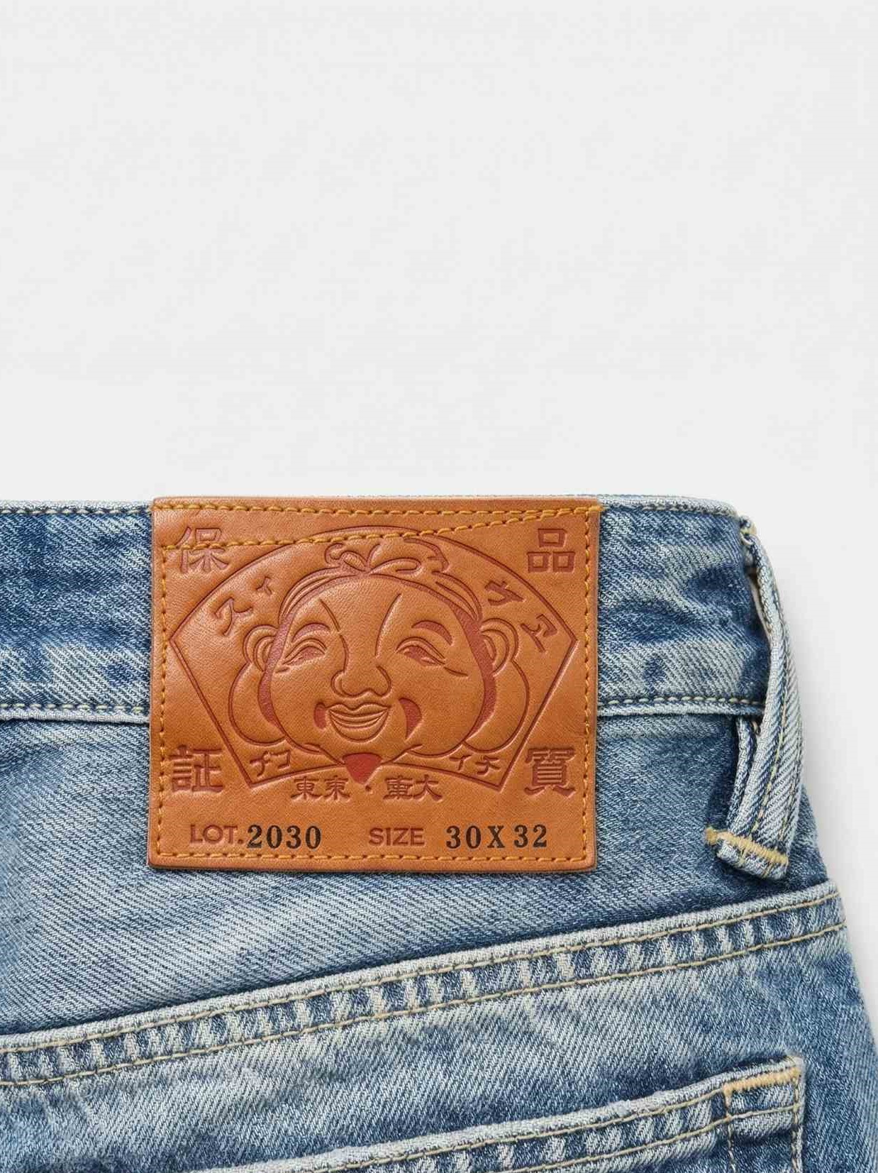 Jeans in lavaggio indaco medio con effetto "vissuto" con applicazione posteriore a contrasto scuro, patch in pelle e bottoni personalizzati.