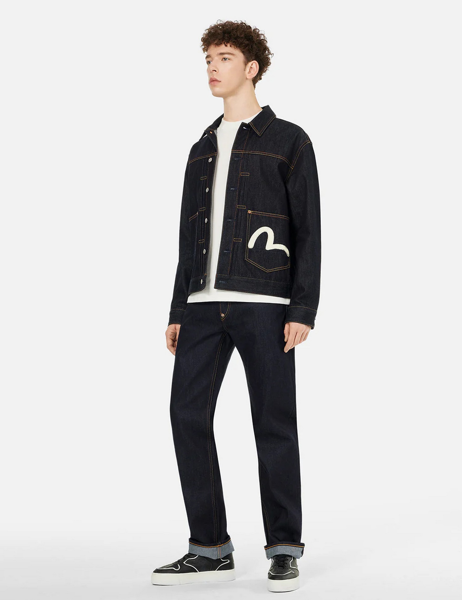 Giacca in denim relax fit con stampa gabbiano sulla tasca, cuciture a contrasto, 2 tasche e patta con bottoni.