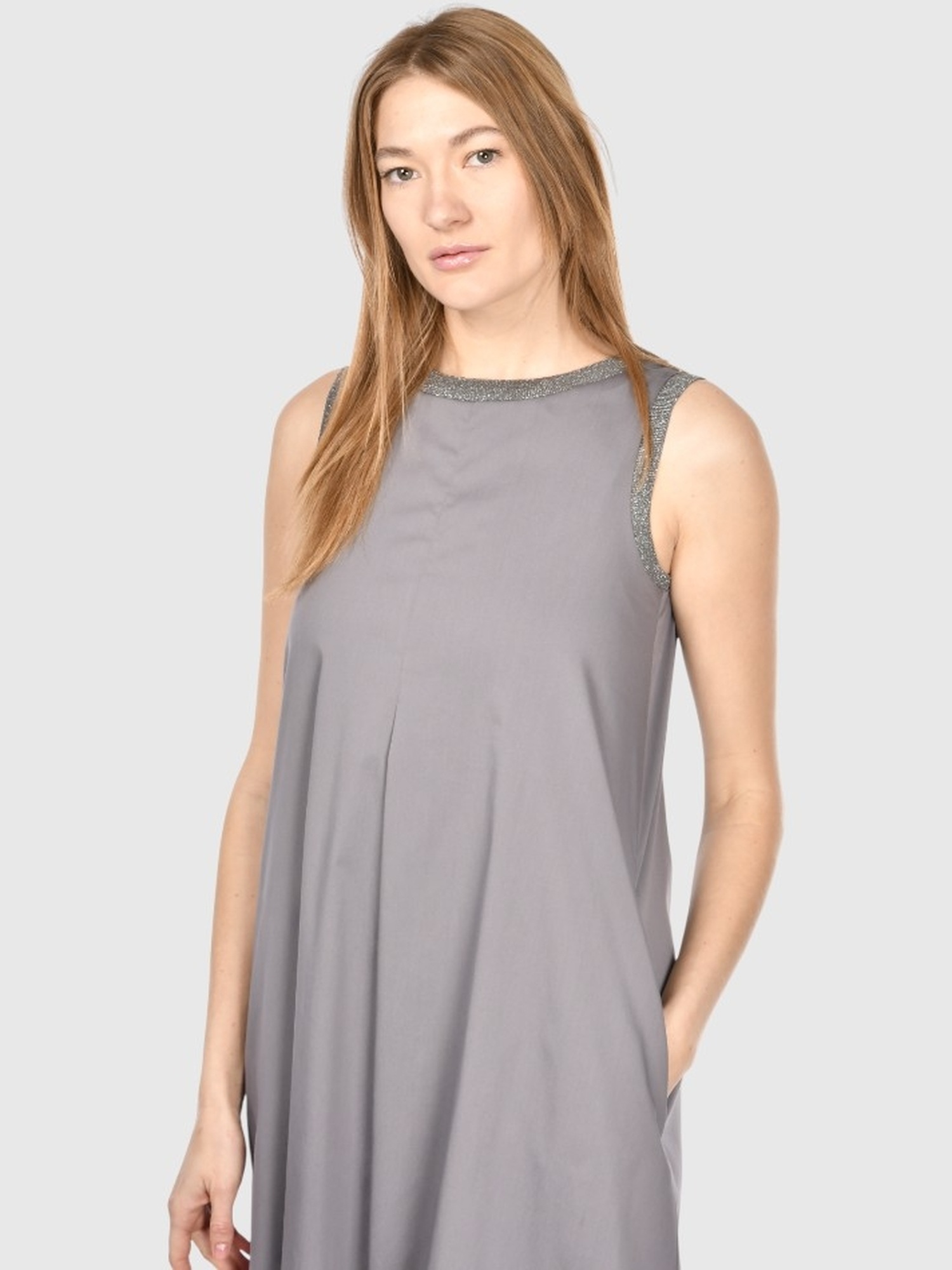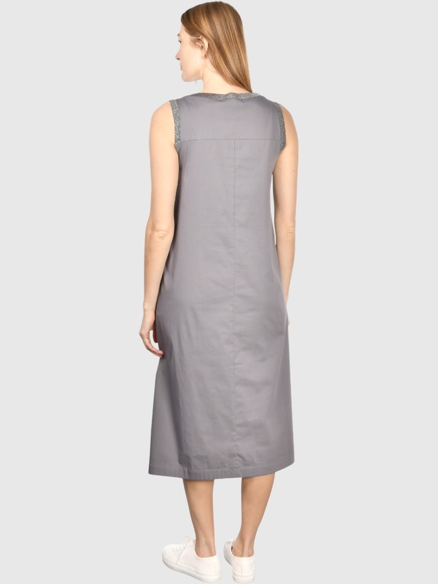 Abito midi senza maniche in cotone stretch con dettagli in lurex su scollo e giromaniche.