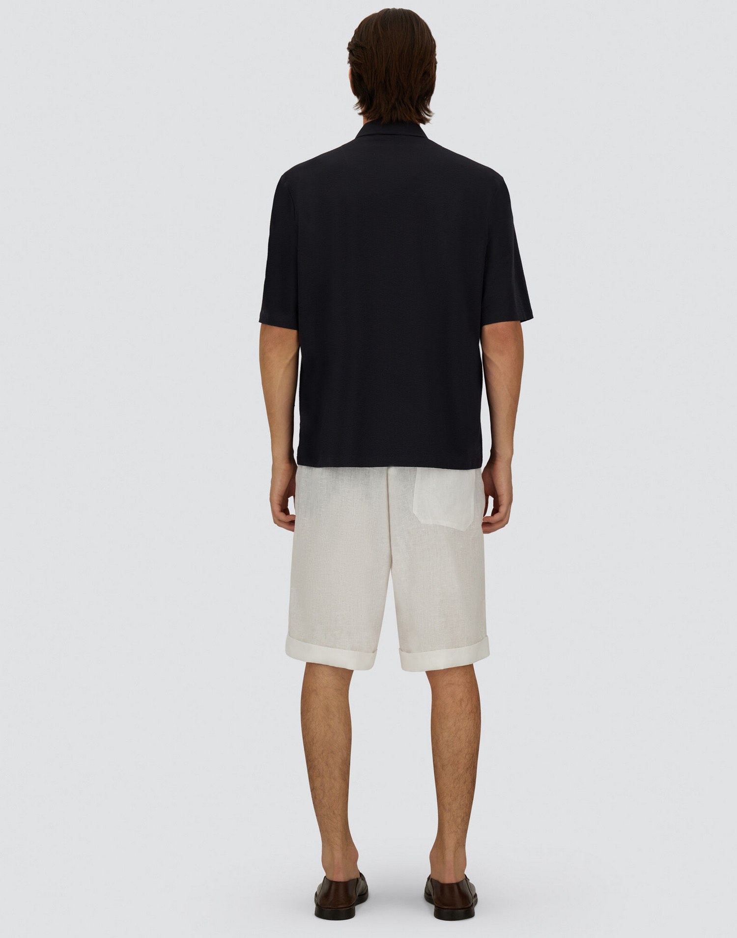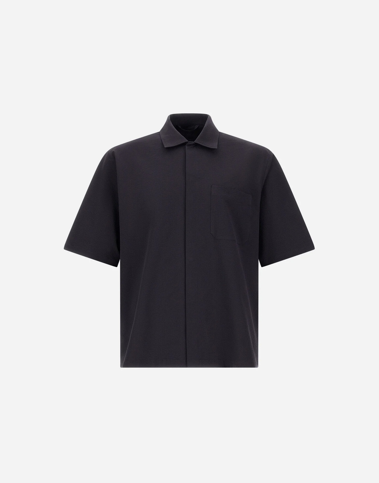 Camicia in seersucker tecnico stretch con colletto alla francese, taschino sul petto, chiusura nascosta con bottoni e spacchetti sui lati.