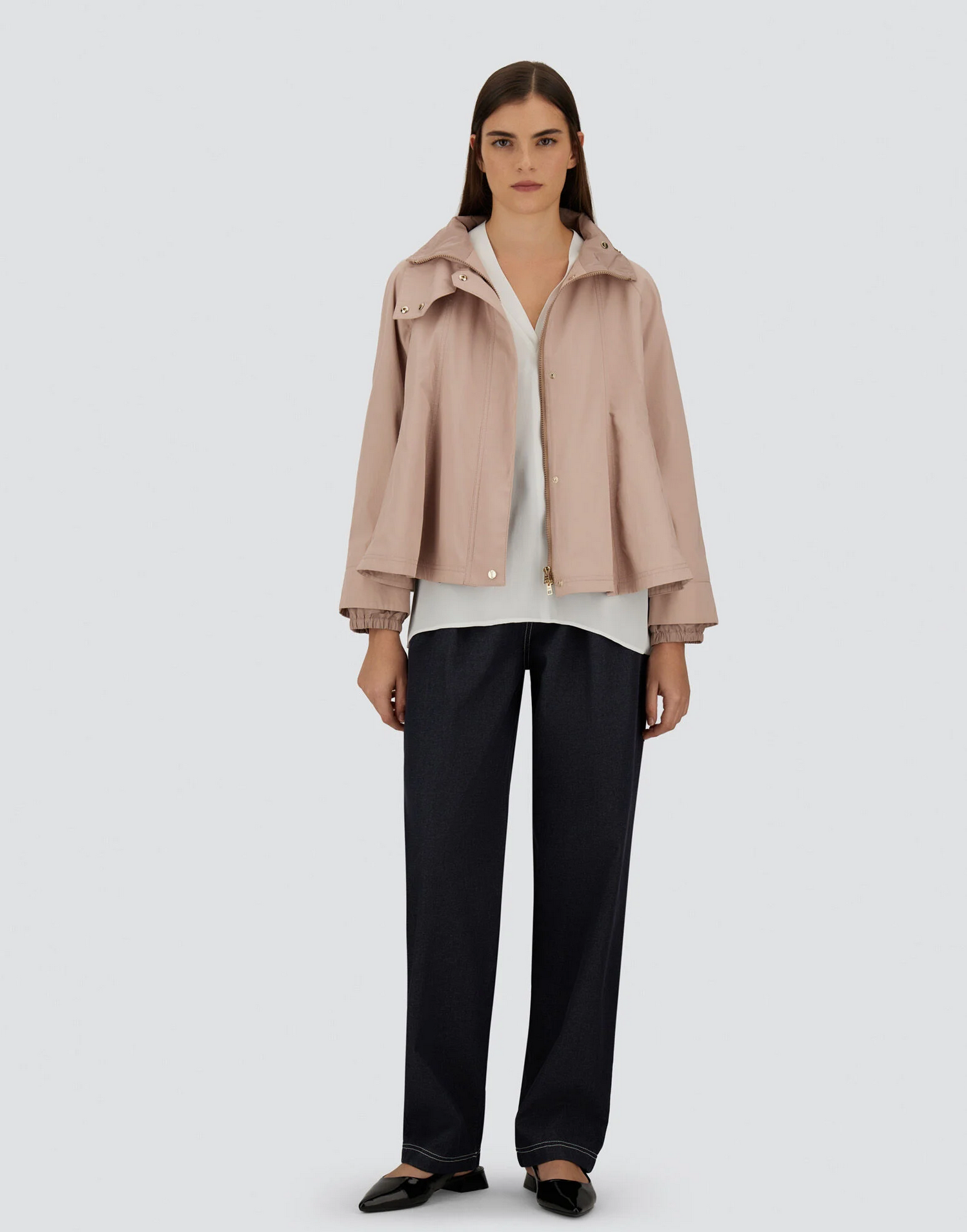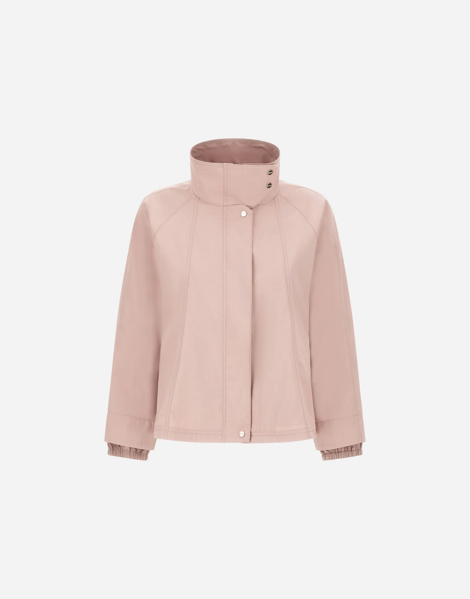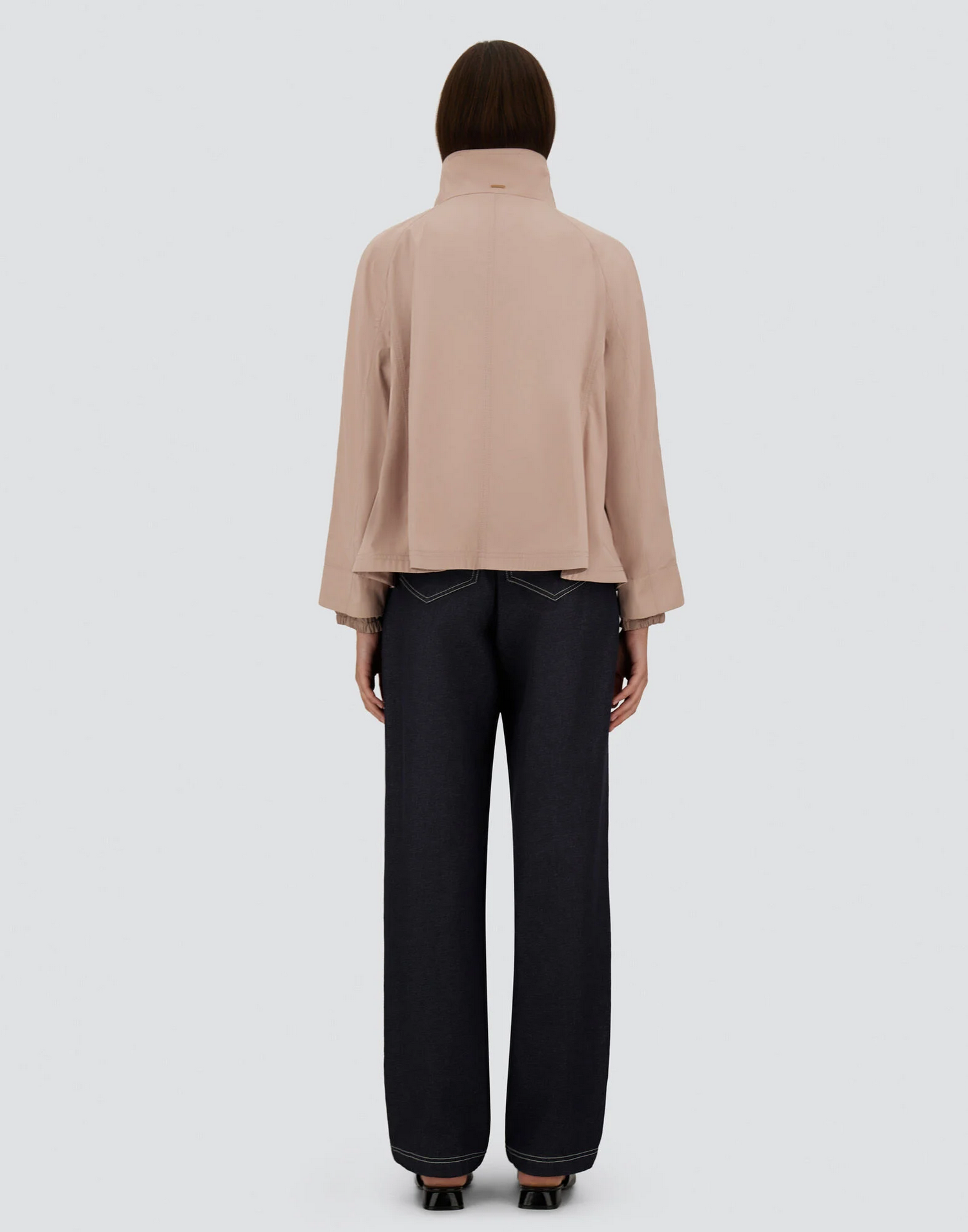 Cappa in gabardina di cotone finissaggio antigoccia, collo alto, tasche a filetto, logo Herno in metallo sul retro e chiusura con bottoni a pressione e zip coperta.