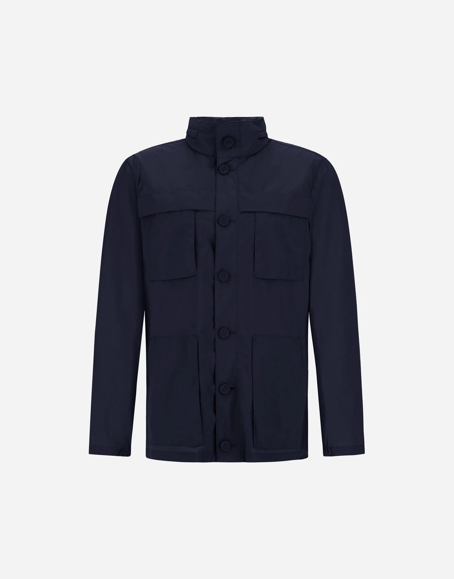 Field jacket in nylon con cappuccio impacchettabile, collo alto, logo Herno in metallo sul retro e chiusura con bottoni.