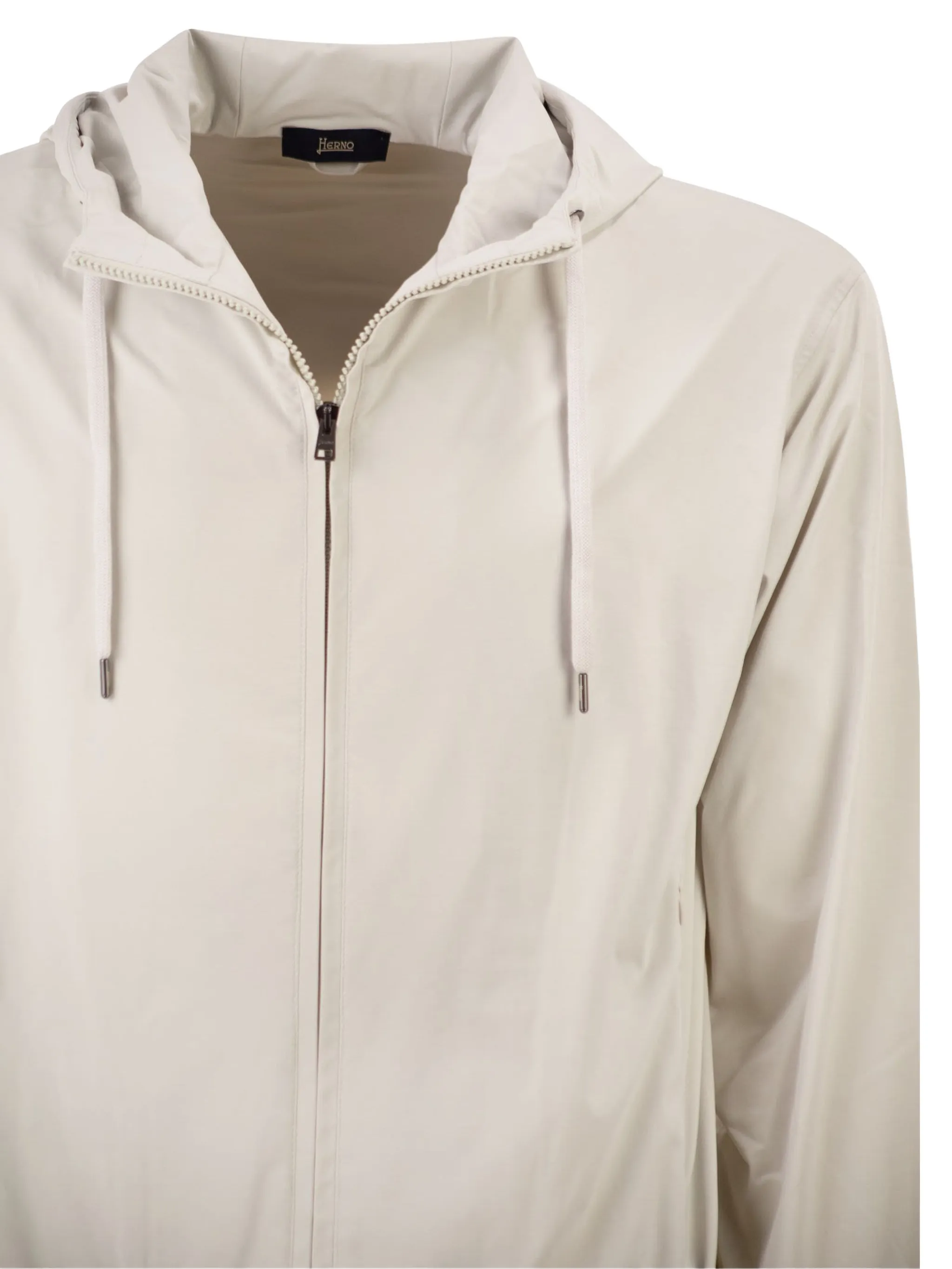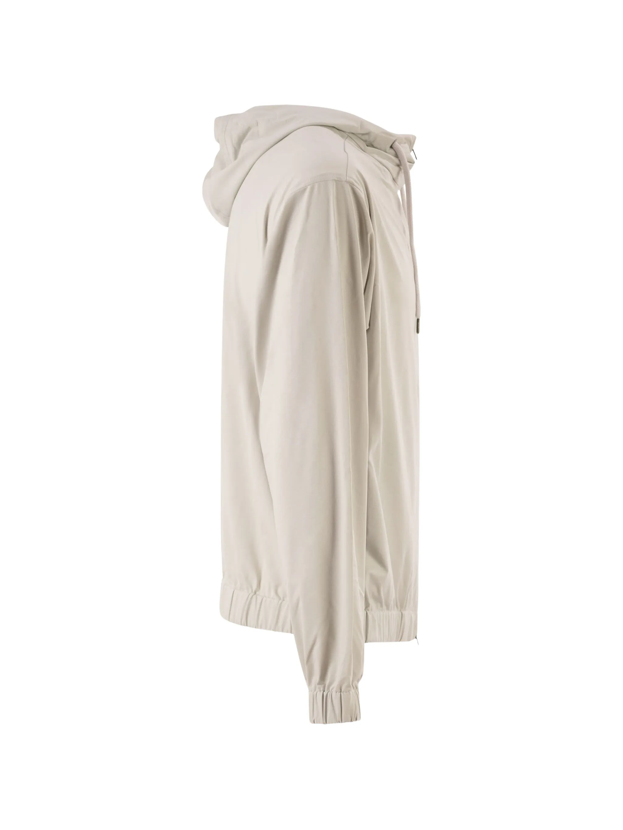 Giacca con vita elasticizzata, cappuccio con coulisse, chiusura con zip a doppio cursore e tasche a filetto.