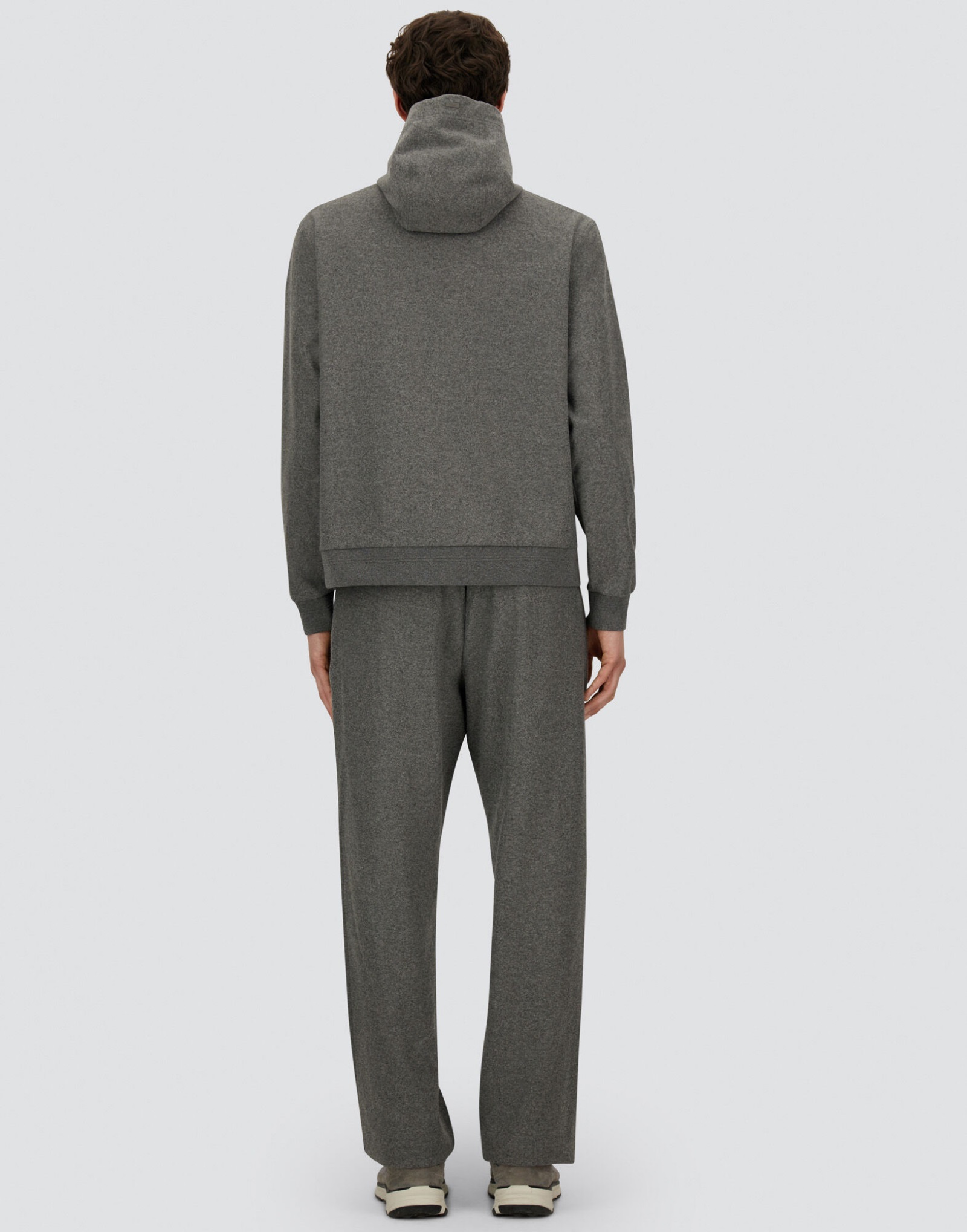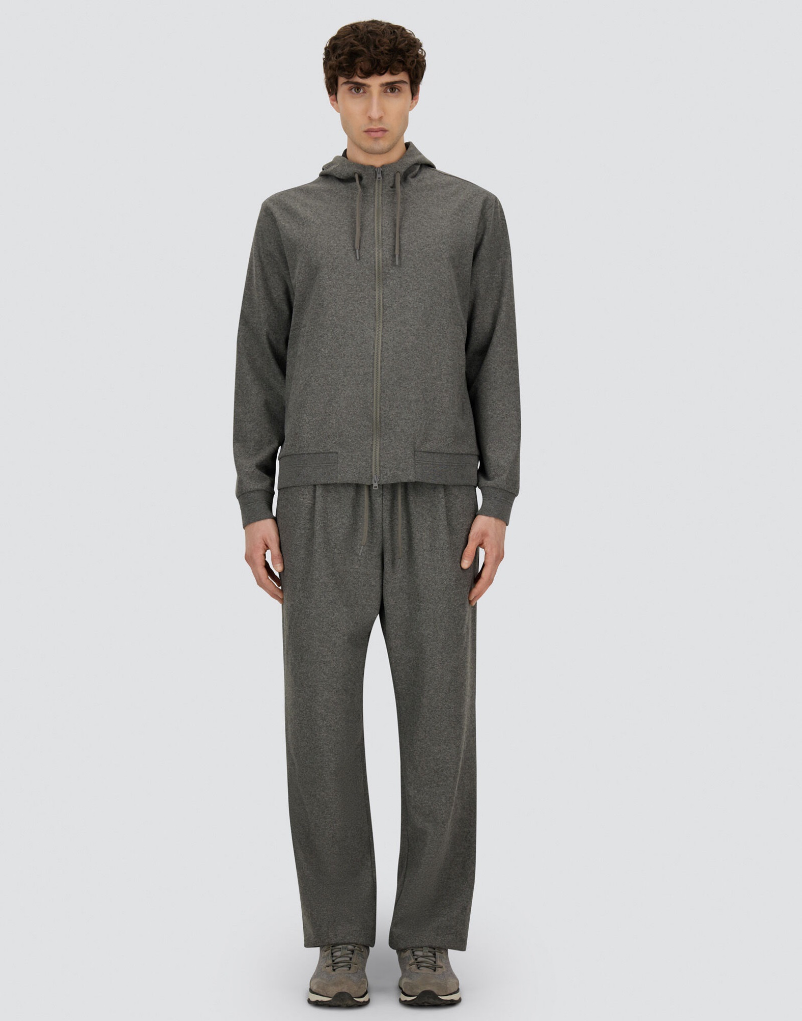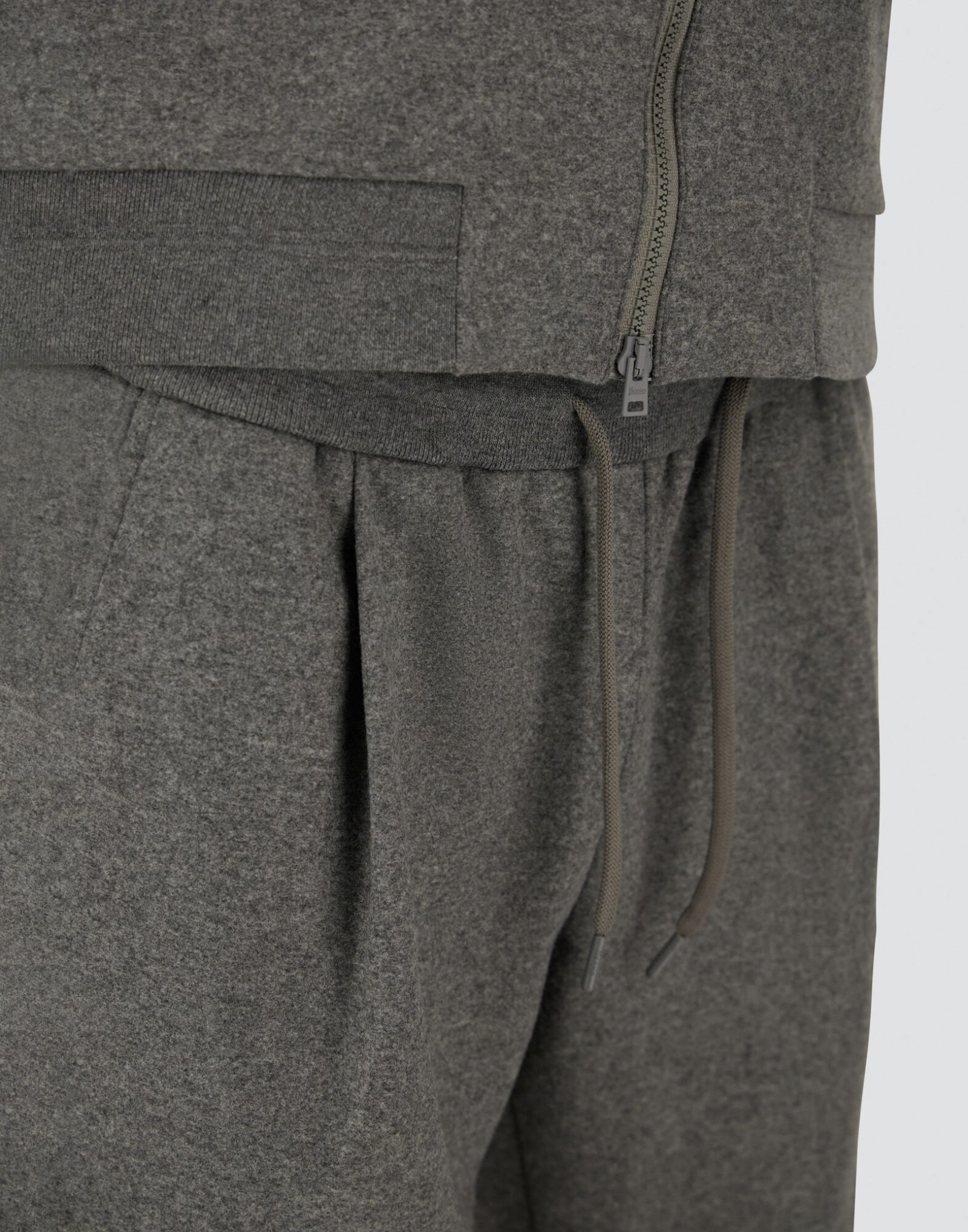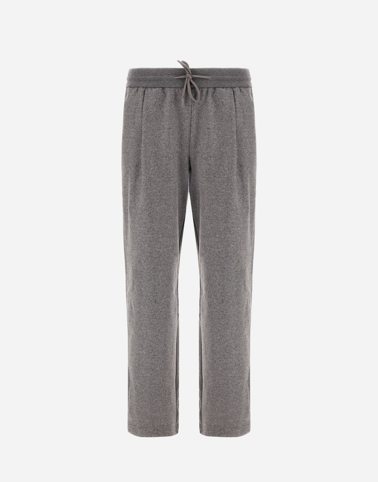 Pantaloni in jersey doppio strato con effetto garzato sul lato dritto tinto in filo, elastico con coulisse in vita, pinces, tasche sui fianchi e tasche a filetto con bottone a pressione sul retro.