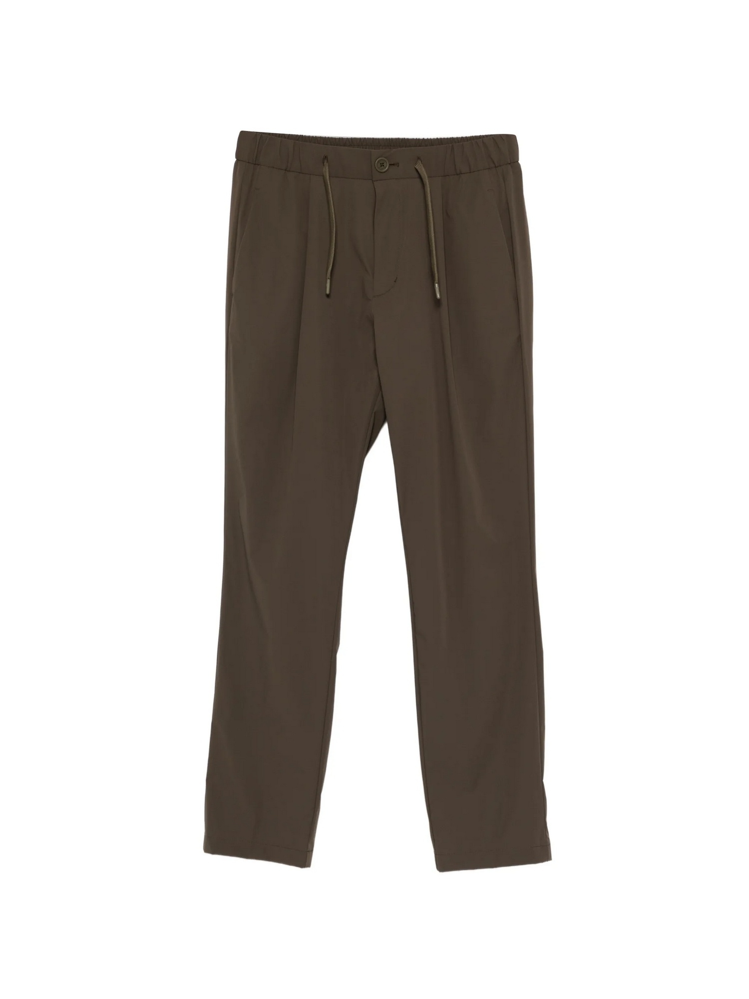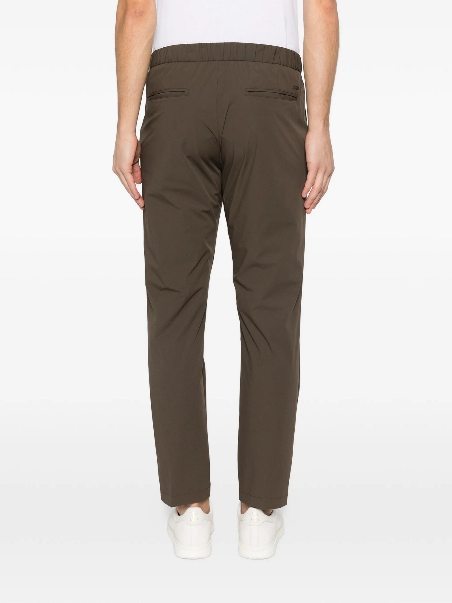 Pantaloni in nylon stretch con elastico con coulisse in vita, pinces, tasche sui fianchi, tasche a filetto sul retro, patch Herno sul retro e chiusura con bottone e zip nascosta.