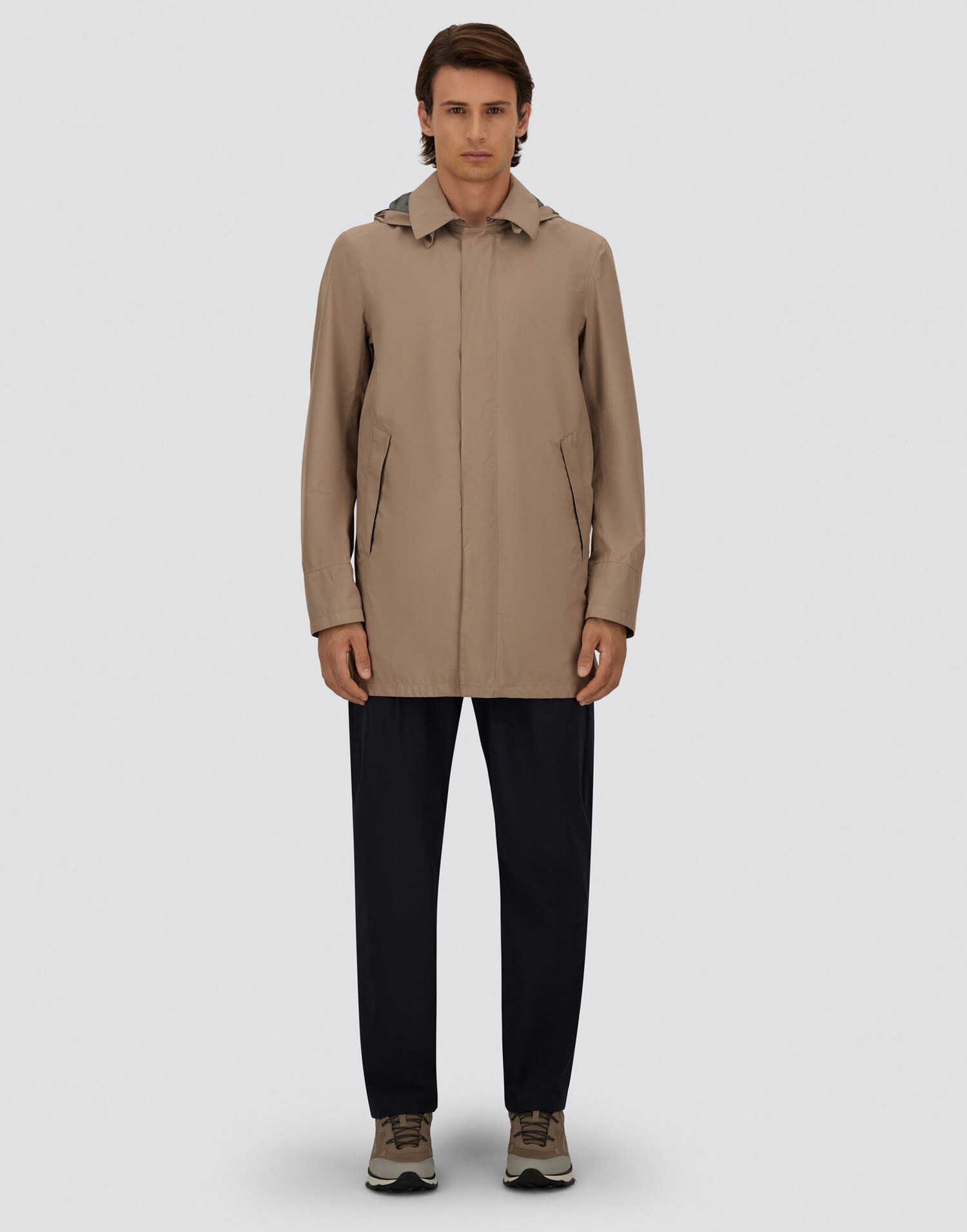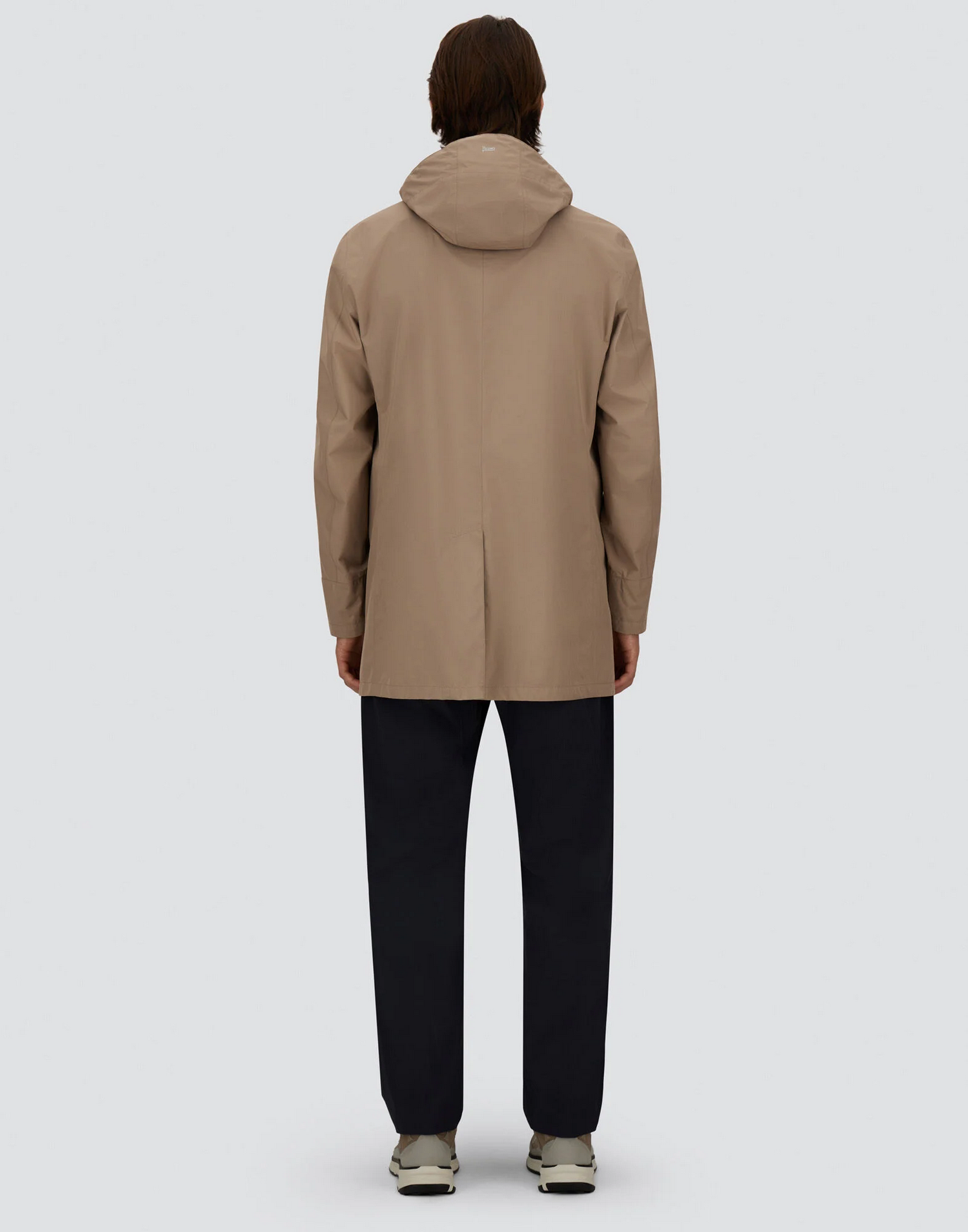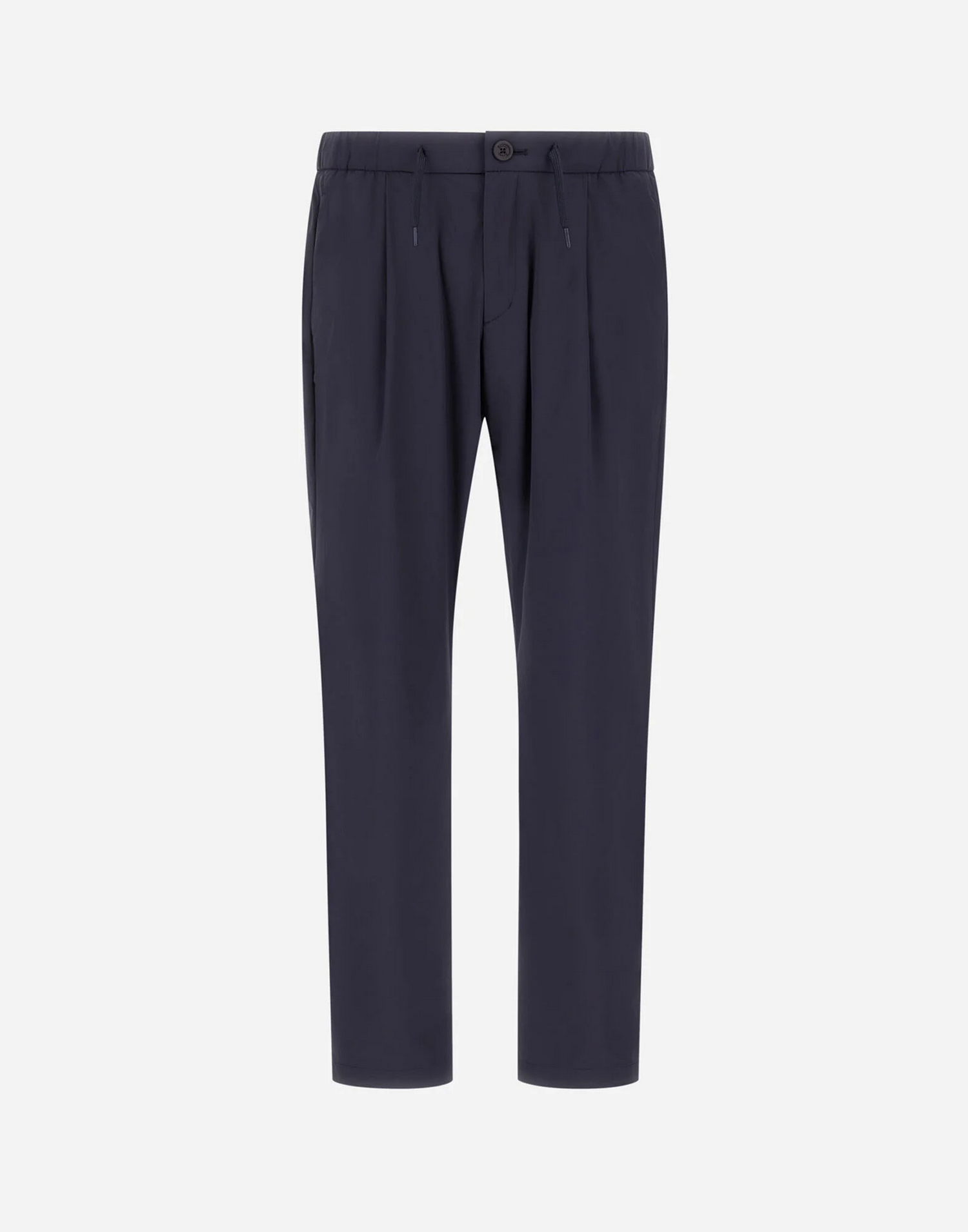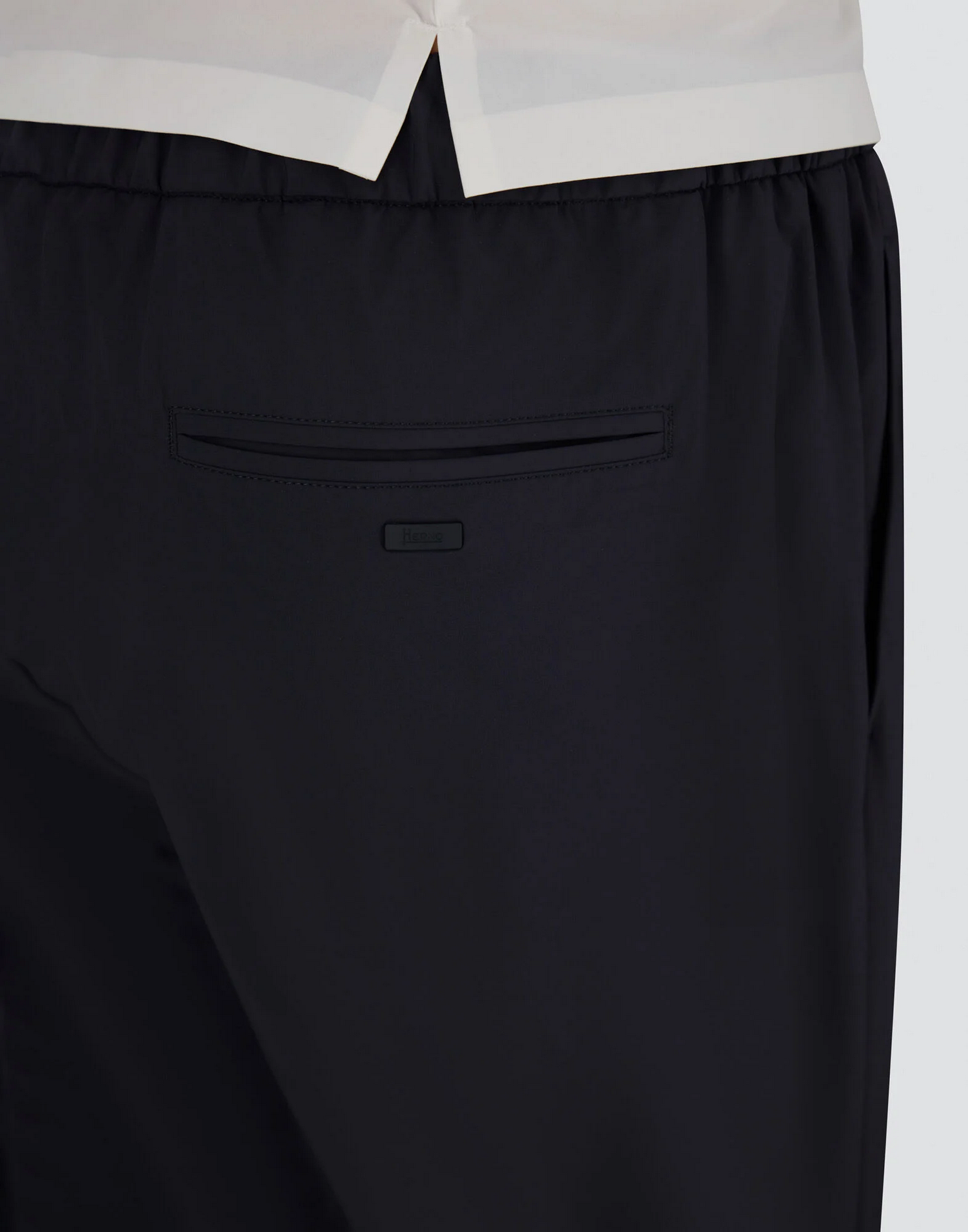 Pantaloni in nylon stretch con elastico con coulisse in vita, pinces, tasche sui fianchi, tasche a filetto sul retro, patch Herno sul retro e chiusura con bottone e zip nascosta.