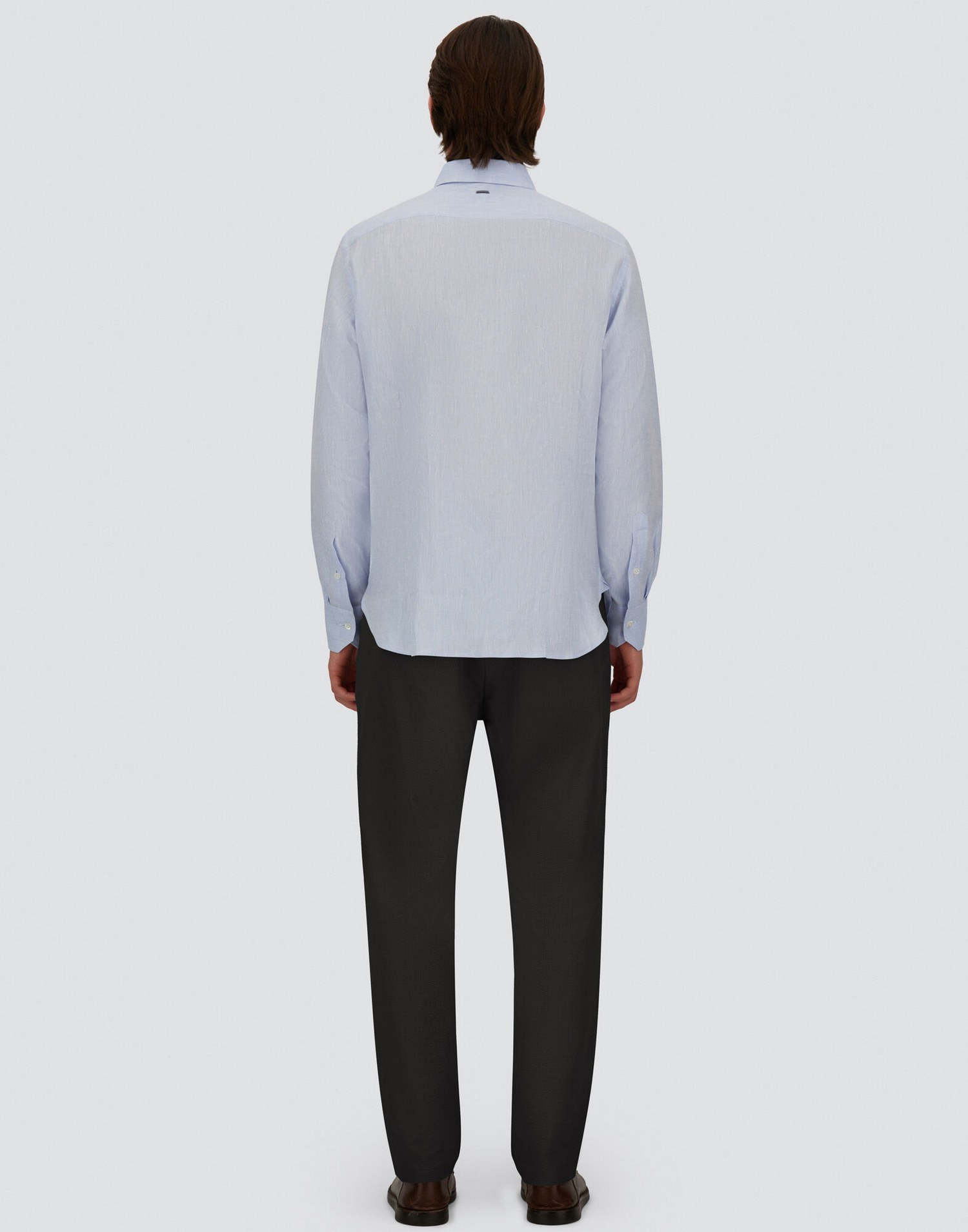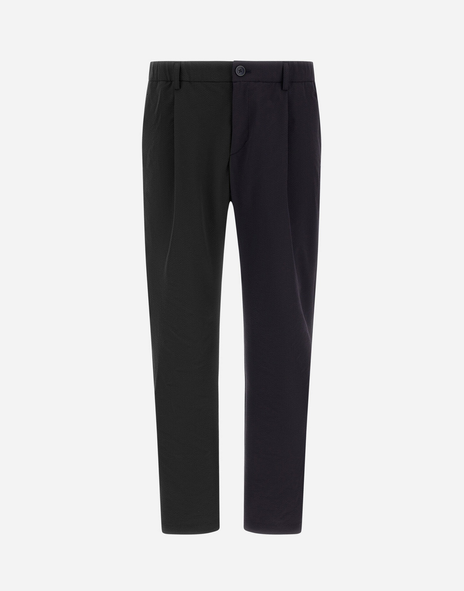 Pantaloni in tessuto seersucker tecnico stretch con inserto elastico in vita con coulisse, pinces, tasche sui fianchi, tasche a filetto con bottone sul retro, logo Herno in metallo sul retro e chiusura con bottone e zip nascosta.