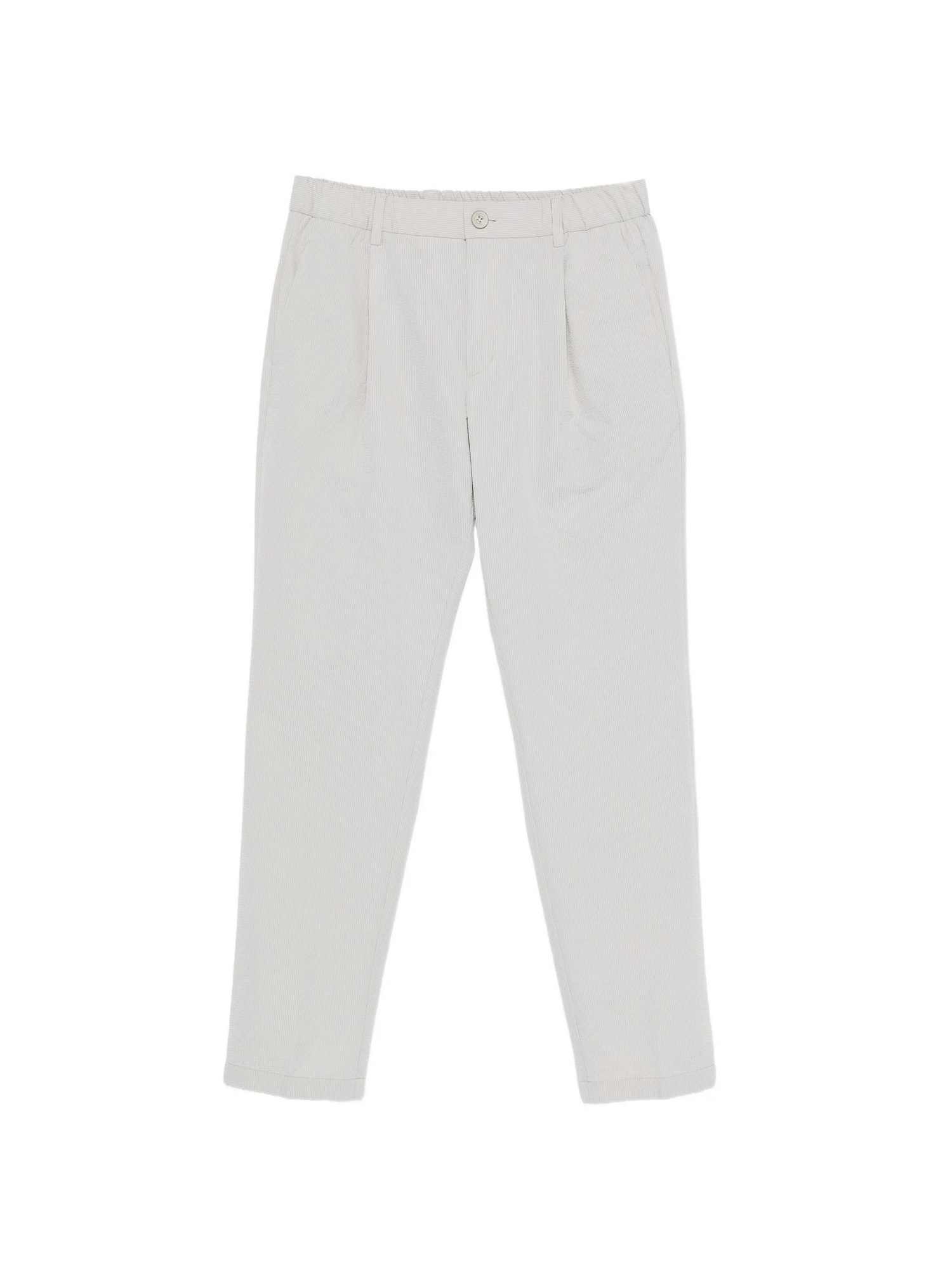 Pantaloni in tessuto seersucker tecnico stretch con inserto elastico in vita con coulisse, pinces, tasche sui fianchi, tasche a filetto con bottone sul retro, logo Herno in metallo sul retro e chiusura con bottone e zip nascosta.