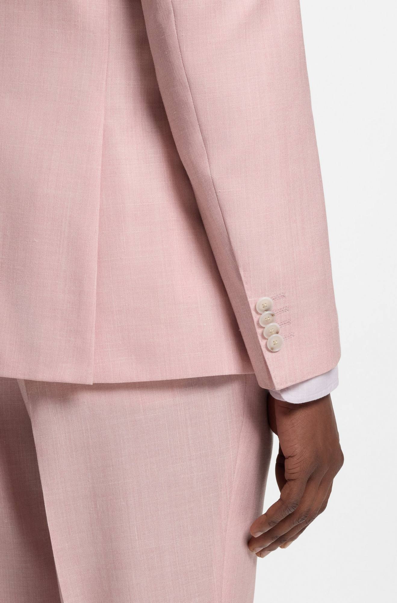 Giacca in lana, seta e lino con revers a punta, tasche con pistagna sul petto e polsini con bottoni.