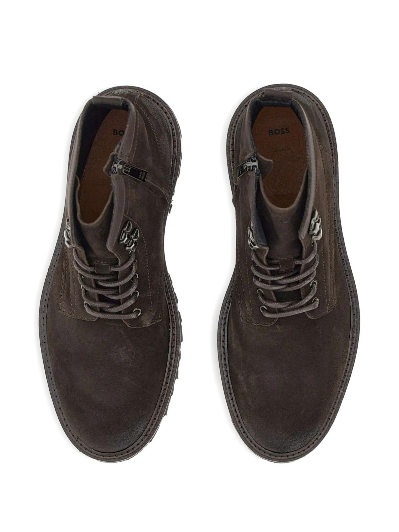 Stivali stringati in pelle, chiusura con lacci, chiusura laterale con zip, punta tonda e suola in gomma.