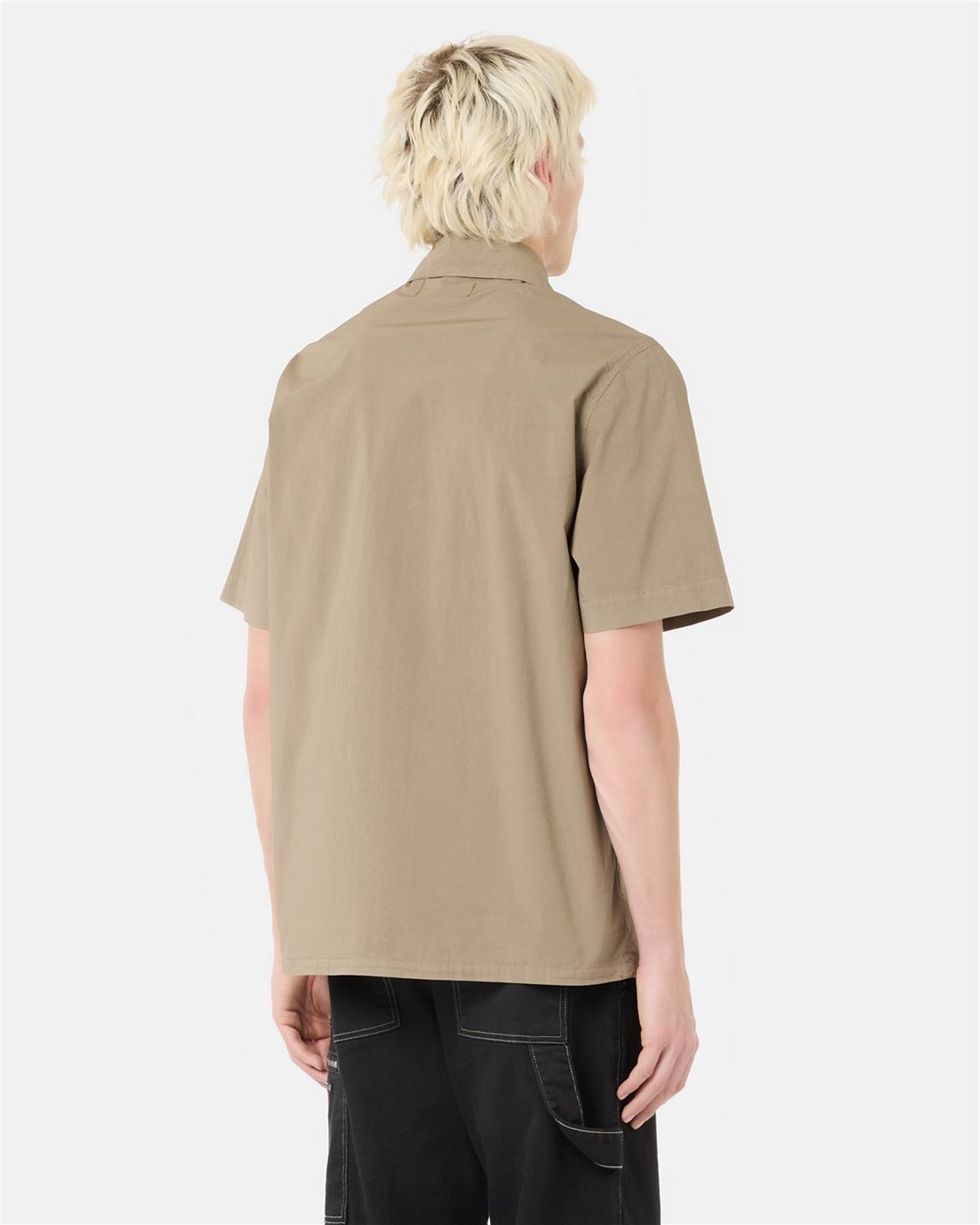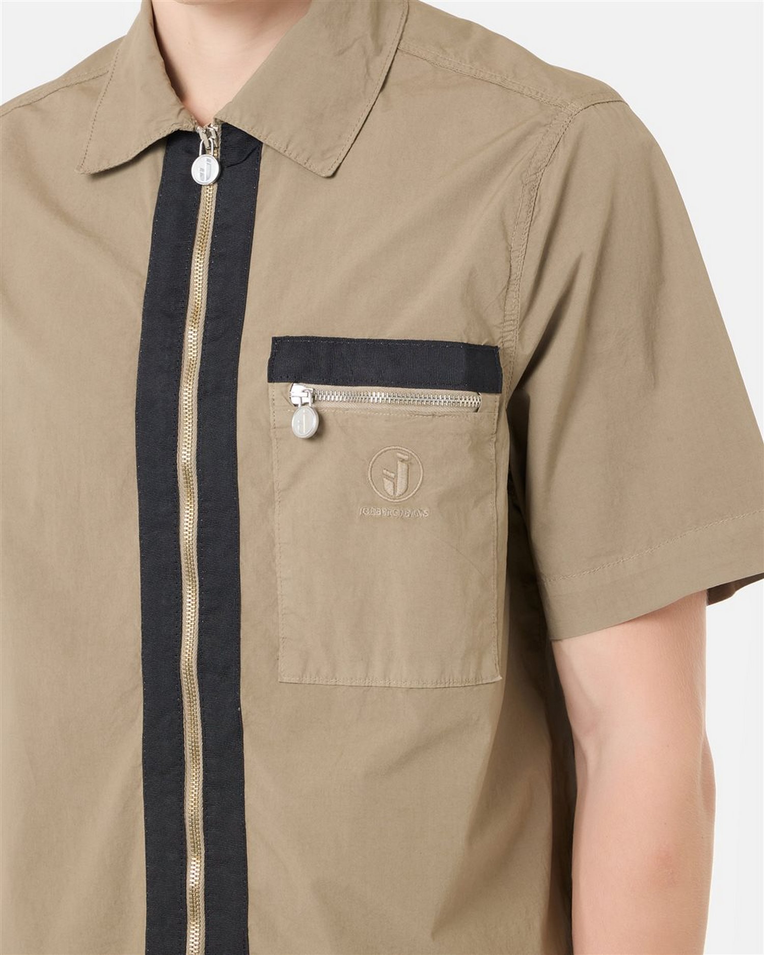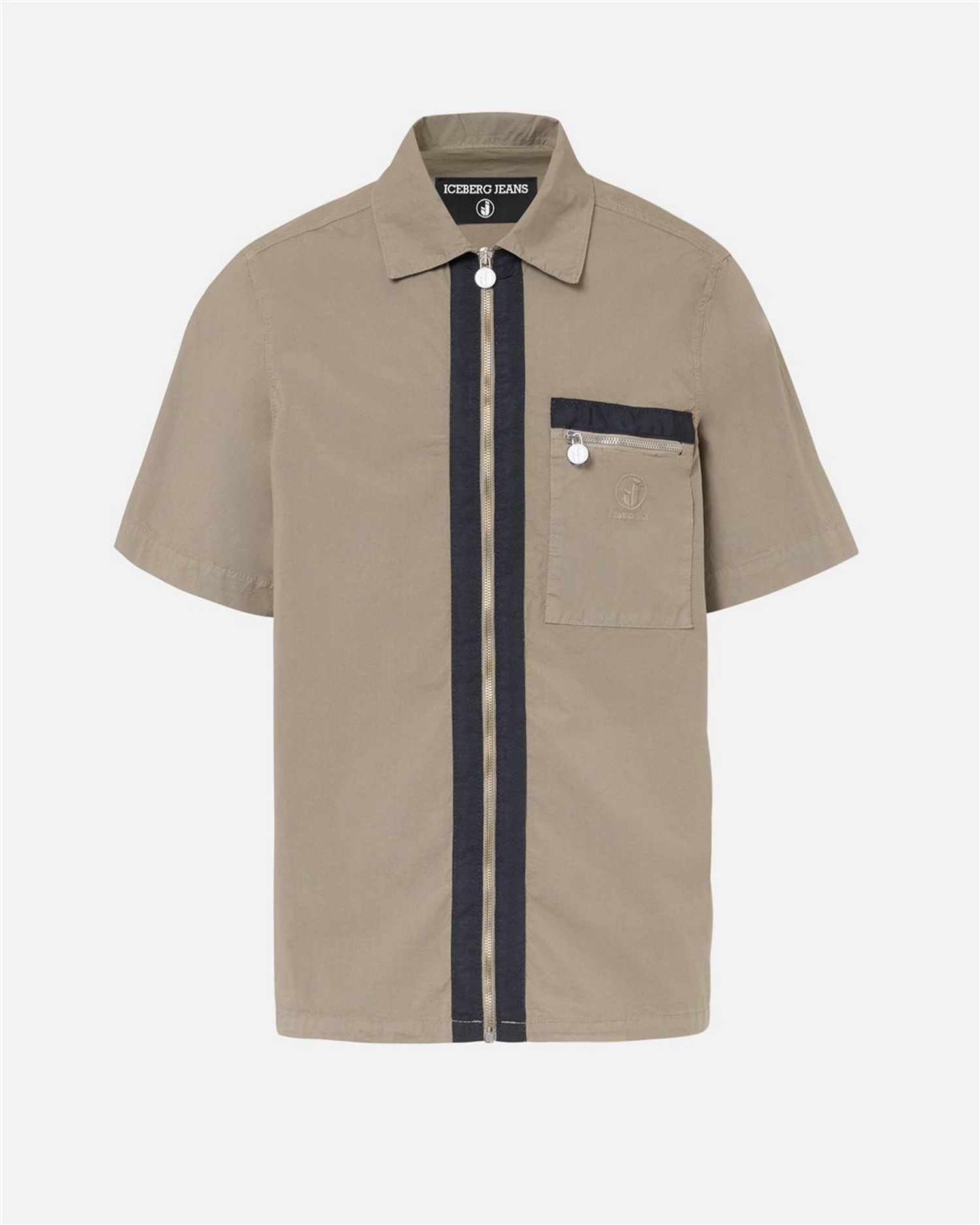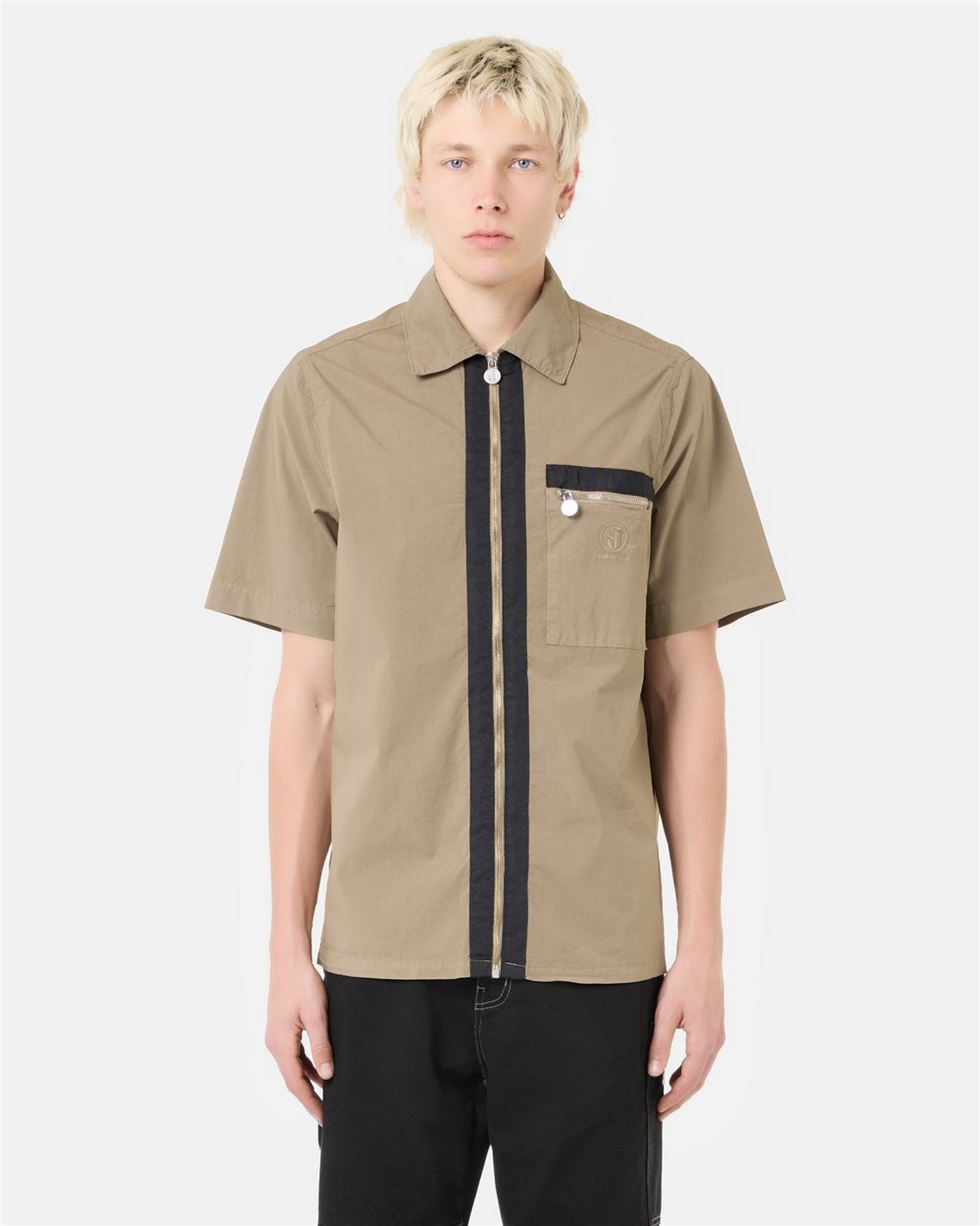 Camicia a maniche corte in tela paracadute con apertura centrale con zip metallica e tiretto logato, taschino a toppa sul petto sinistro, dotato di zip con tiretto logato e ricamo logo.