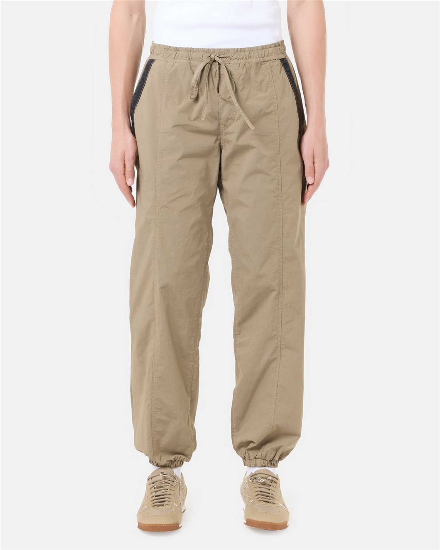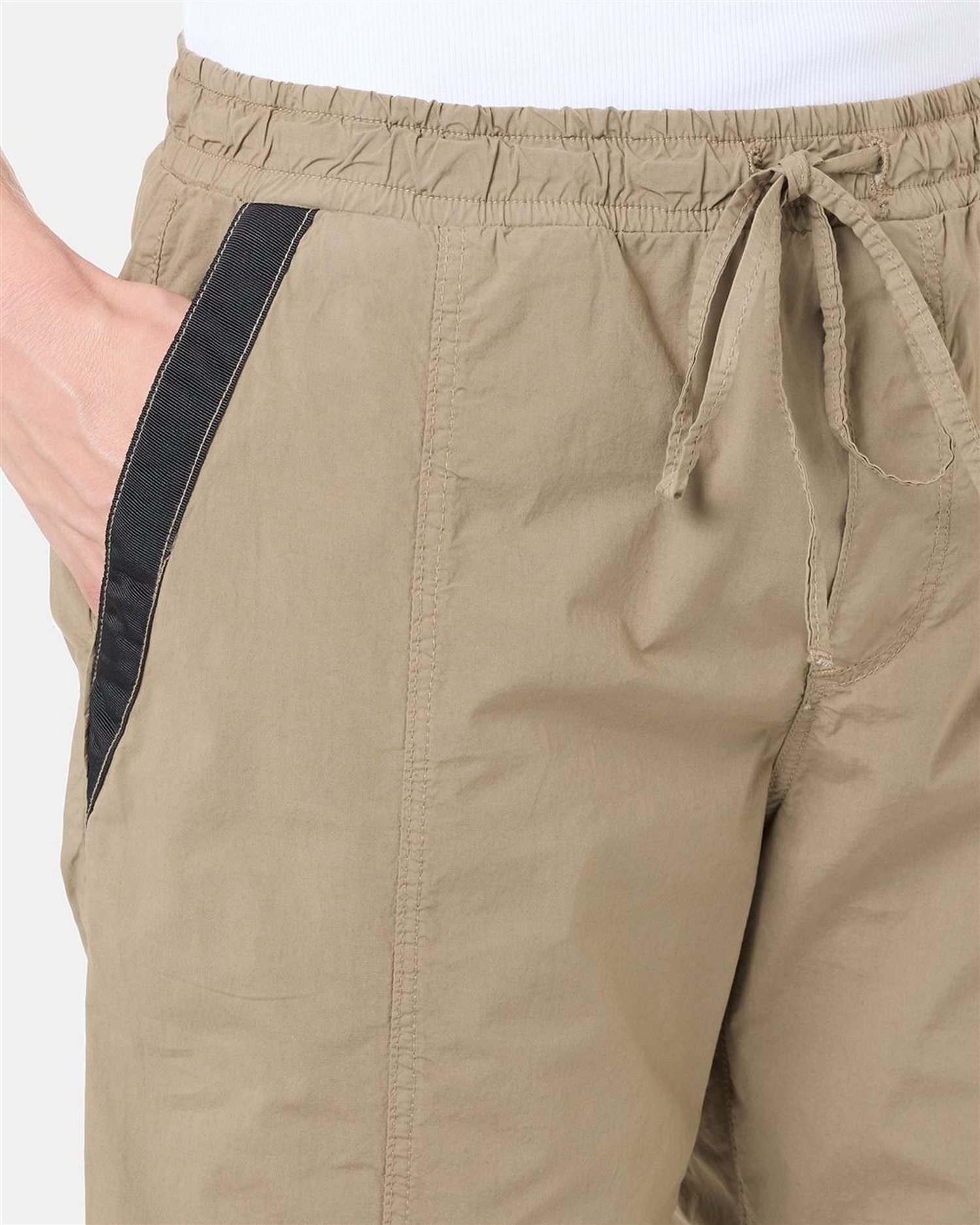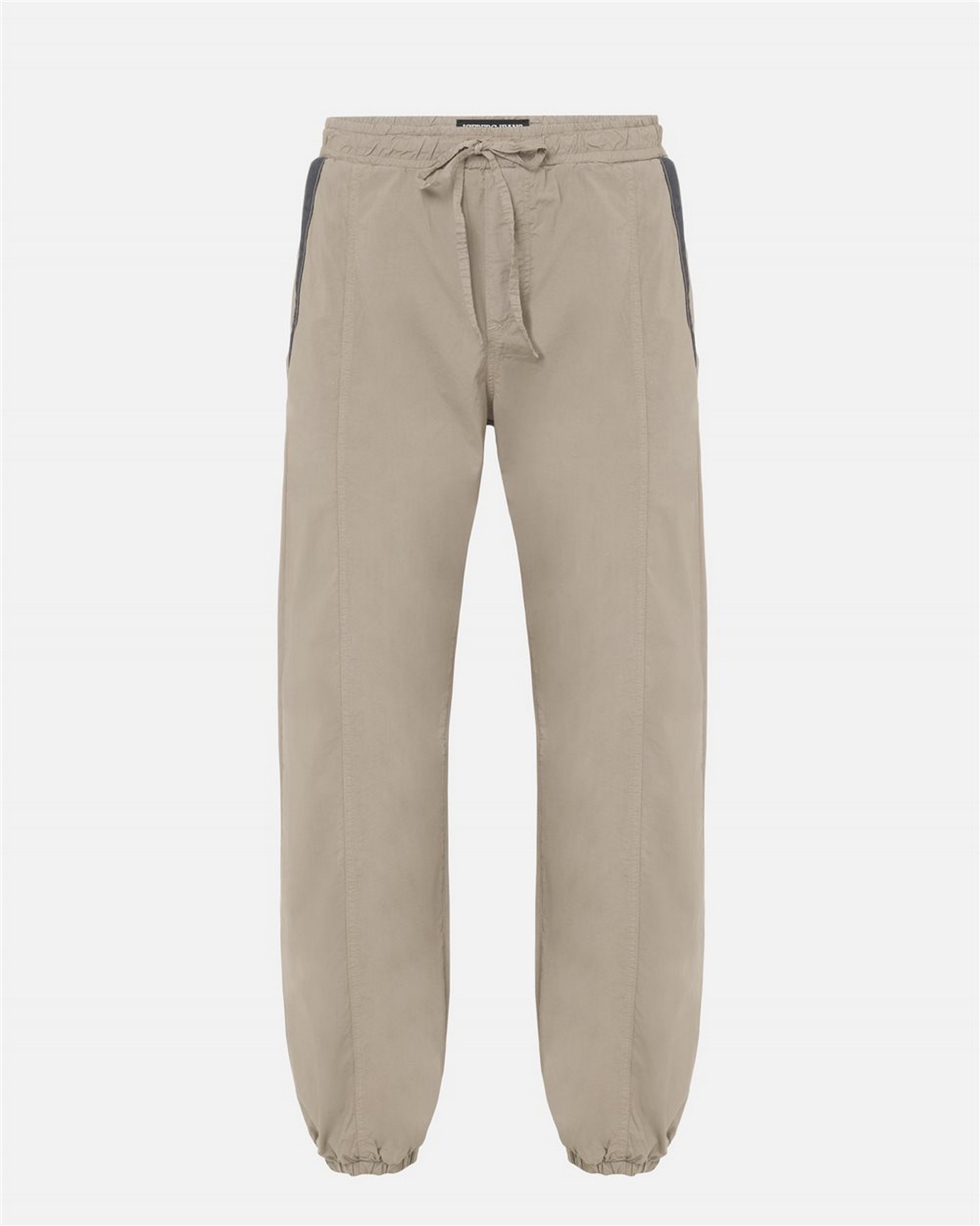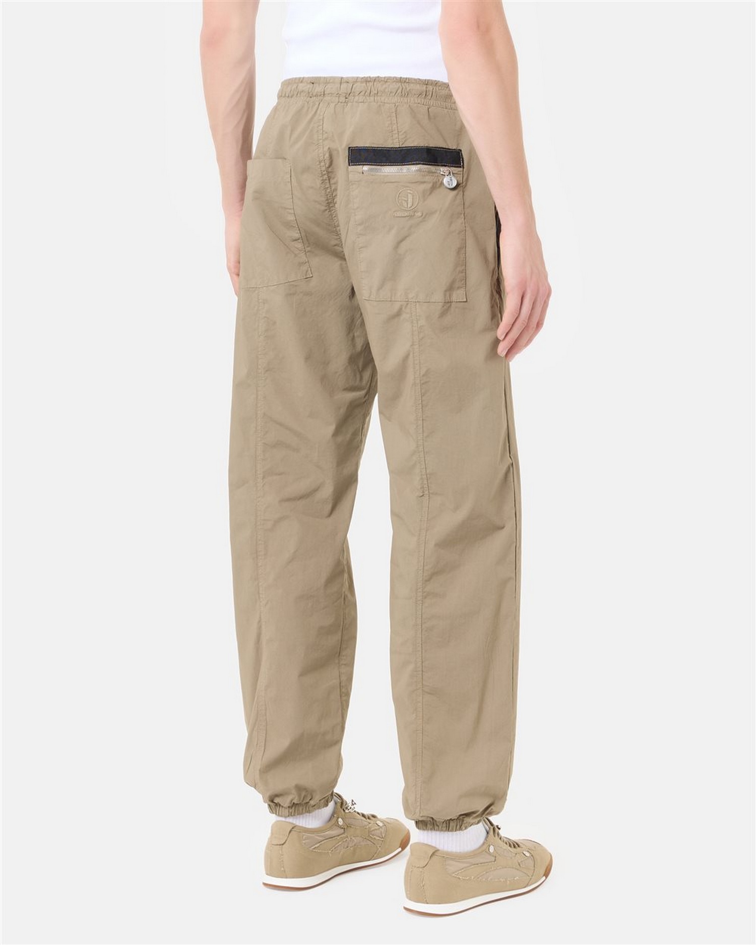 Pantaloni cargo in tela paracadute di cotone con vita con elastico interno, coulisse, tasche a toppa sul retro e tasca destra con zip metallica e tiretto logato.