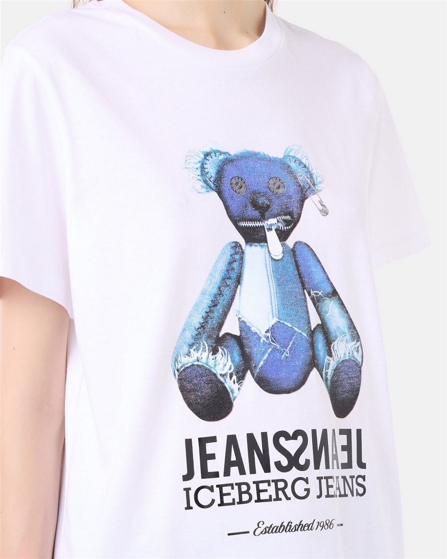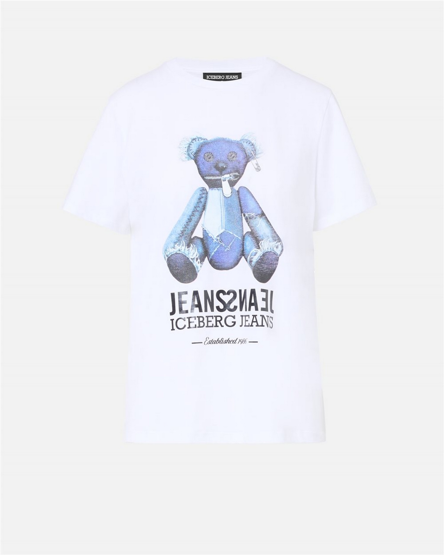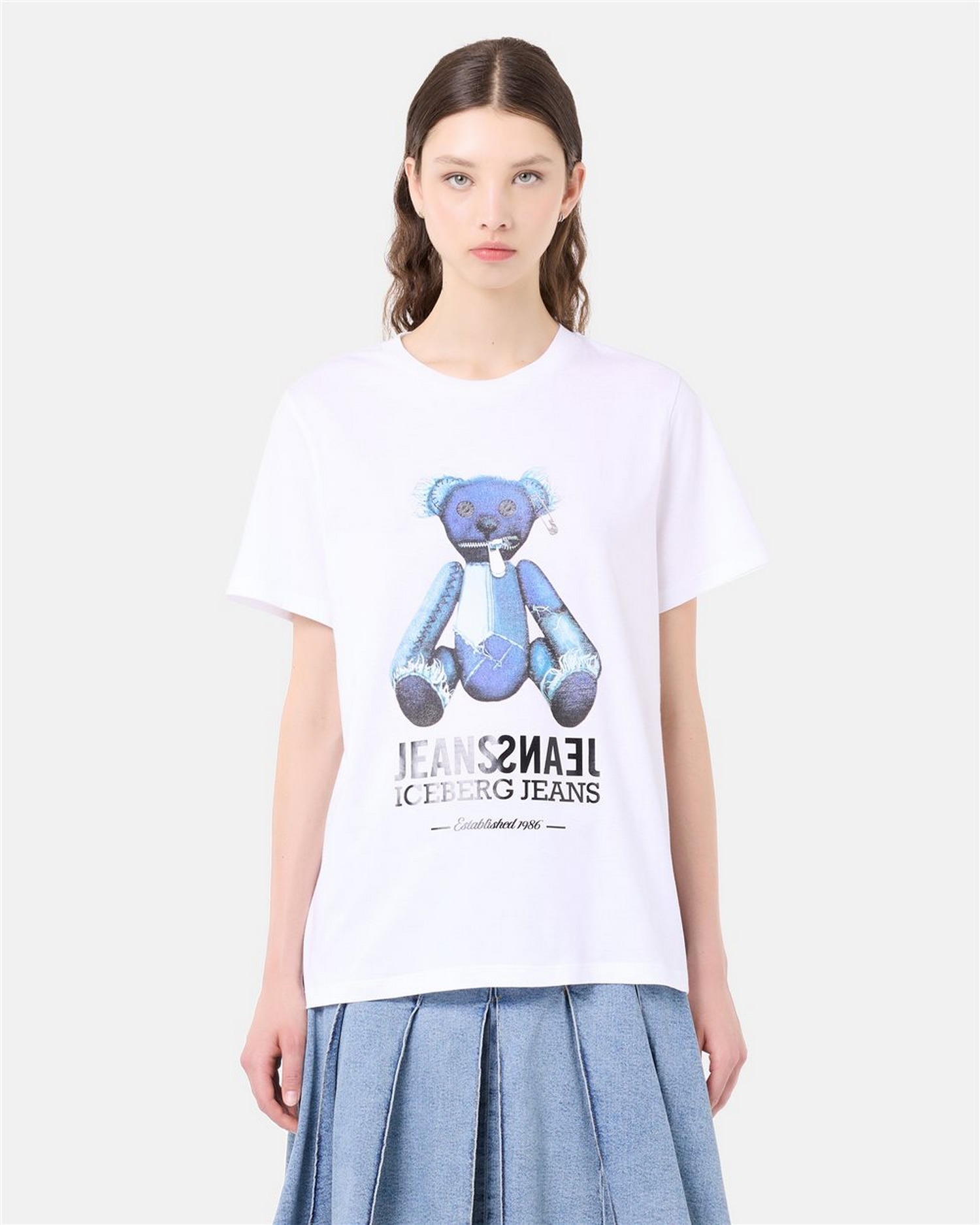 T-shirt in jersey di cotone con stampa Teddy Bear effetto denim posizionata al centro davanti con logo shiny.
