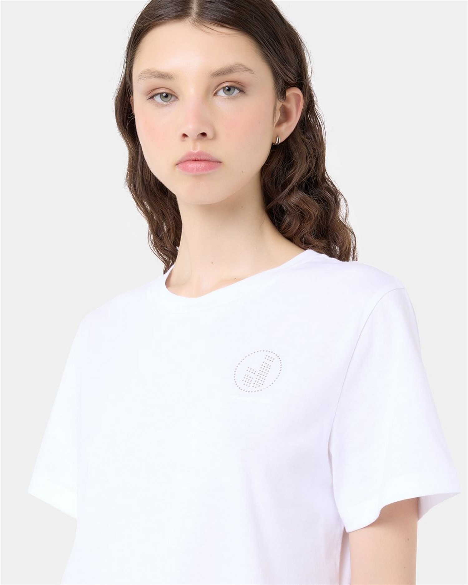 T-shirt in jersey di cotone con coulisse in primo tessuto al fianco sinistro e bollino IJ logo con strass in posizione cuore.