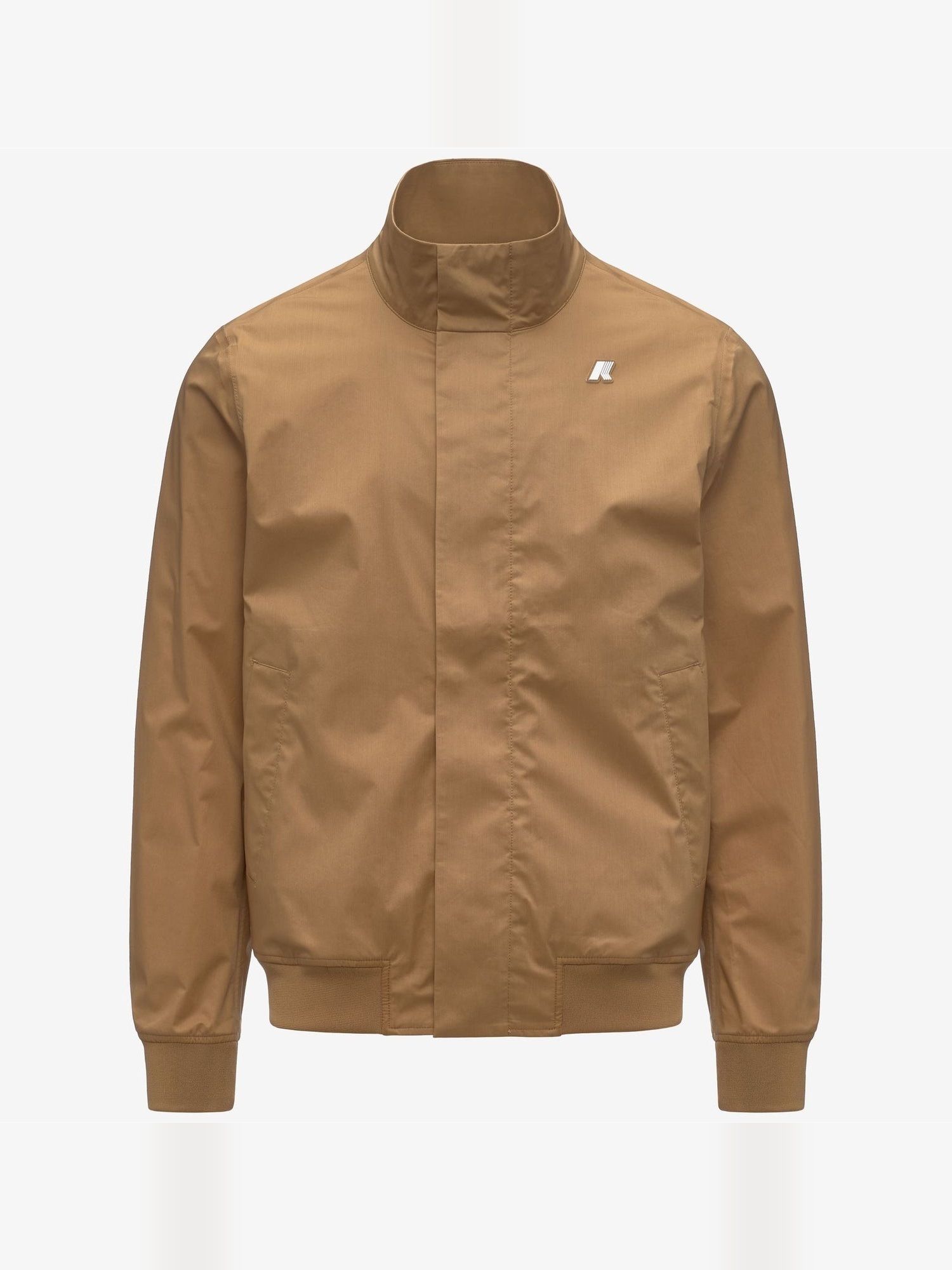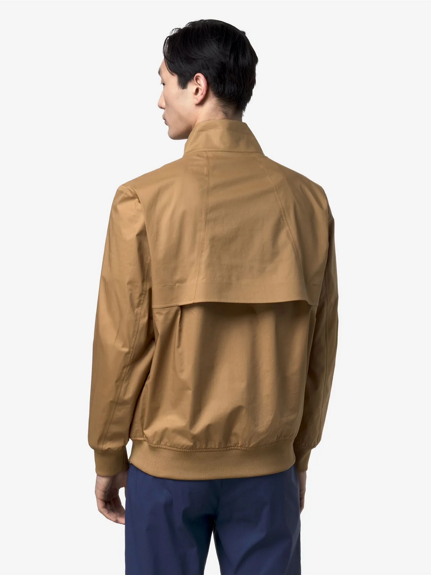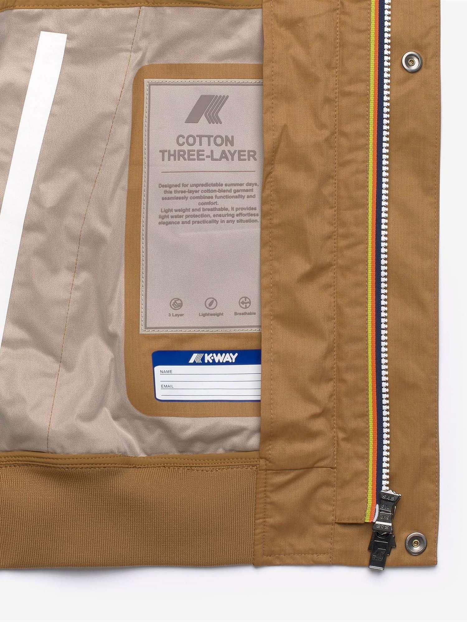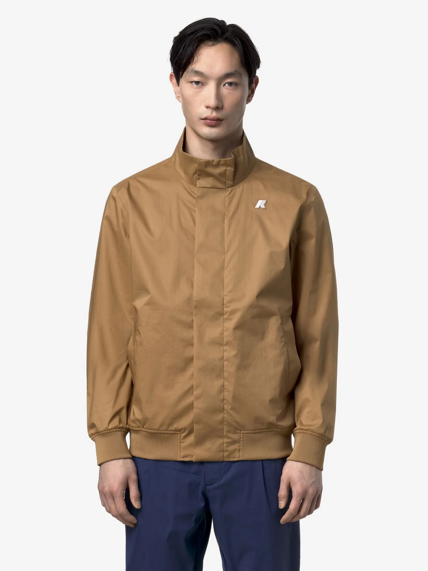 Giacca corta in tessuto a 3 strati con esterno in tessuto misto cotone, cuciture termonastrate riflettenti, polsini e fondo corpo a costine, chiusura zip con patta di copertura e logo in silicone.