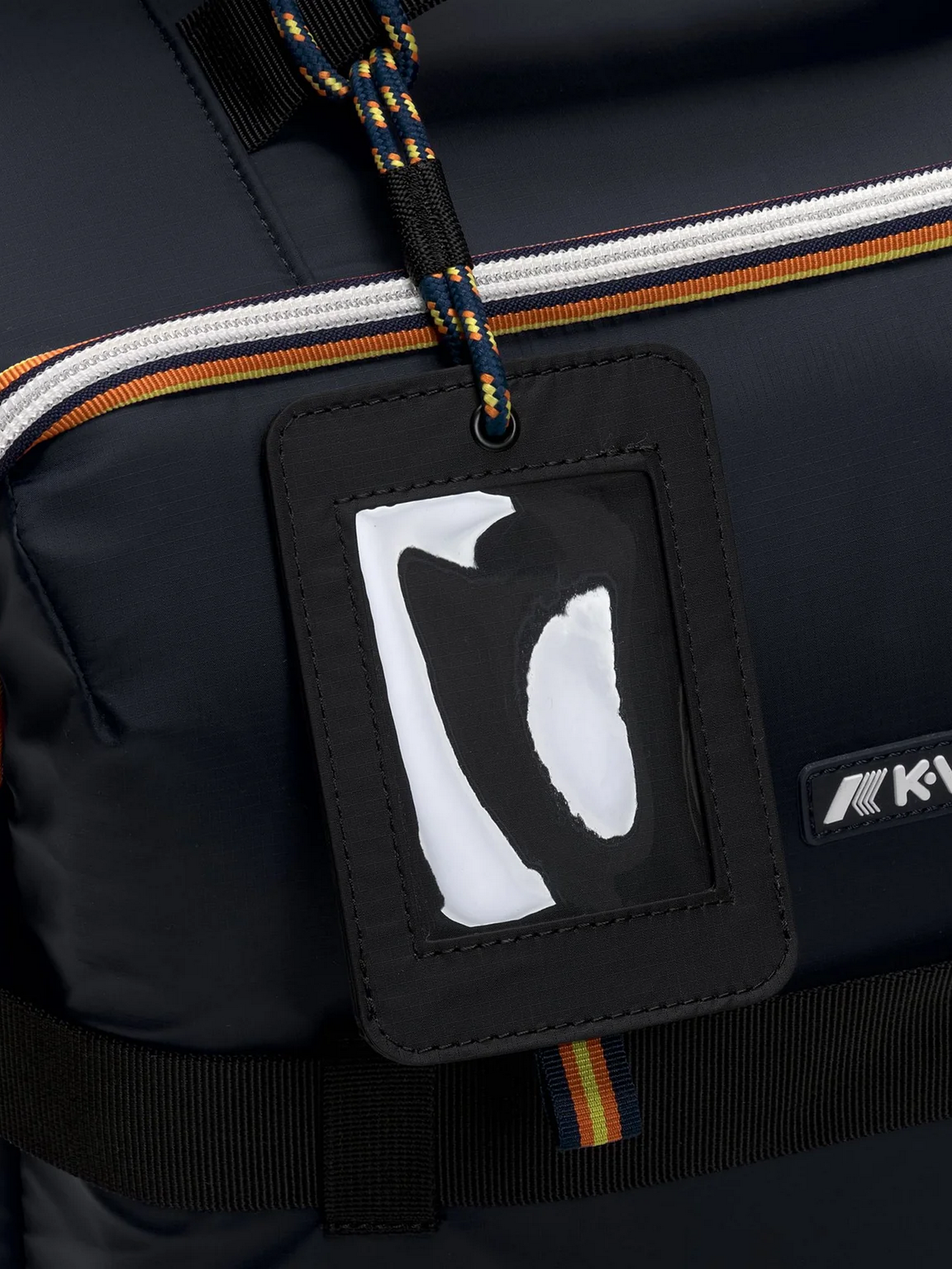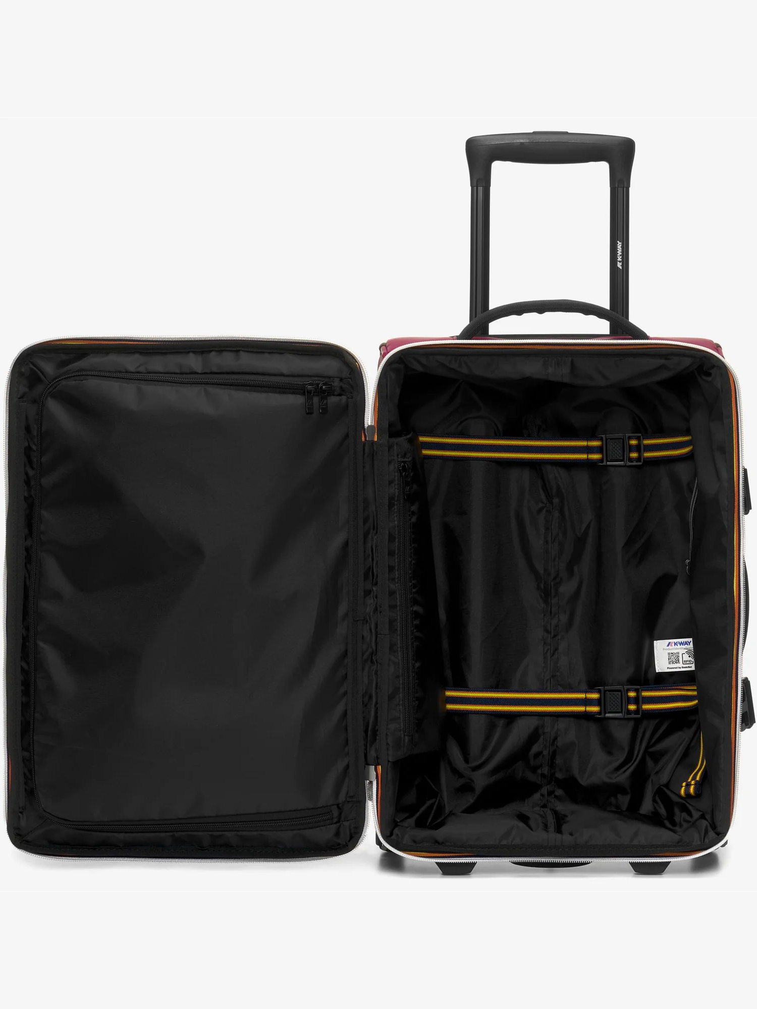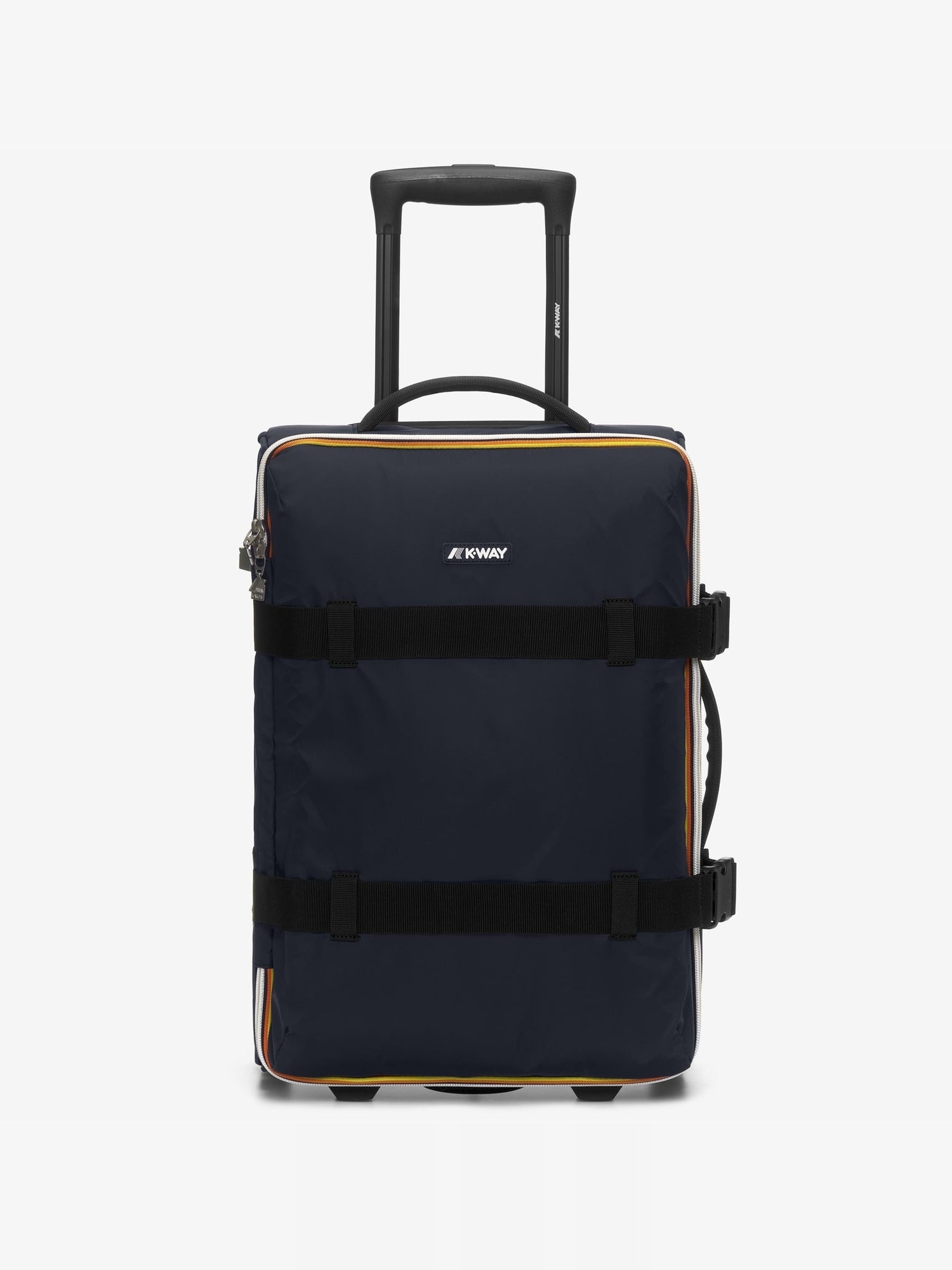 Trolley in ripstop impermeabile, idrorepellente, antivento, manico in nastro cm 2, 2 ruote, tasca frontale con zip, manico rigido estraibile da tasca posteriore, maniglia laterale, maniglia superiore, apertura principale con K-Way zip e logo bianco in silicone.