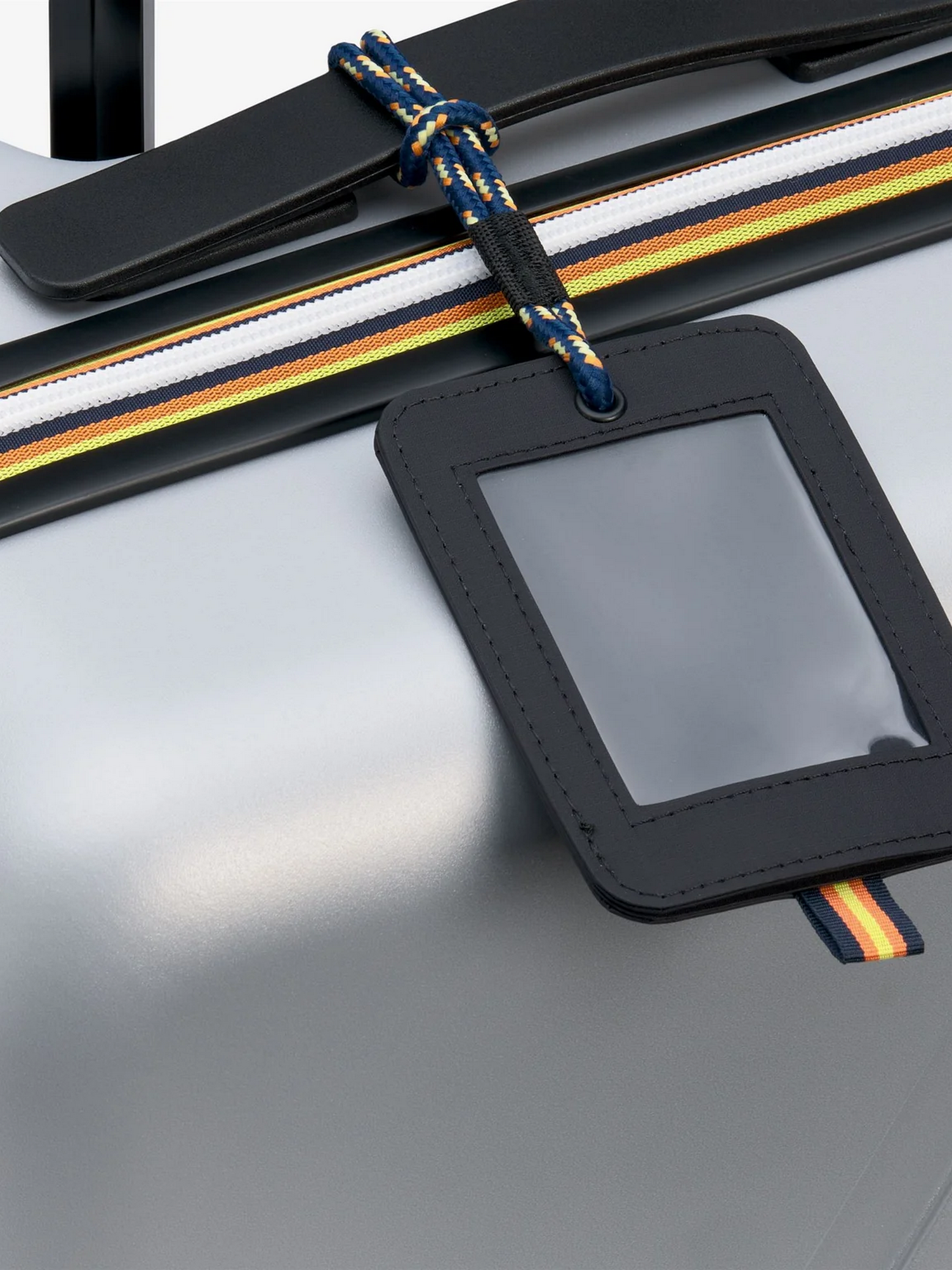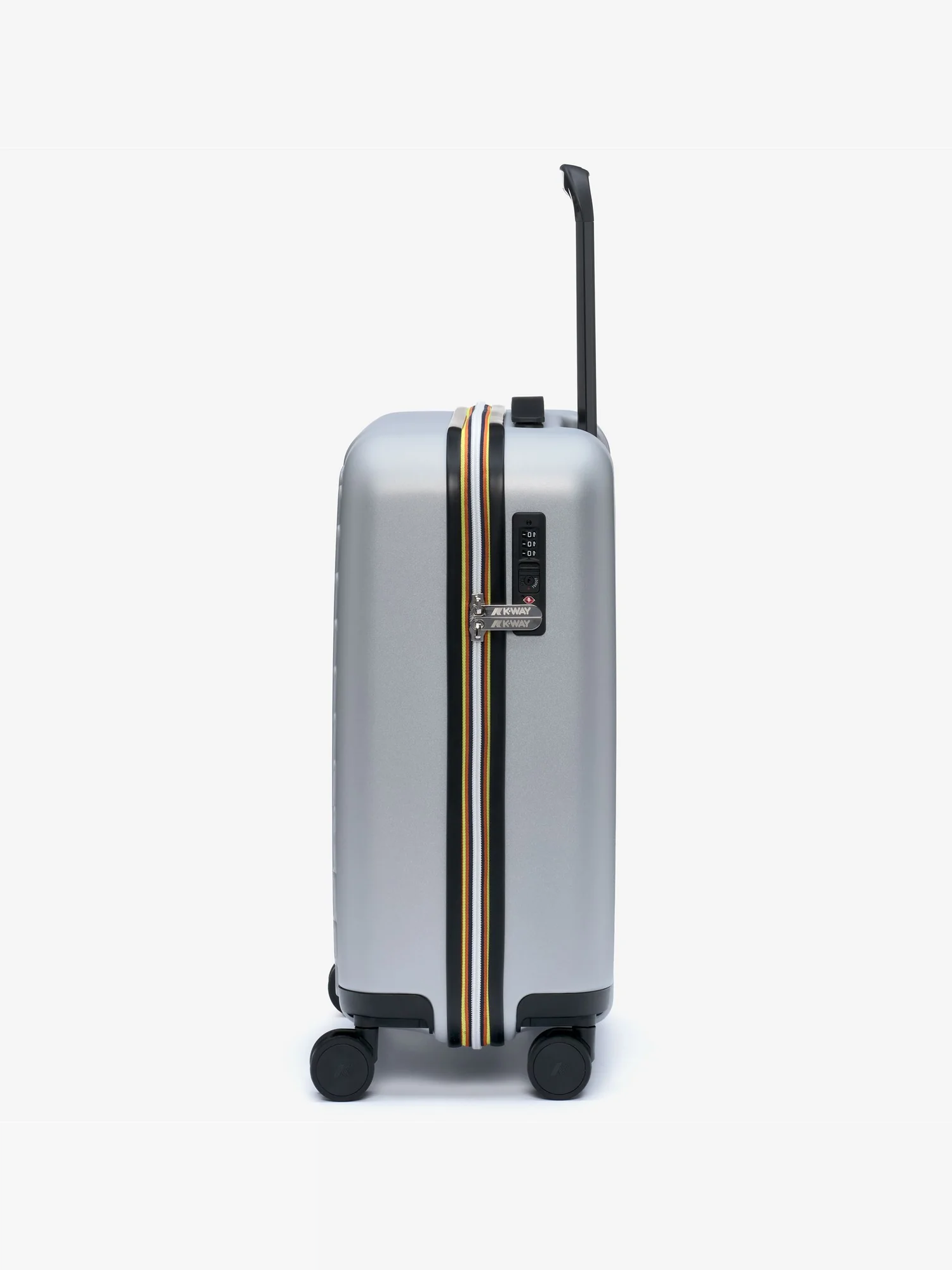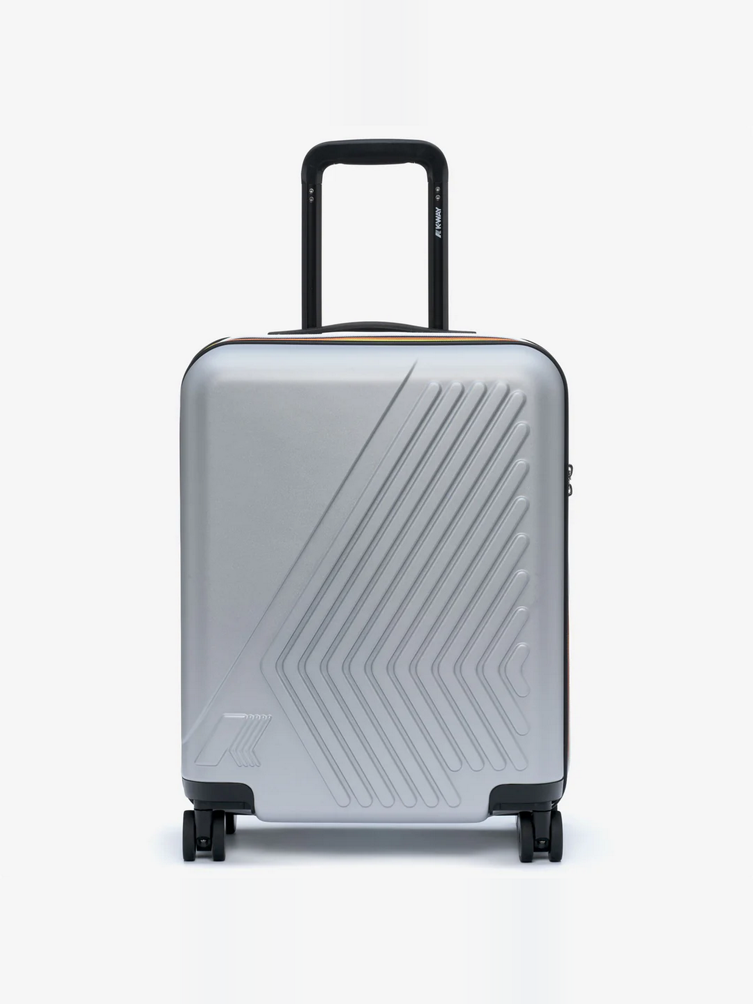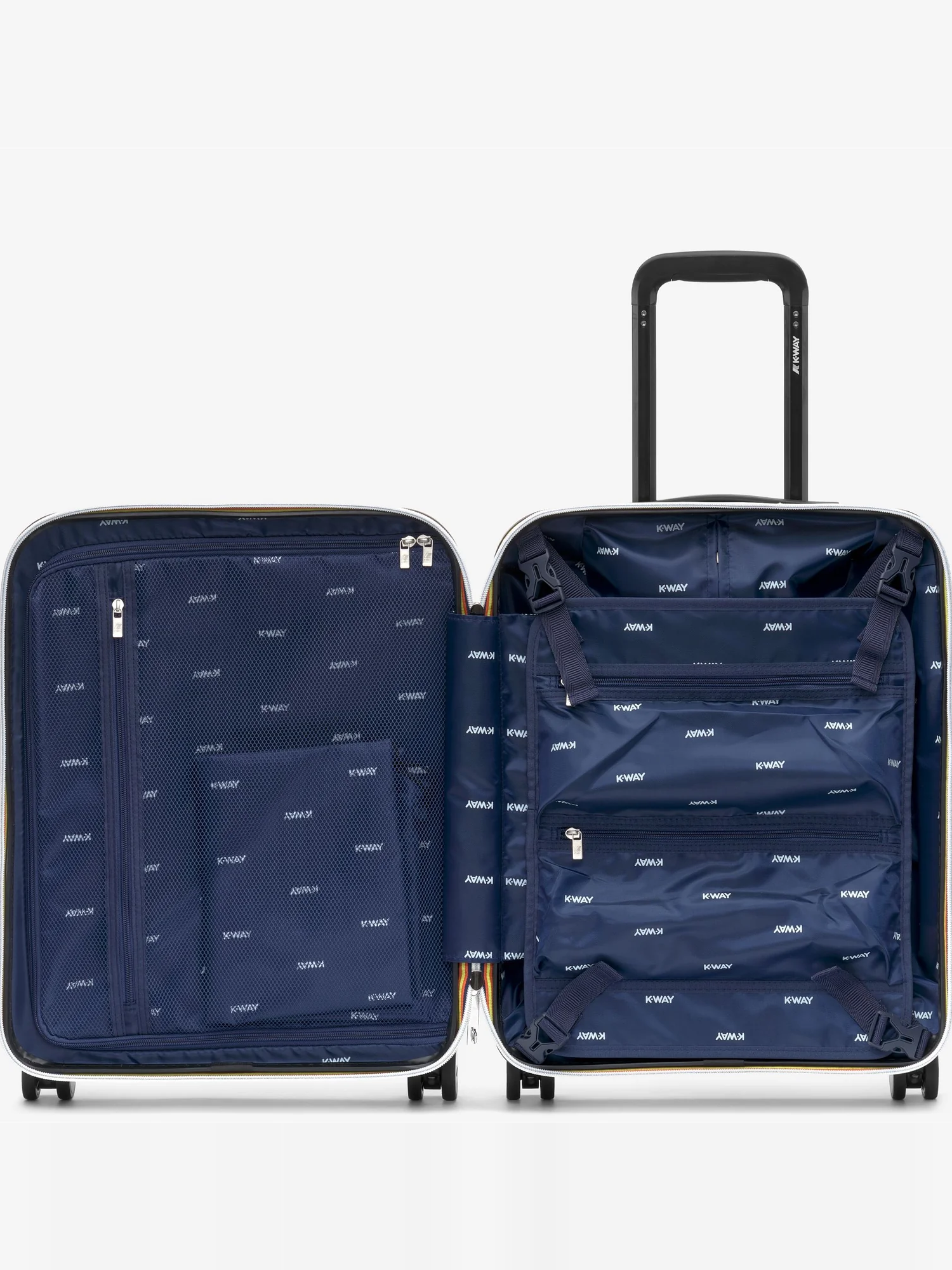 Trolley rigido da cabina con guscio in policarbonato, pannello divisorio rimovibile con inserti in rete, tasca piccola con zip, sacchetto biancheria con chiusura coulisse, 4 ruote girevoli a 360°, maniglia estensibile in alluminio, sistema di chiusura a combinazione con TSA, tag per etichetta bagaglio e monogramma K-Way in rilievo tono su tono.