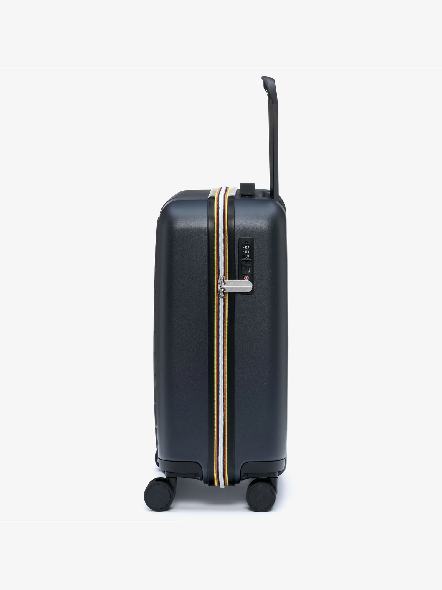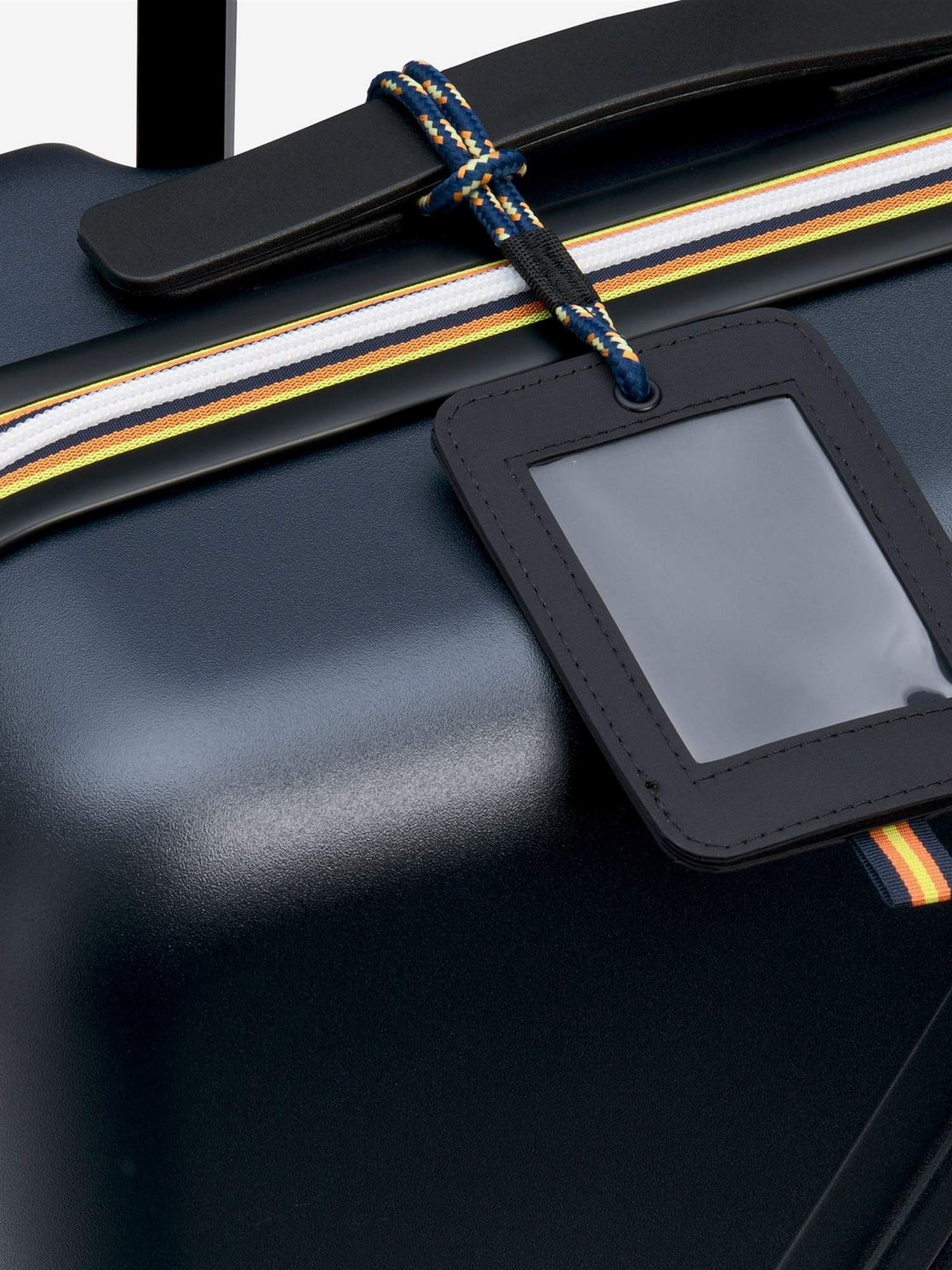 Trolley rigido da cabina con guscio in policarbonato, pannello divisorio rimovibile con inserti in rete, tasca piccola con zip, sacchetto biancheria con chiusura coulisse, 4 ruote girevoli a 360°, maniglia estensibile in alluminio, sistema di chiusura a combinazione con TSA, tag per etichetta bagaglio e monogramma K-Way in rilievo tono su tono.