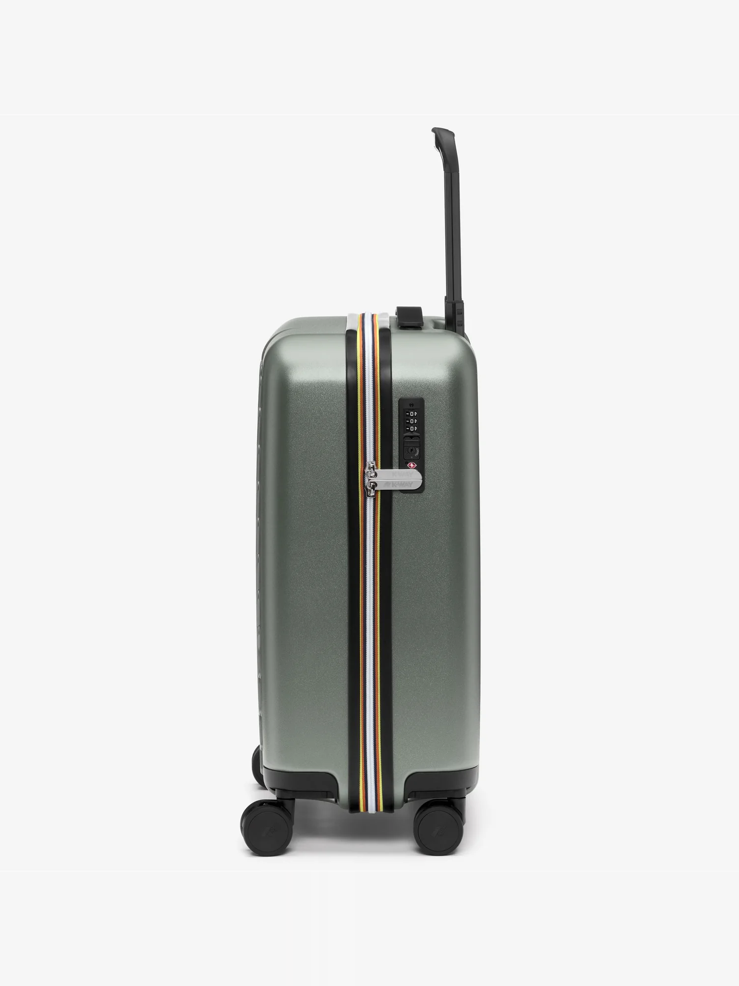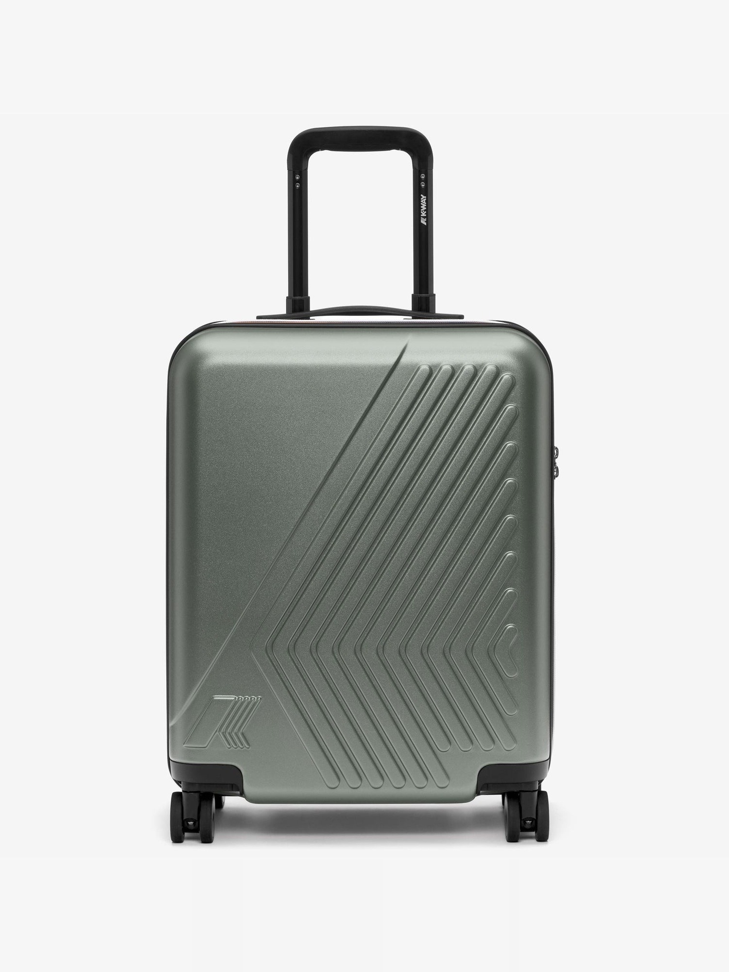 Trolley rigido da cabina con guscio in policarbonato, pannello divisorio rimovibile con inserti in rete, tasca piccola con zip, sacchetto biancheria con chiusura coulisse, 4 ruote girevoli a 360°, maniglia estensibile in alluminio, sistema di chiusura a combinazione con TSA, tag per etichetta bagaglio e monogramma K-Way in rilievo tono su tono.