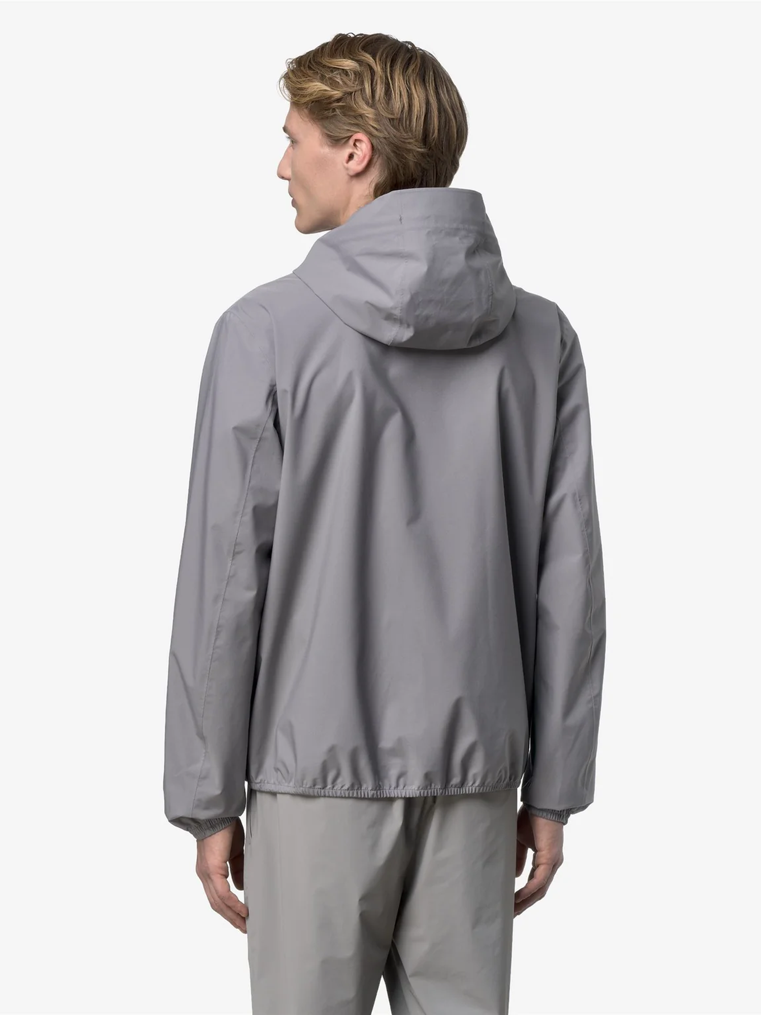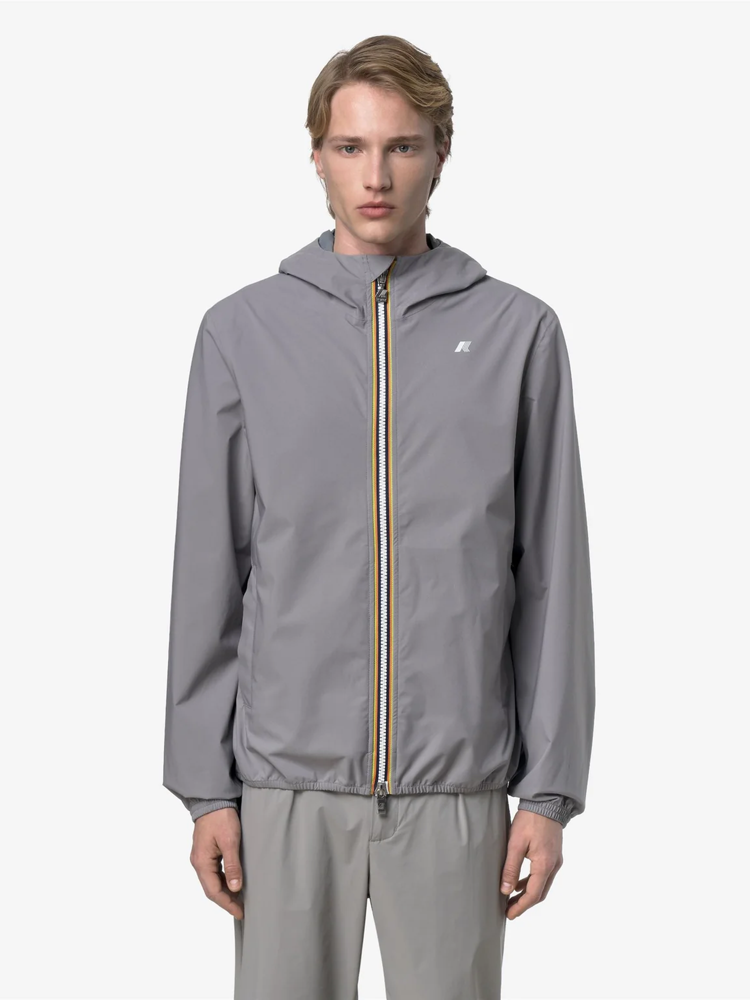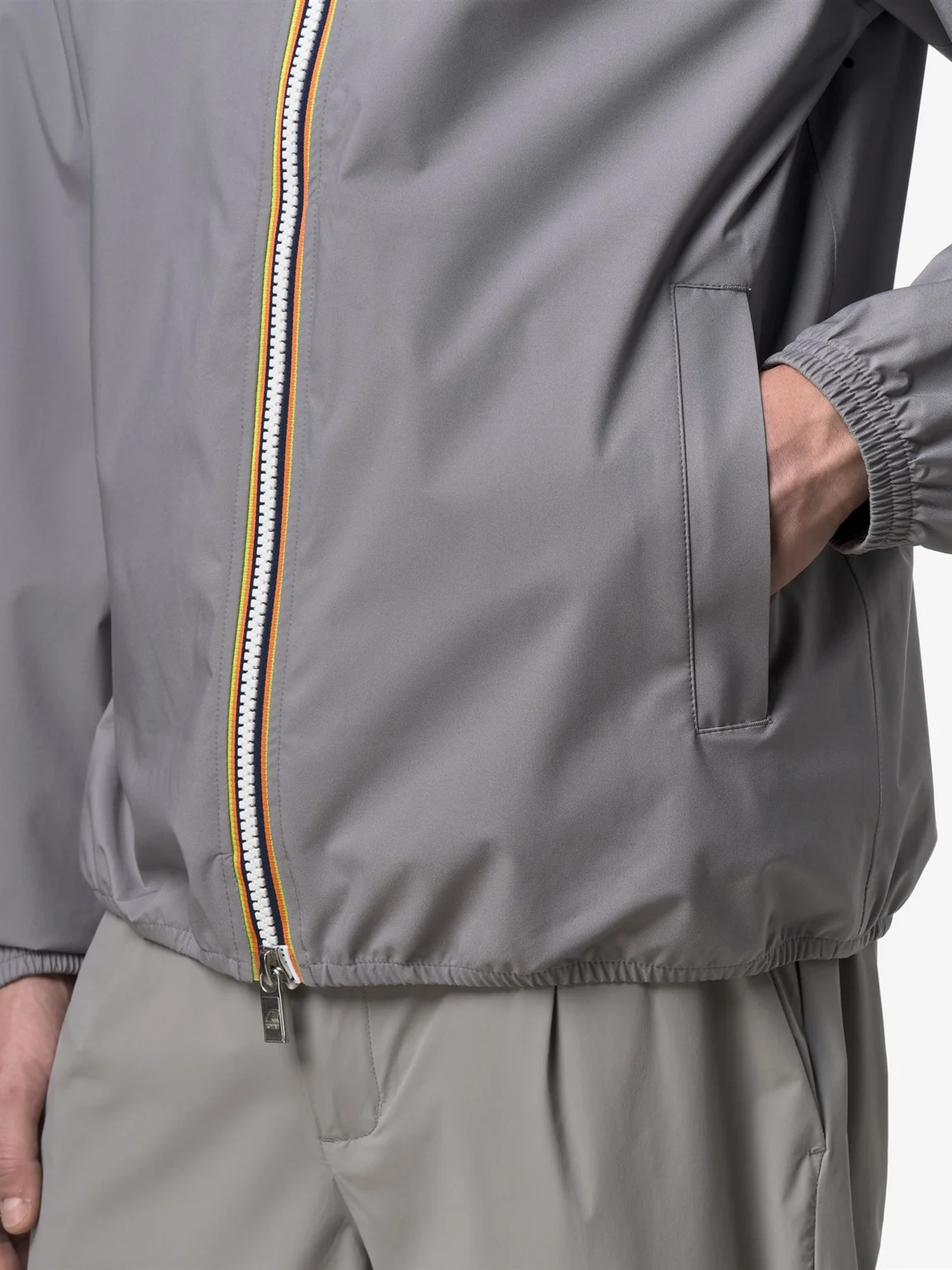 Giacca corta in poliestere elasticizzato, impermeabile, antivento, traspirante, membrana interna stampata con logo, cuciture termonastrate, cappuccio e fondo regolabile con corda elastica e fermacorda, chiusura con zip e logo stampato.