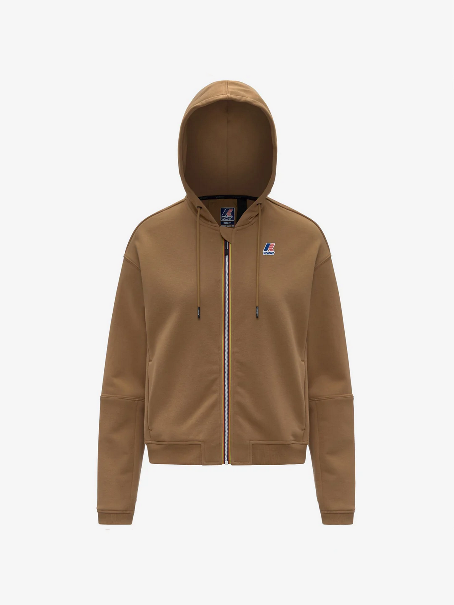 Felpa con cappuccio in felpa, polsini e bordo inferiore a costine, chiusura zip, carrè con doppia cucitura sul retro e logo stampato.