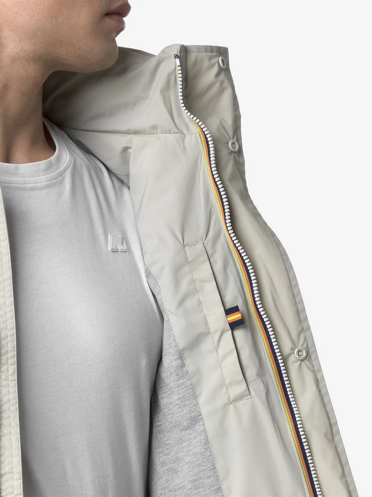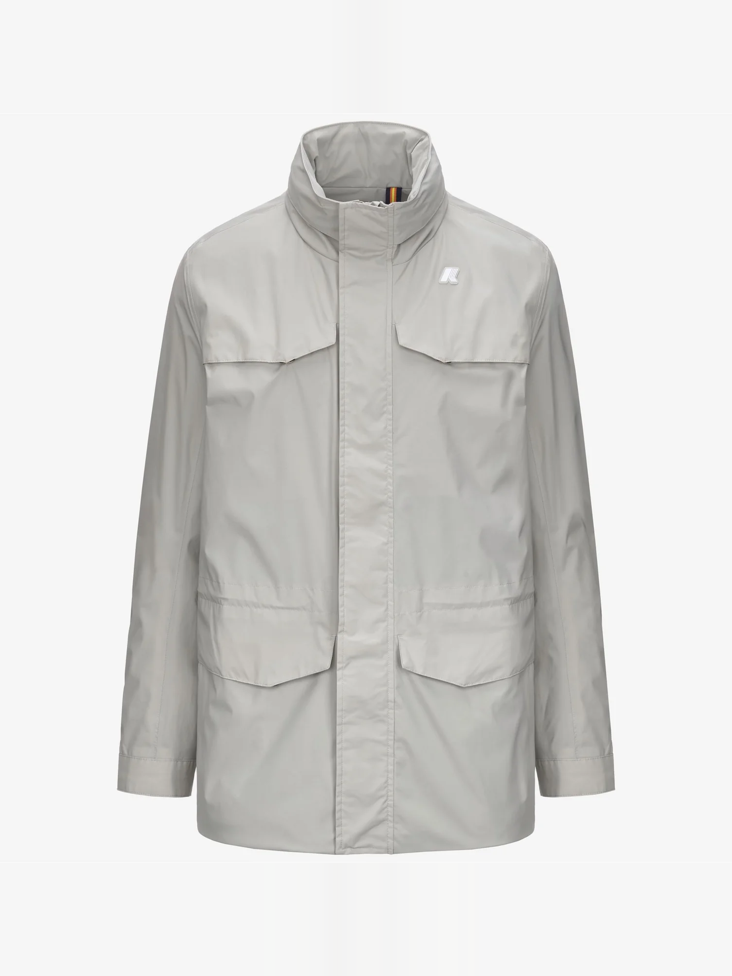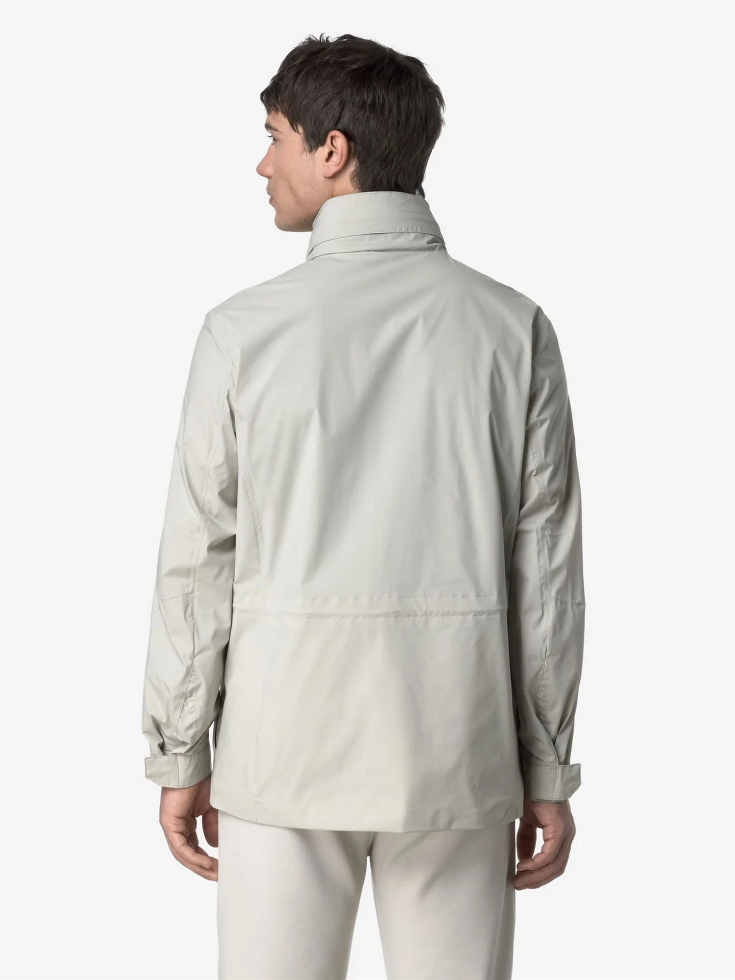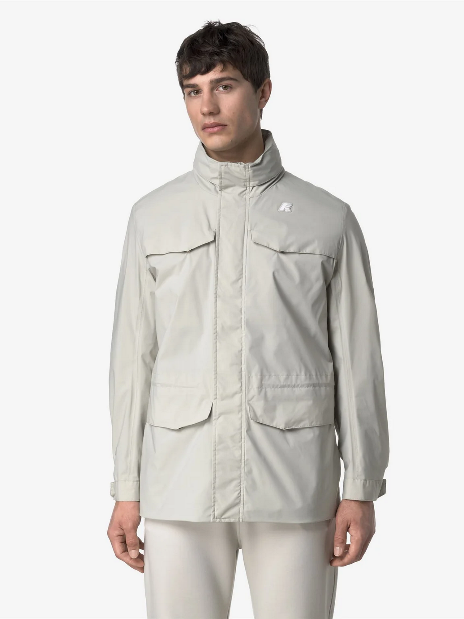 Field jacket in nylon stretch impermeabile, antivento e traspirante con cuciture termonastrate, cappuccio ripiegabile a scomparsa nel collo, taglio di ventilazione sul retro, chiusura con zip coperta da patta e logo in silicone.