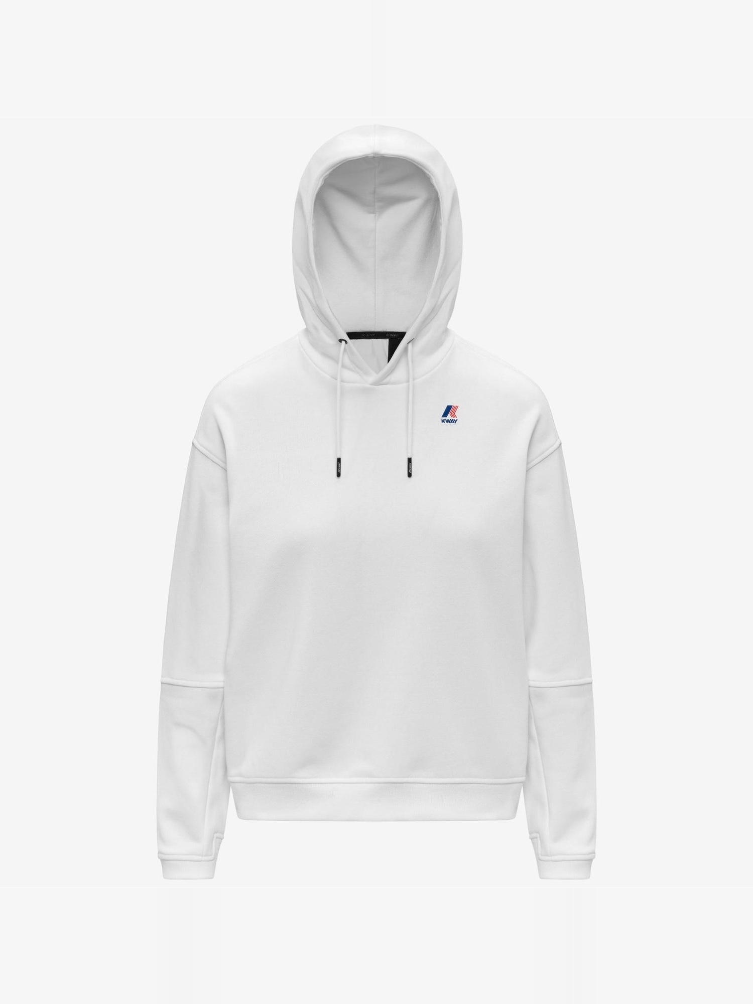 Felpa con cappuccio regolabile con coulisse, polsini e bordo inferiore a costine, carrè con doppia cucitura sul retro e logo colorato stampato.