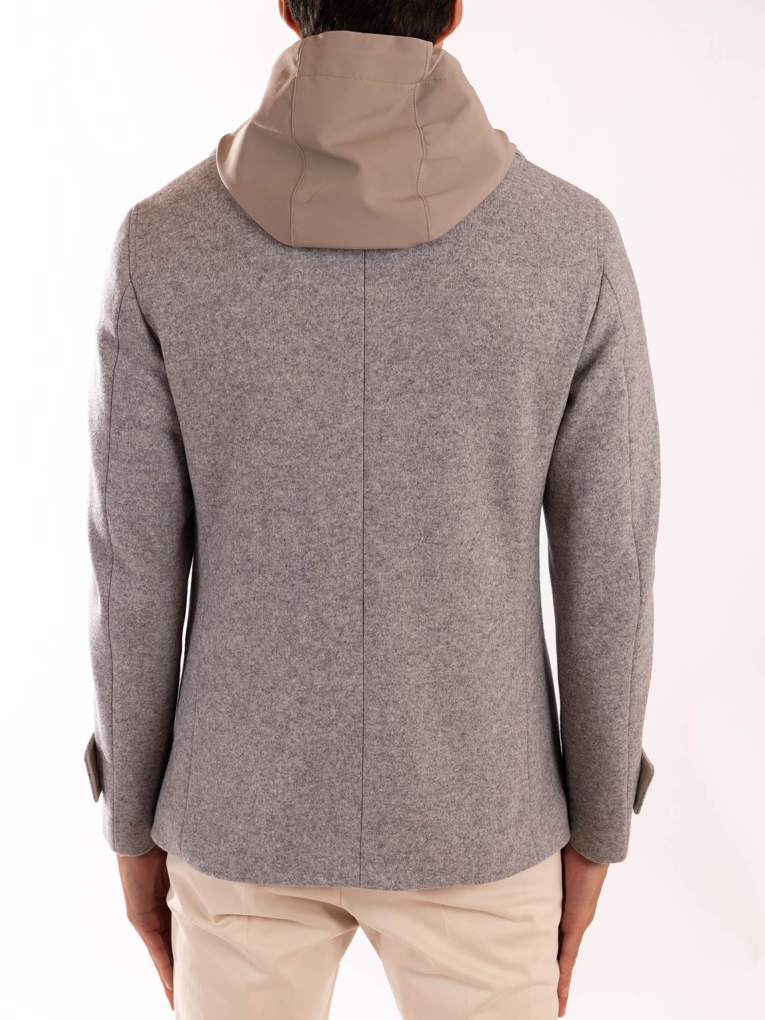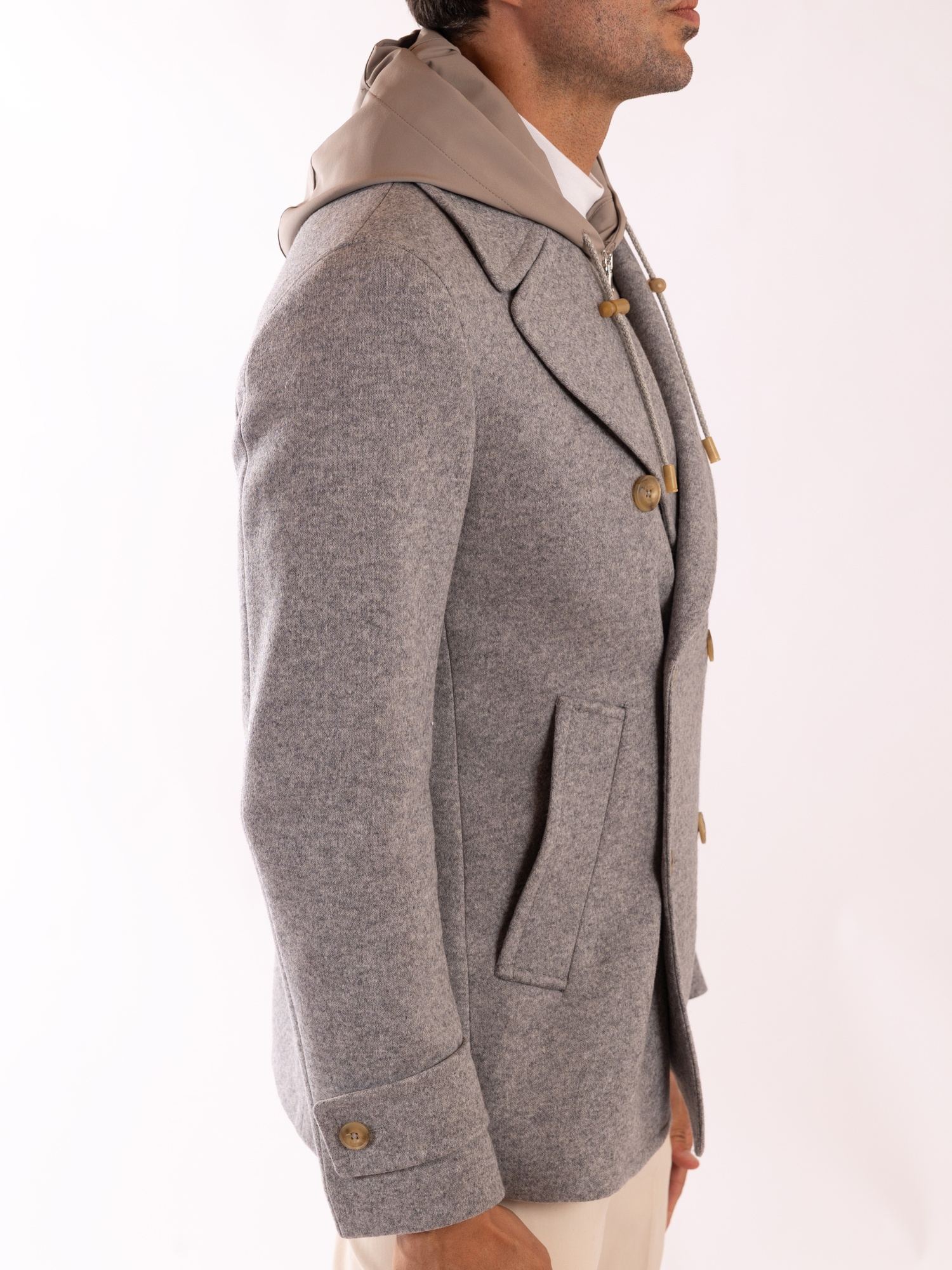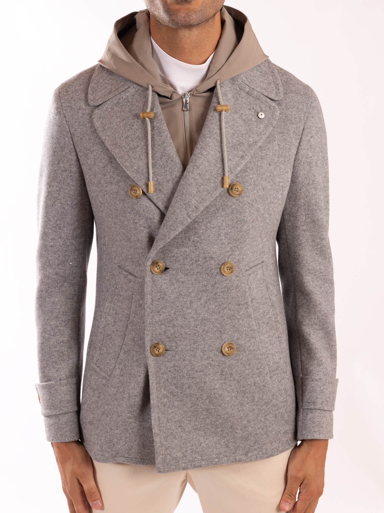 Giacca doppiopetto con pettorina integrata, chiusura con zip e bottoni e cappuccio integrato.