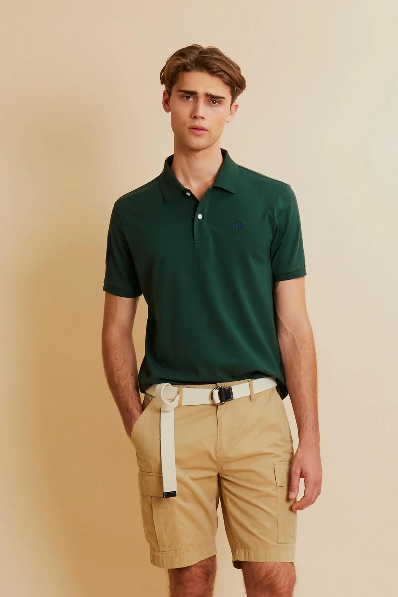 Polo a manica corta in piquet stretch con colletto e polsini in costina tinta unita, patch numerico applicato sulla manica, stampa monogramma a contrasto nel sottocollo e logo ricamato a contrasto sul petto.