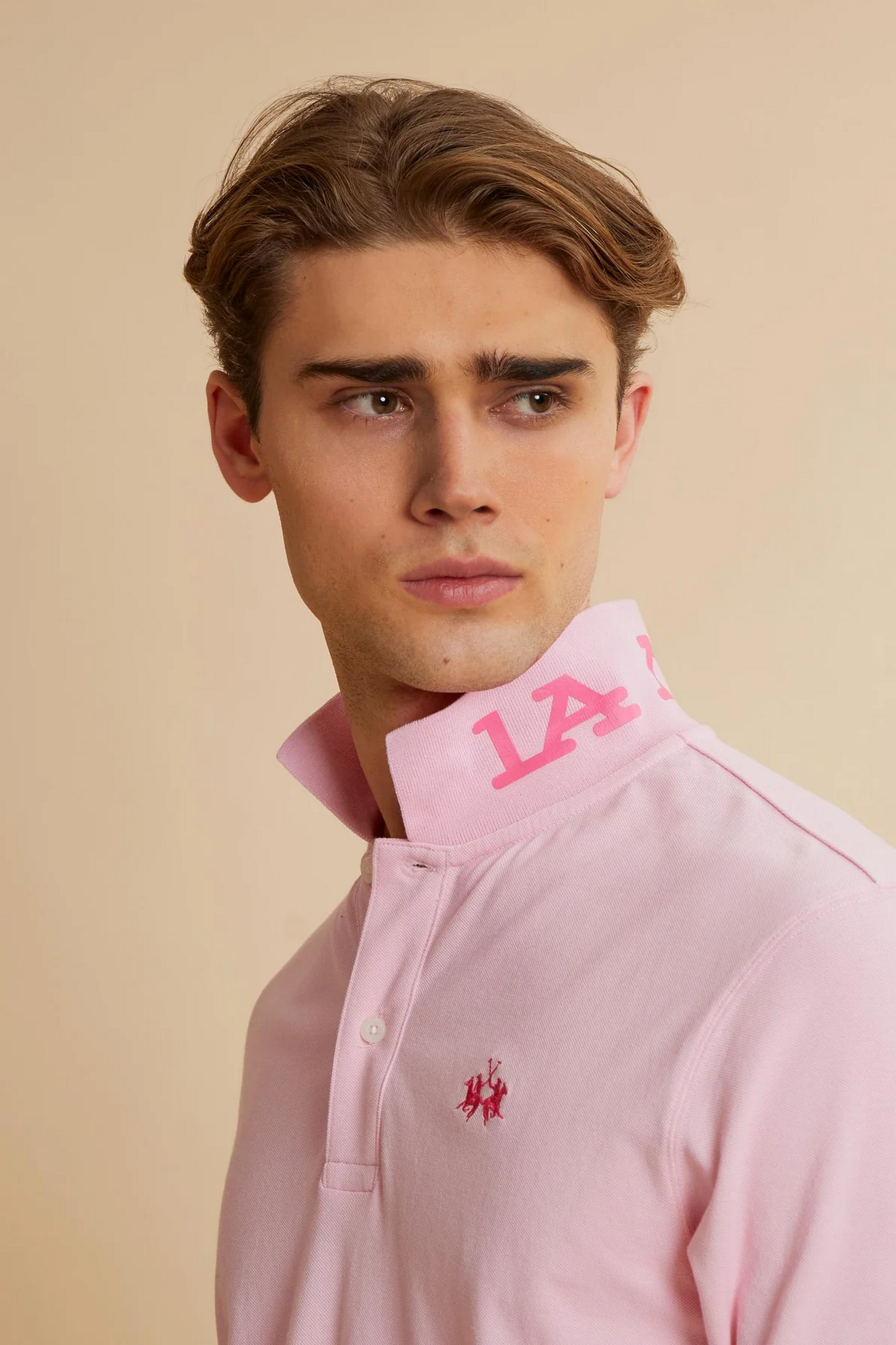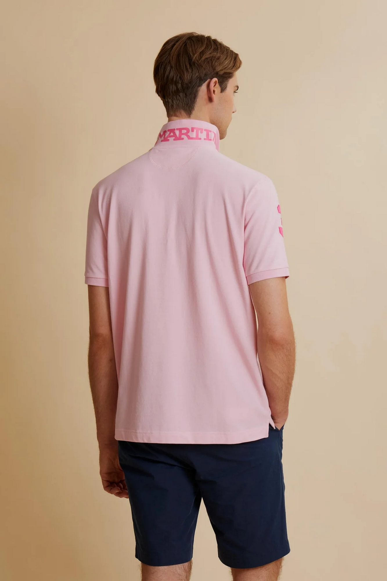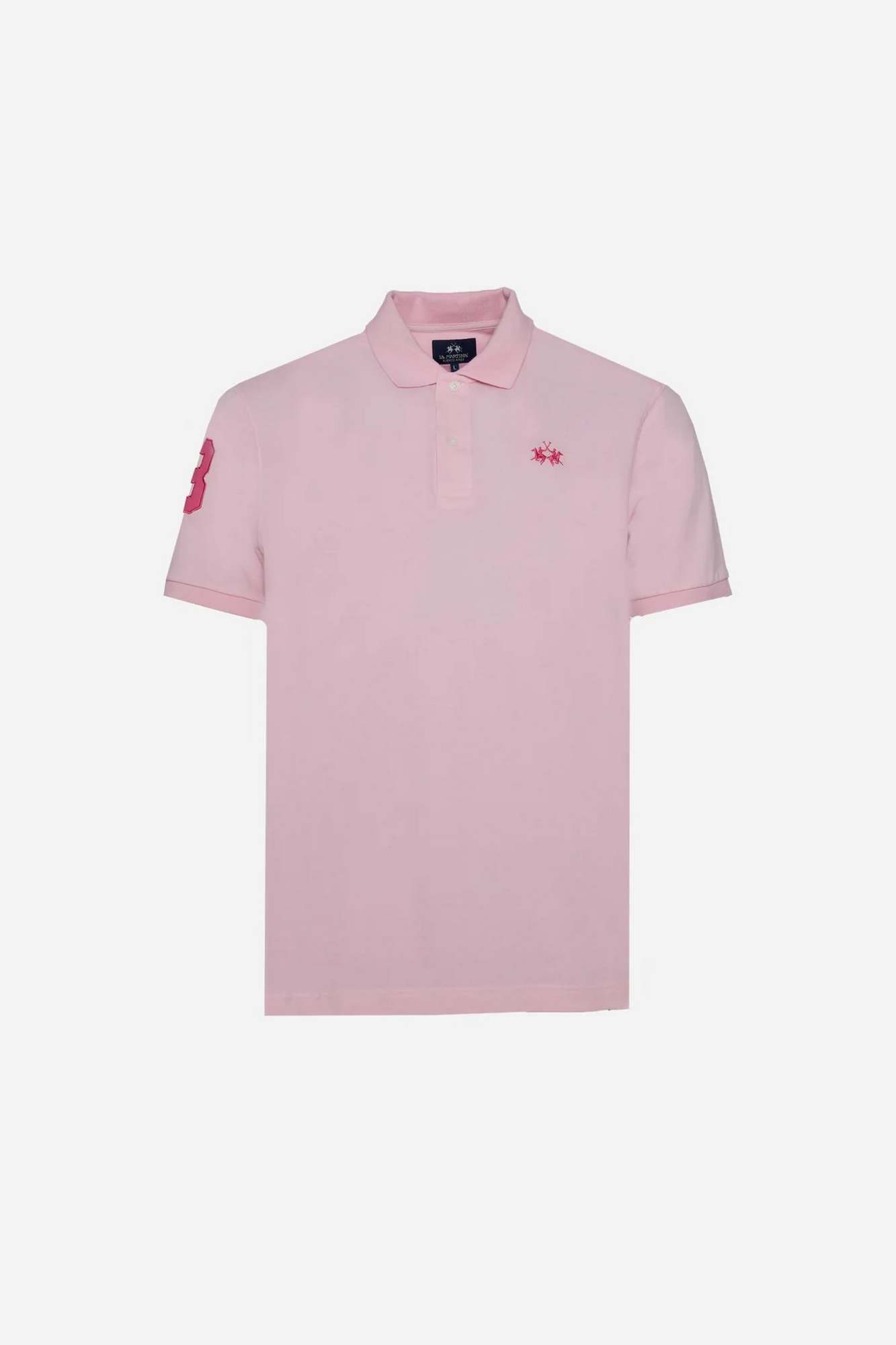 Polo a manica corta in piquet stretch con colletto e polsini in costina tinta unita, patch numerico applicato sulla manica, stampa monogramma a contrasto nel sottocollo e logo ricamato a contrasto sul petto.