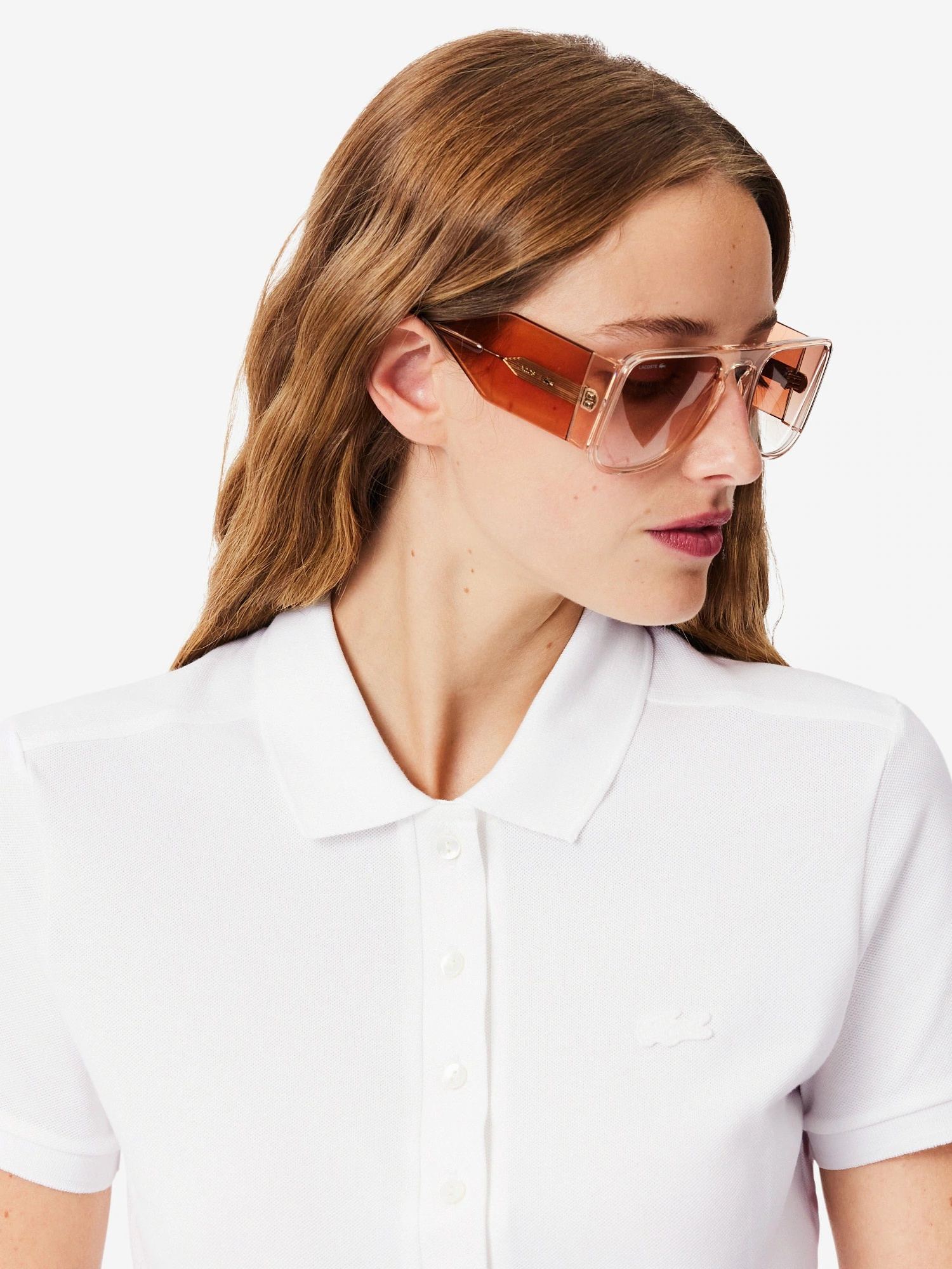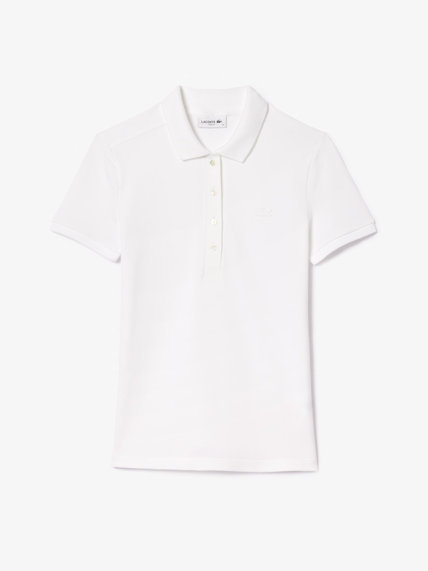 Polo in piqué di cotone stretch, colletto a costine con quattro bottoni effetto madreperla, finiture a costine alle estremità della manica e logo con coccodrillo tono su tono ricamato sul petto.