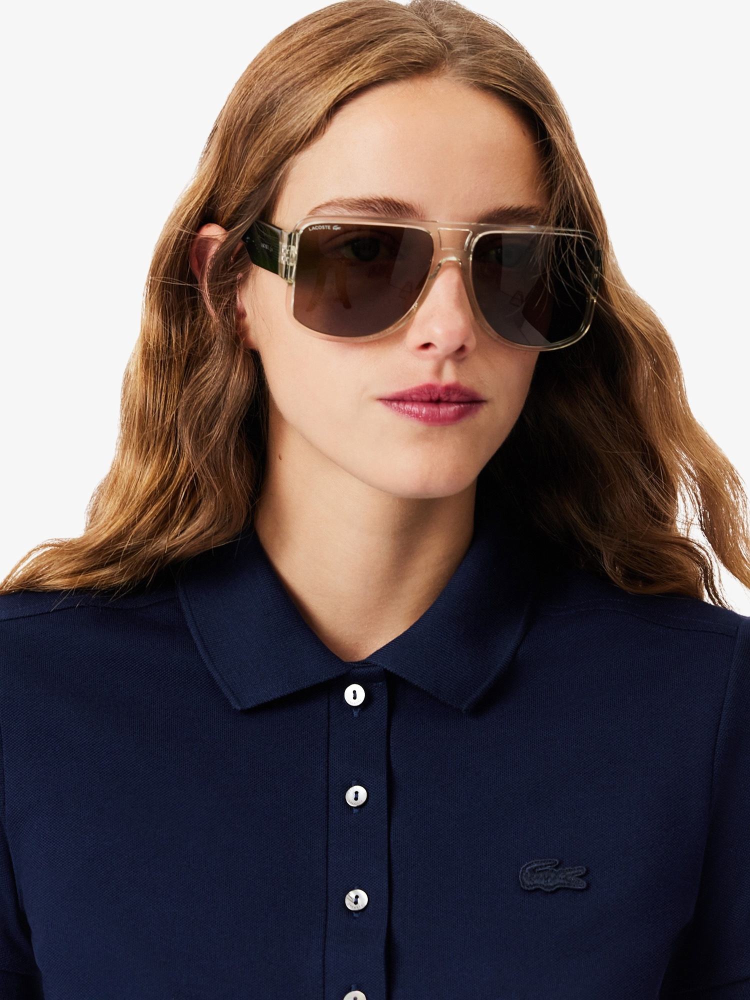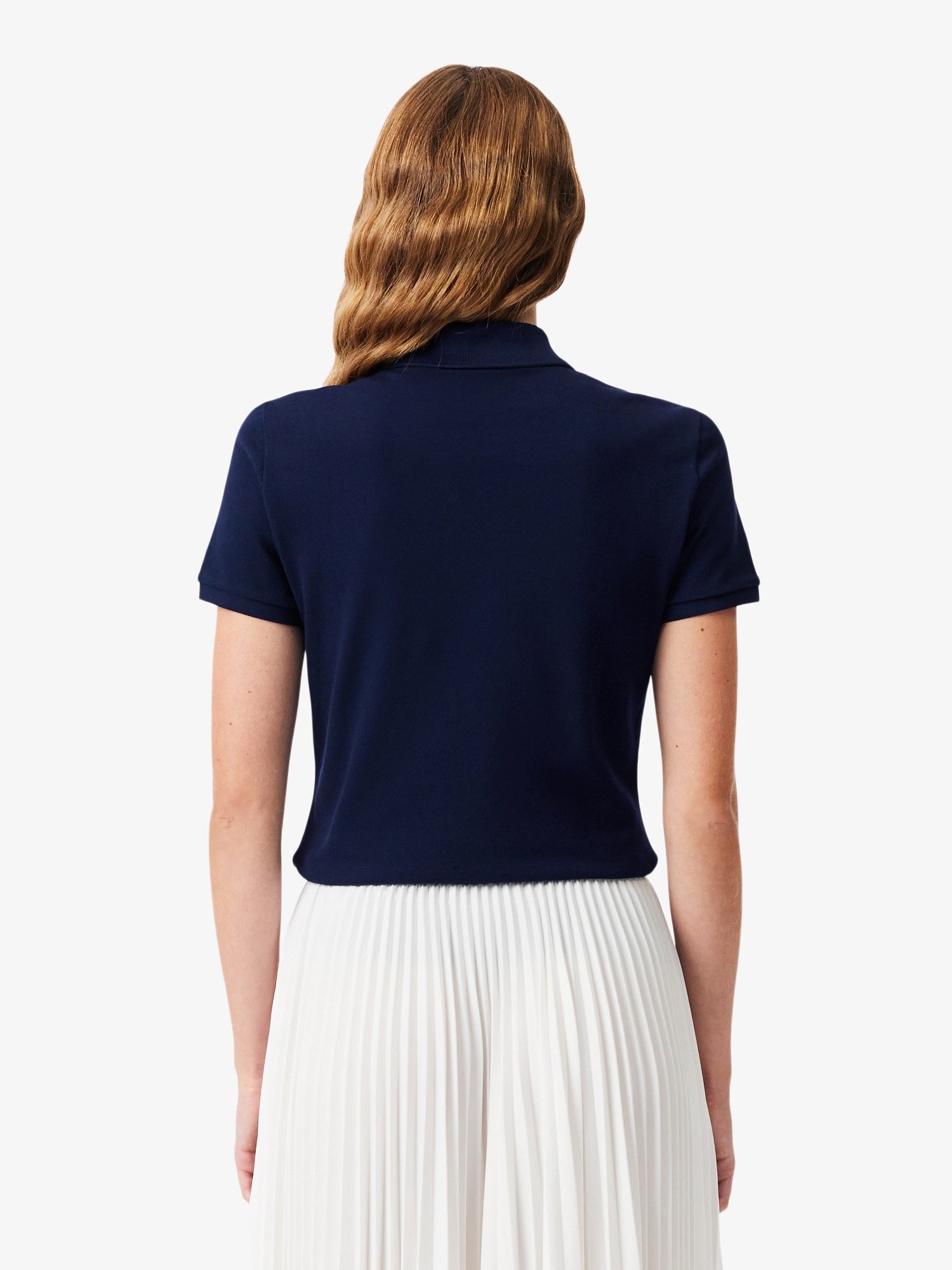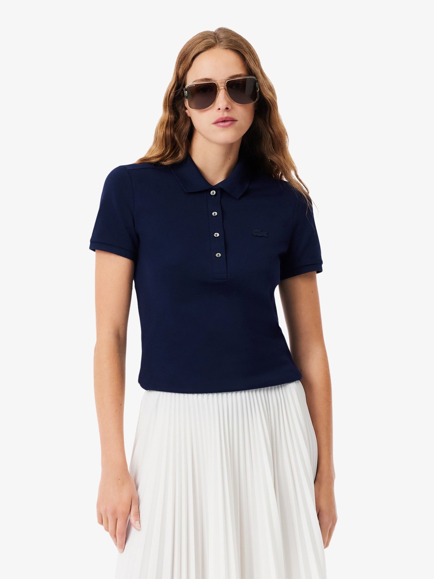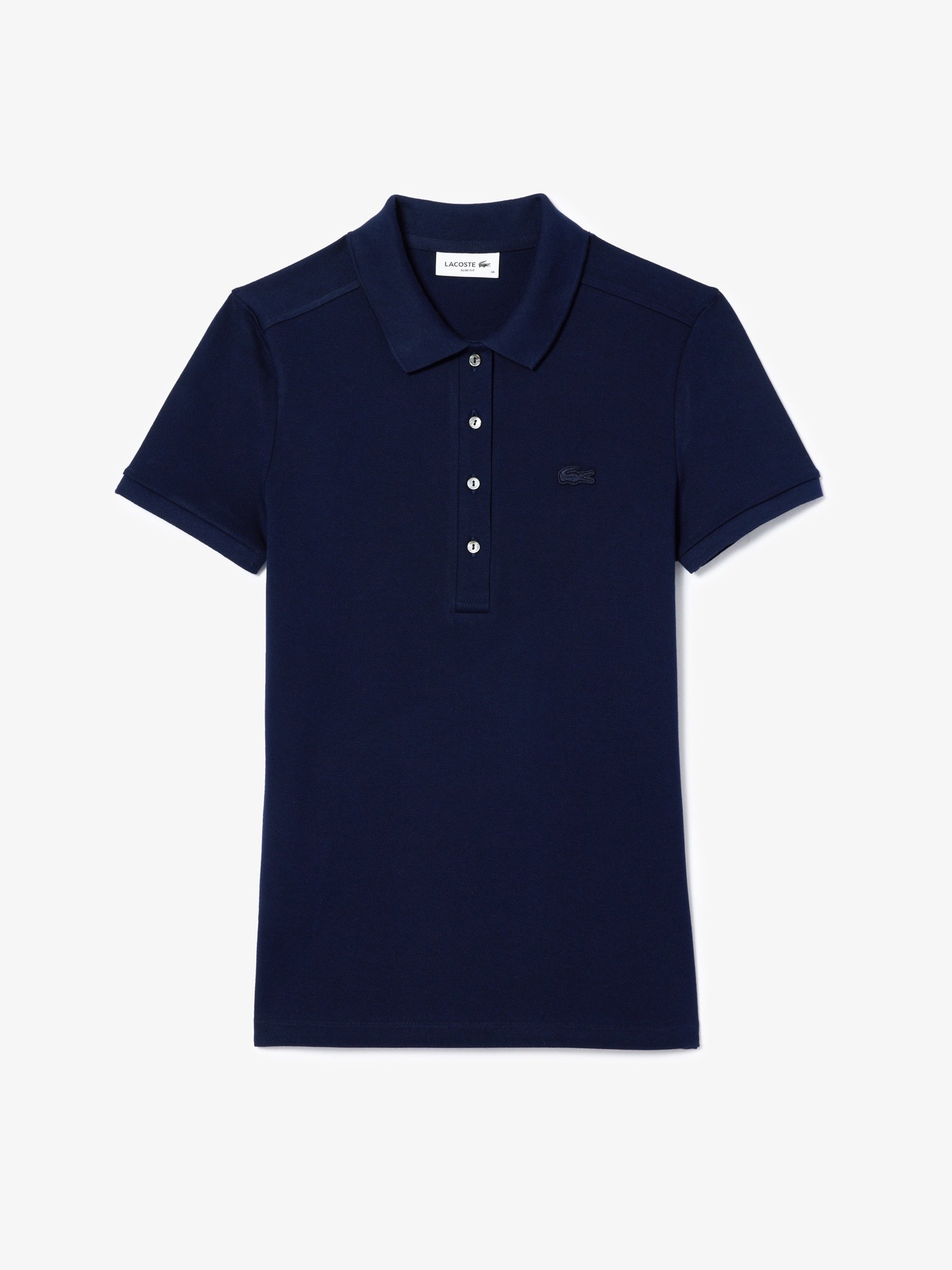 Polo in piqué di cotone stretch, colletto a costine con quattro bottoni effetto madreperla, finiture a costine alle estremità della manica e logo con coccodrillo tono su tono ricamato sul petto.