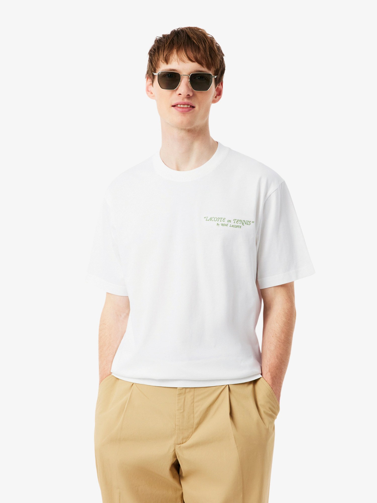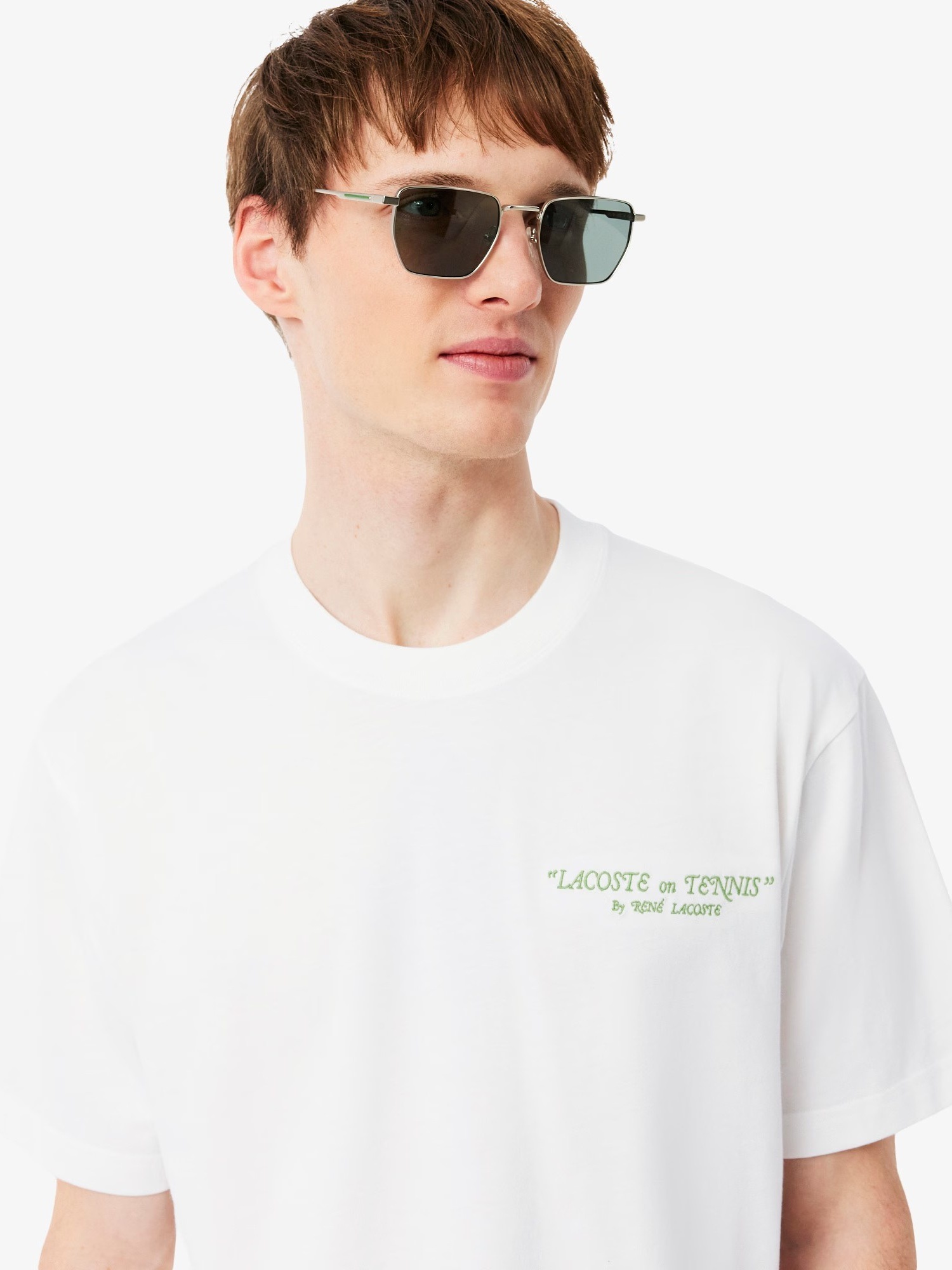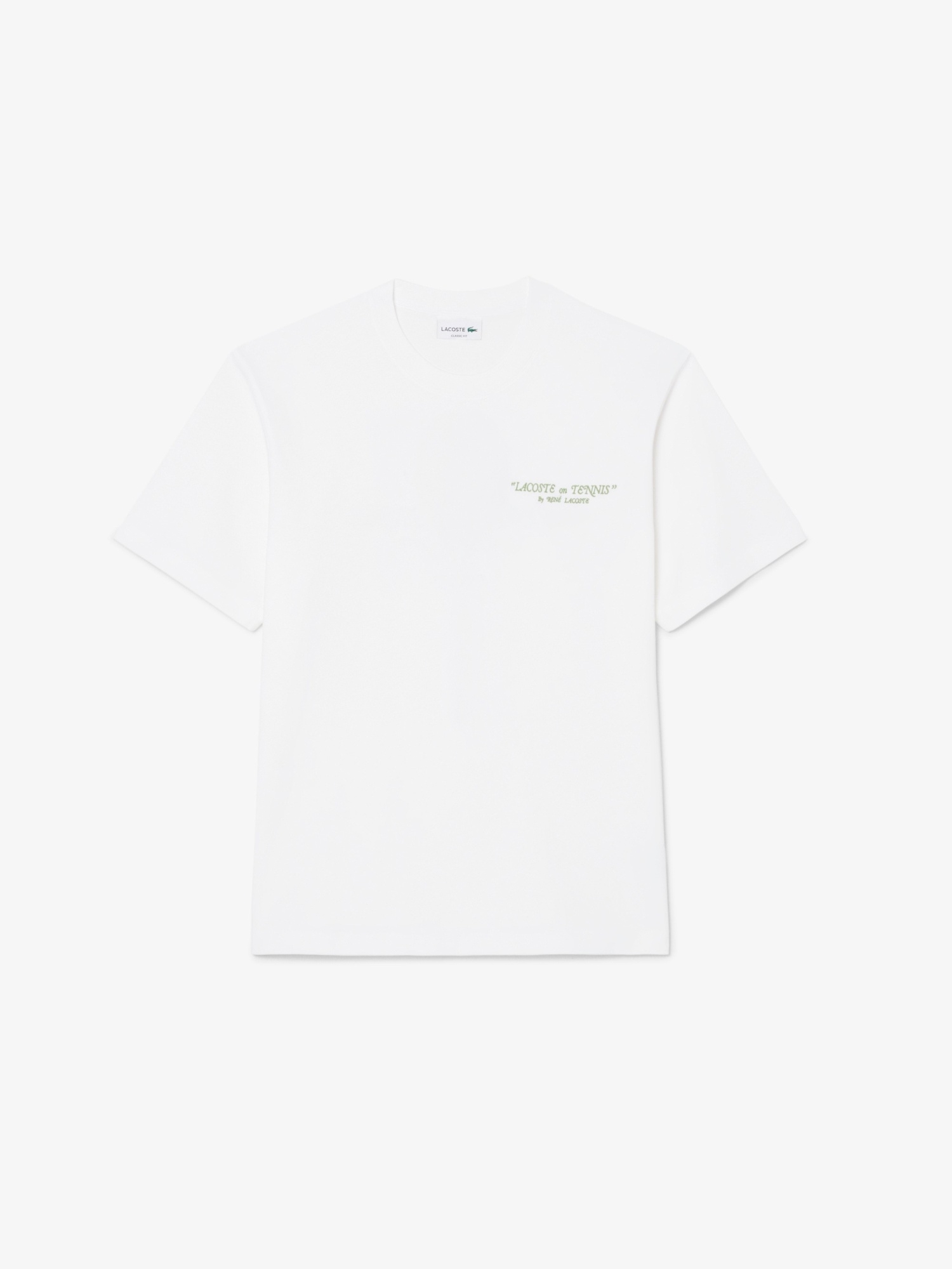 T-shirt in jersey di cotone organico con ricamo sul davanti, stampa sul retro e coccodrillo ricamato sotto il collo sul retro.