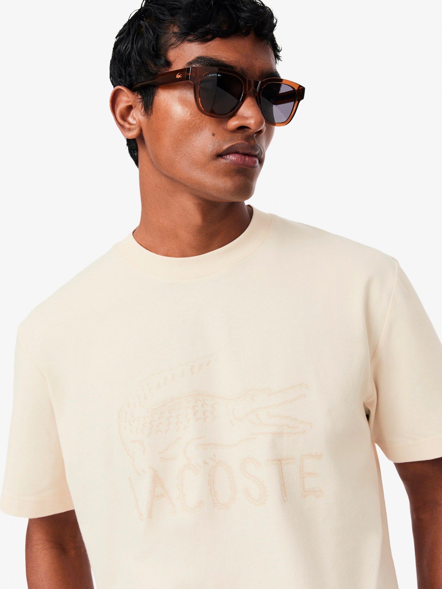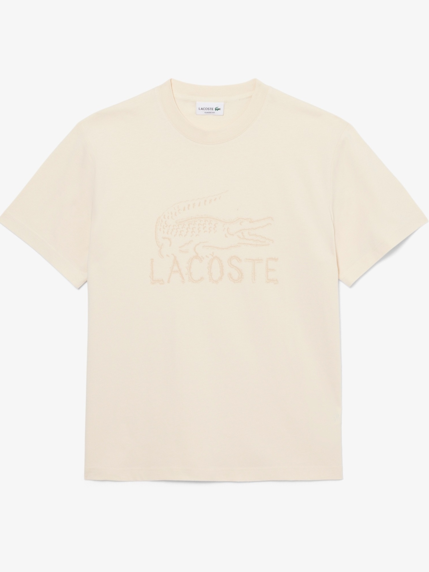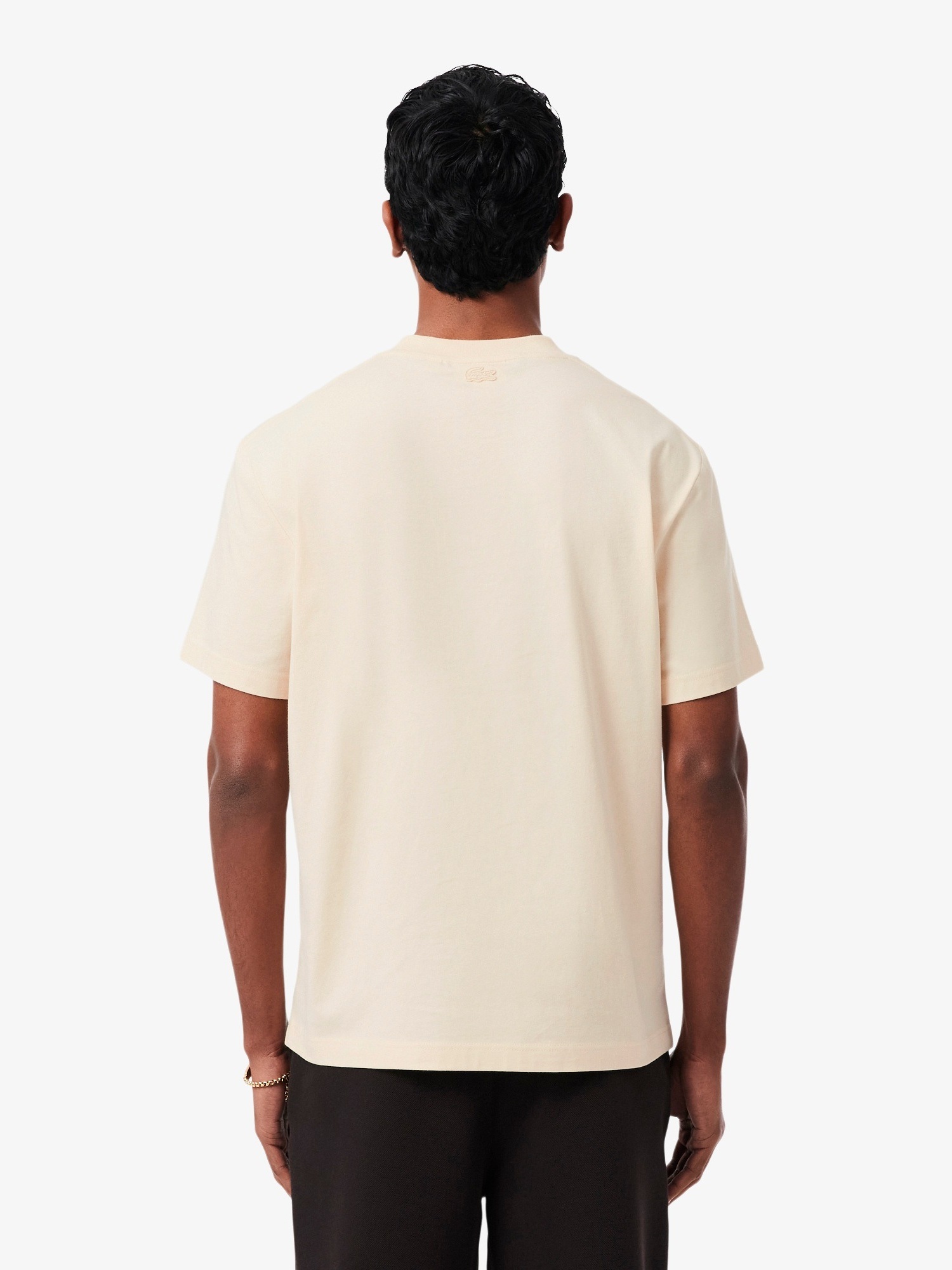 T-shirt in jersey pesante di cotone organico con stampa frontale e coccodrillo ricamato sotto il collo sul retro.