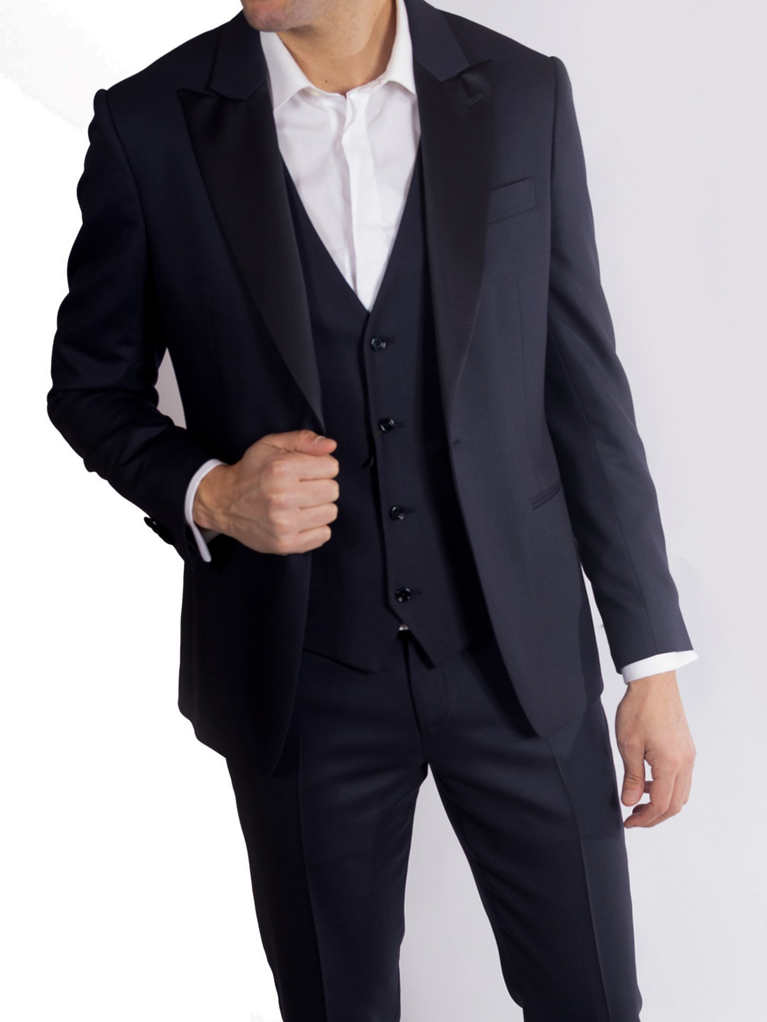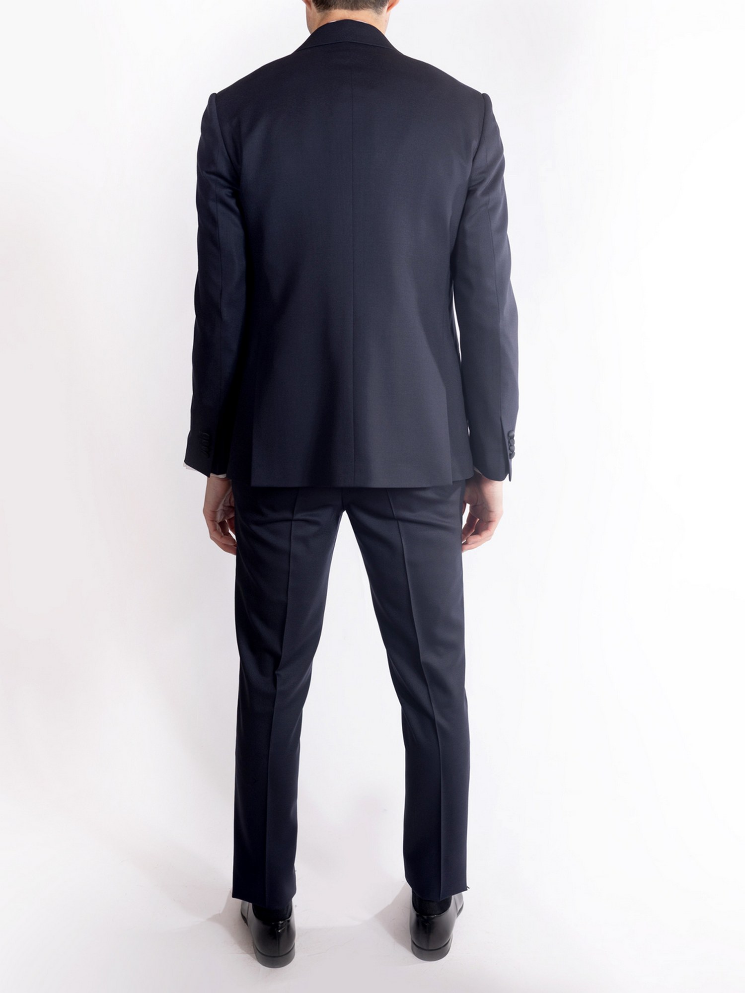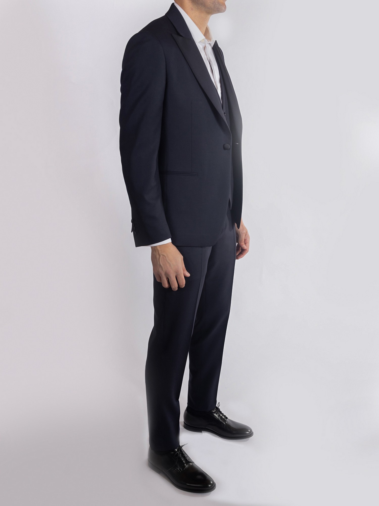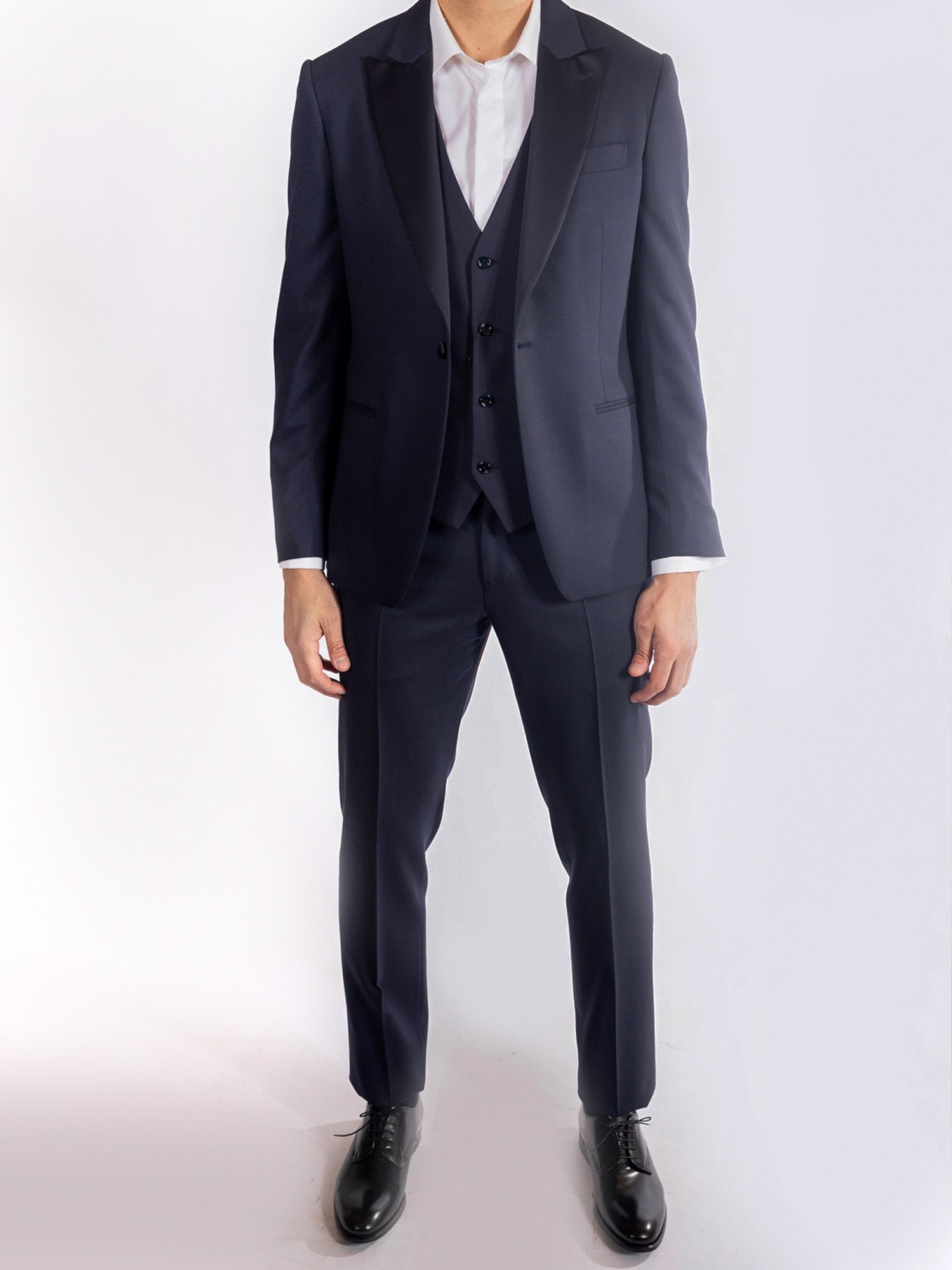 Abito tre pezzi composto da giacca monopetto, gilet coordinato e pantalone flat-front. Taglio sartoriale asciutto con piega stirata, chiusura a scomparsa e fondo regolare.