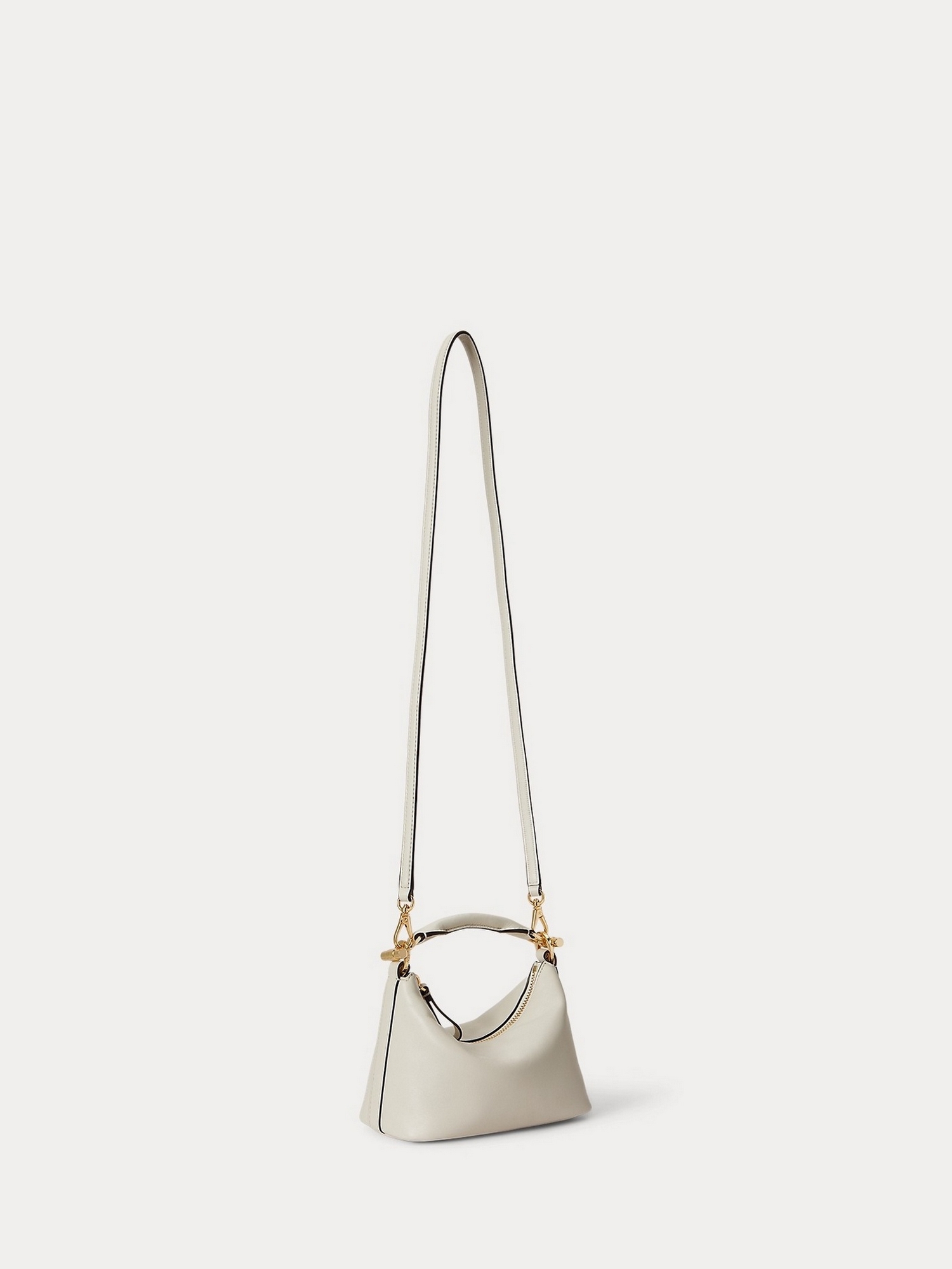 Borsa in cuoio nappa con tracolla rimovibile, accessorio metallico ad alamaro con incisione "LRL" sul manico.