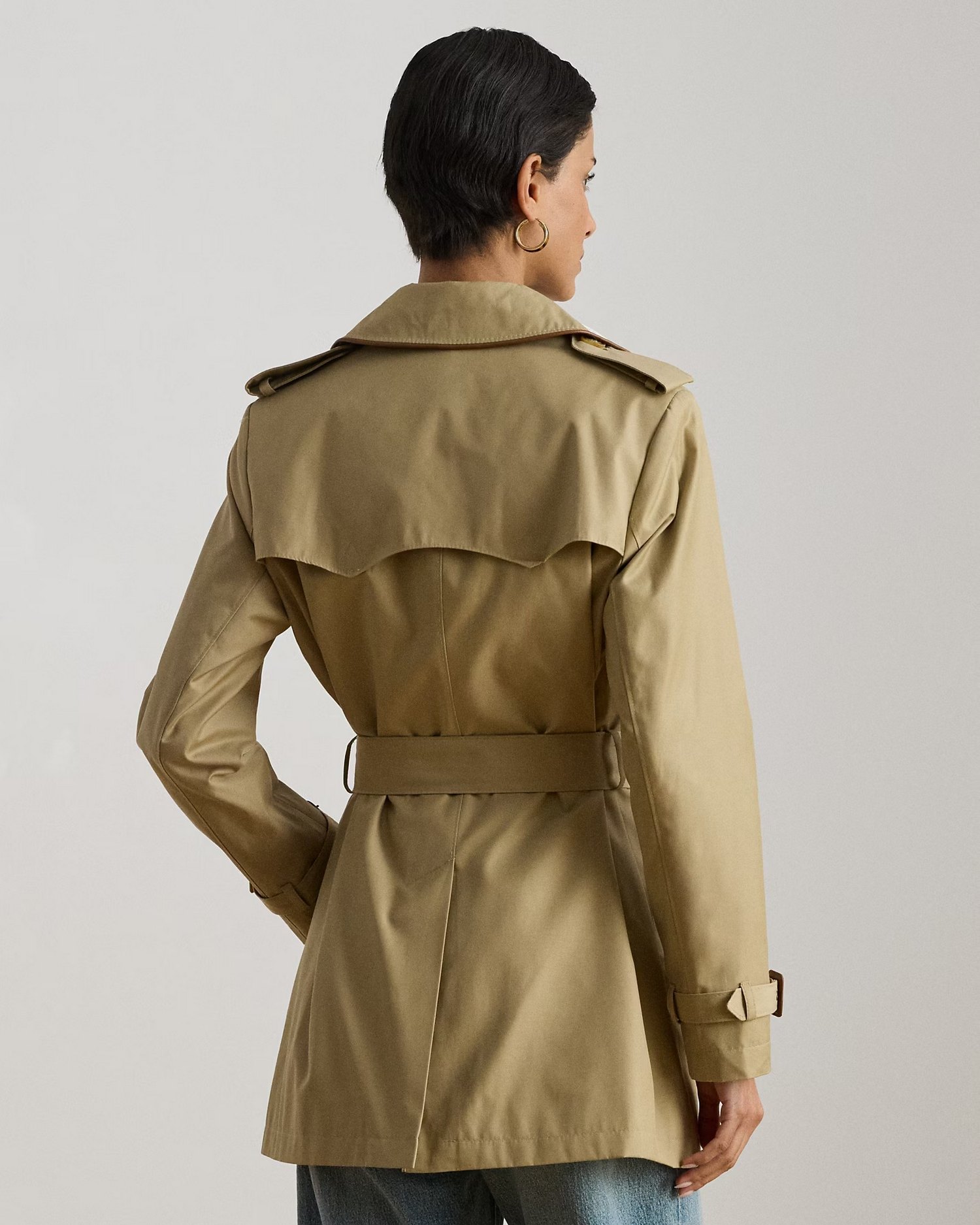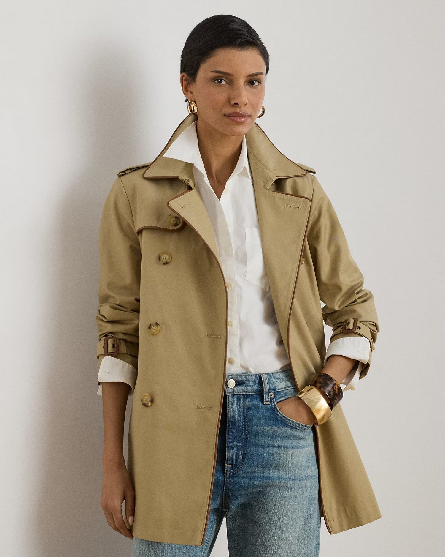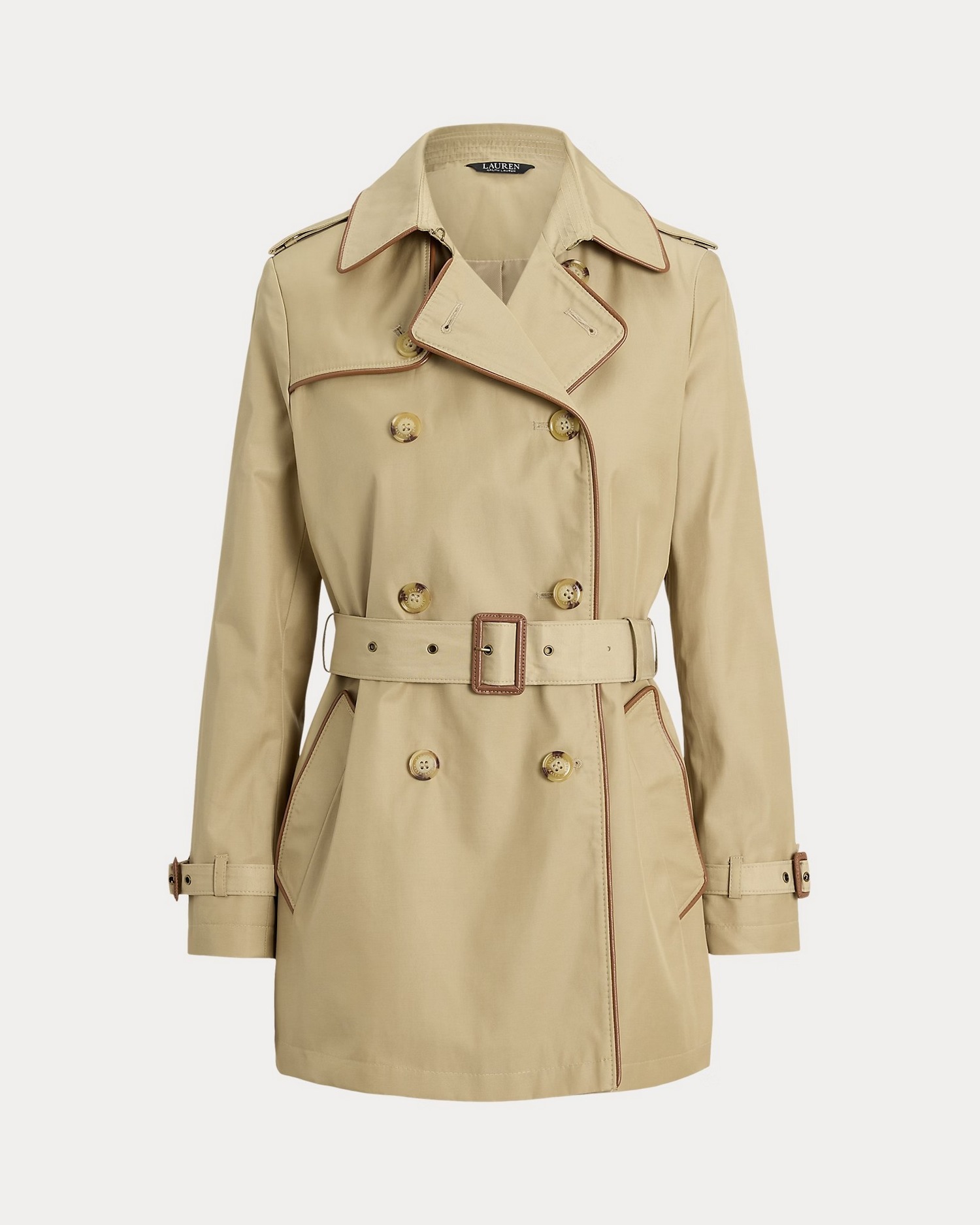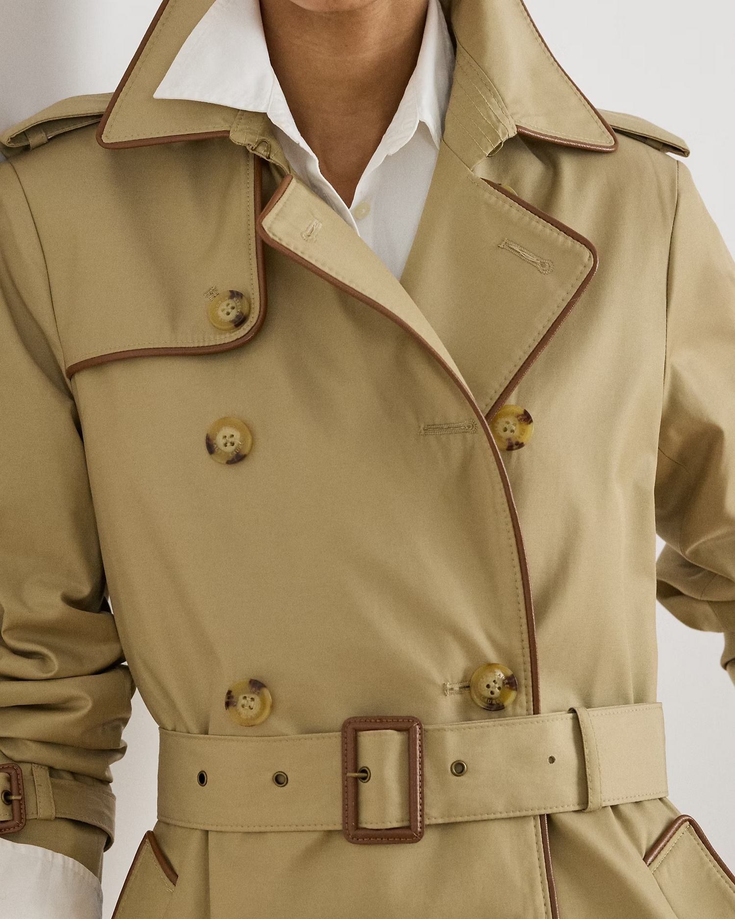 Trench in misto cotone a doppio petto con cintura in vita, spalline con bottoni e fibbie in pelle ecologica.