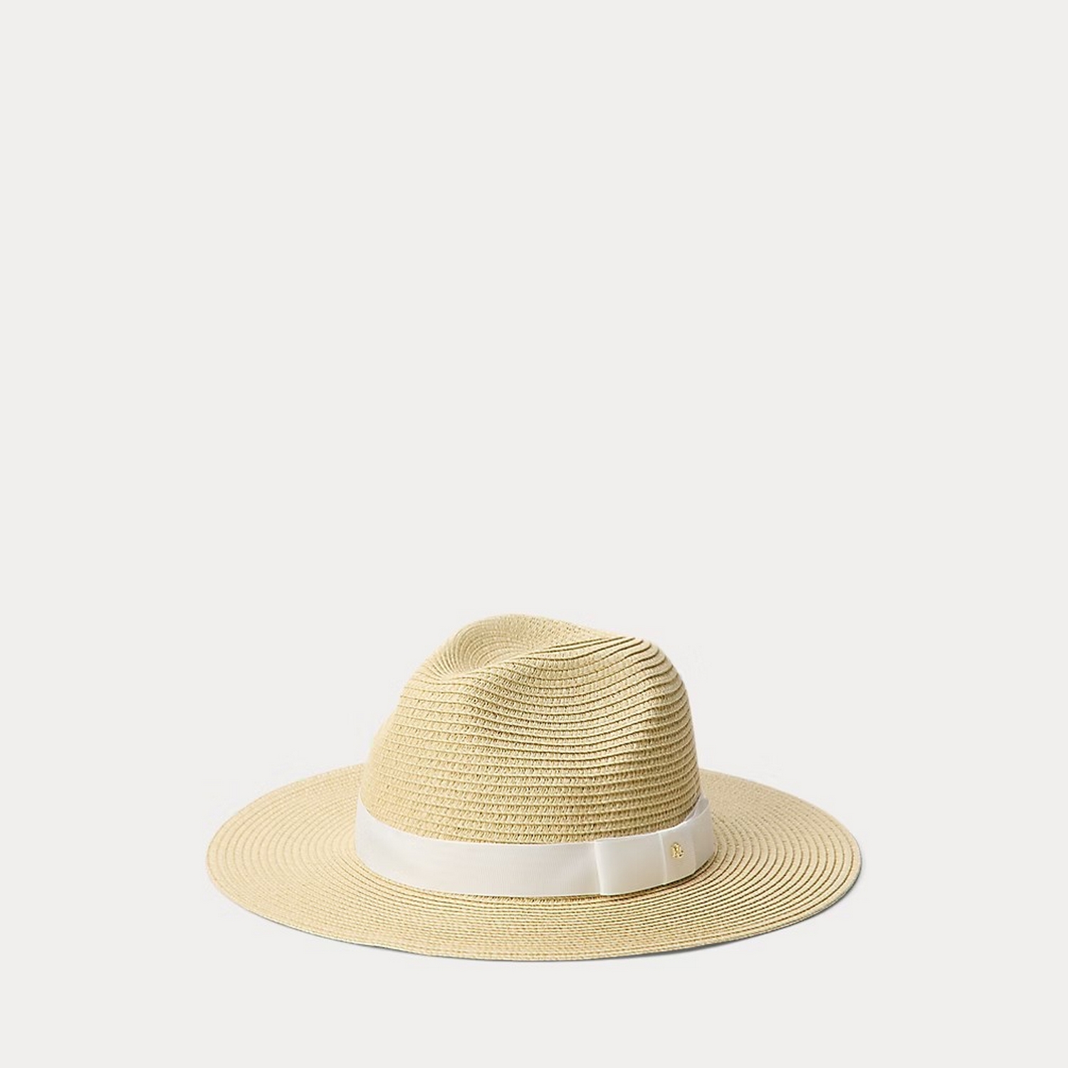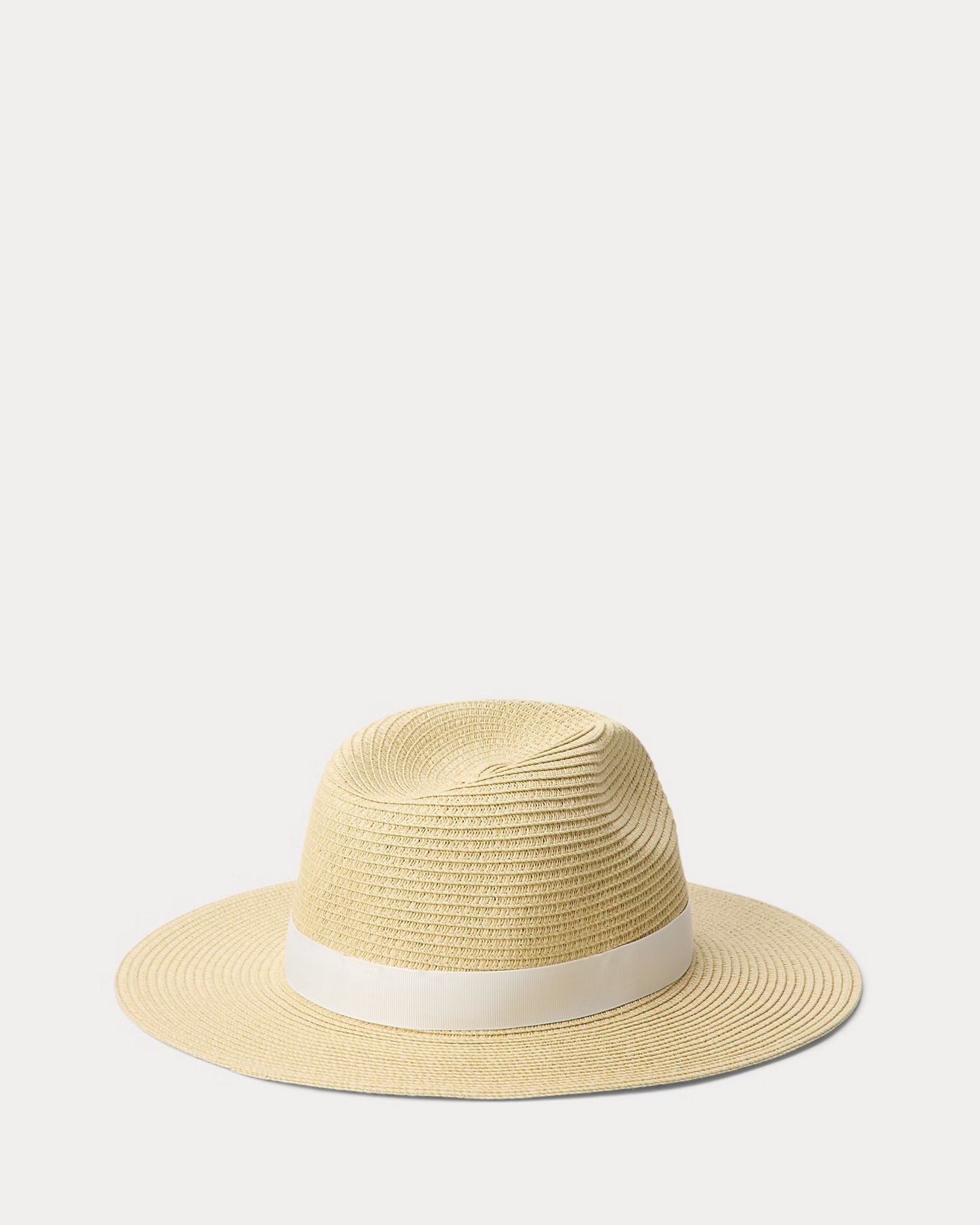 Cappello in paglia di carta intrecciata con nastro decorato con logo.