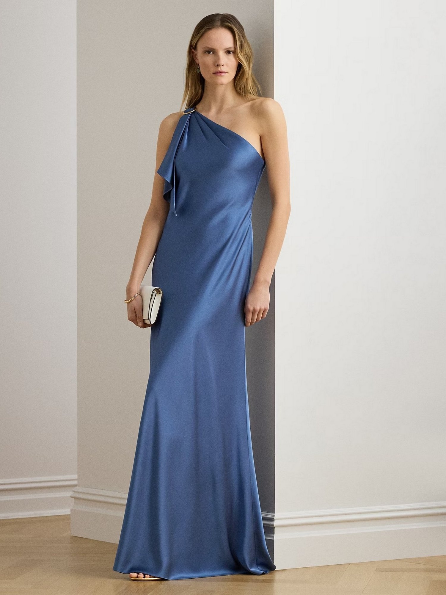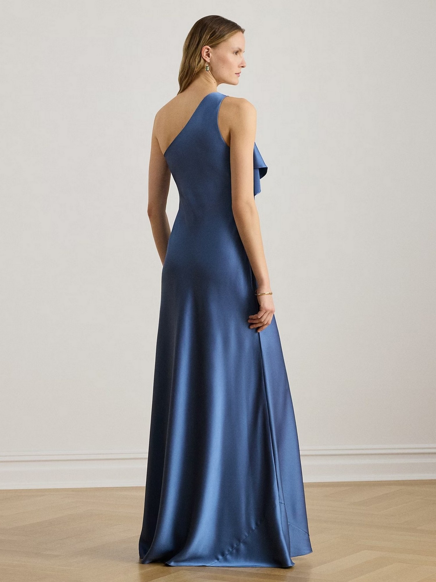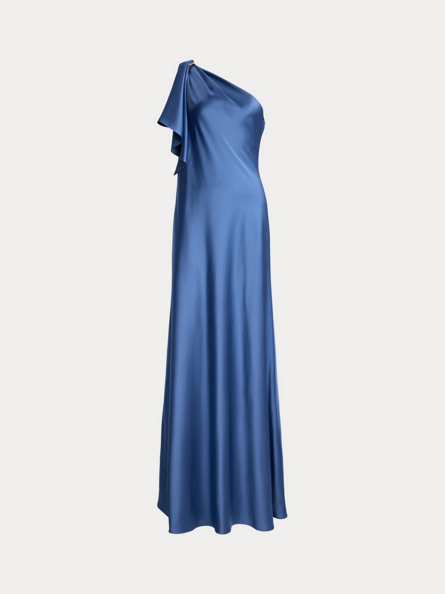 Abito in fluido charmeuse di raso martellato con volant drappeggiato che ricade da una fibbia posta sulla spalla.