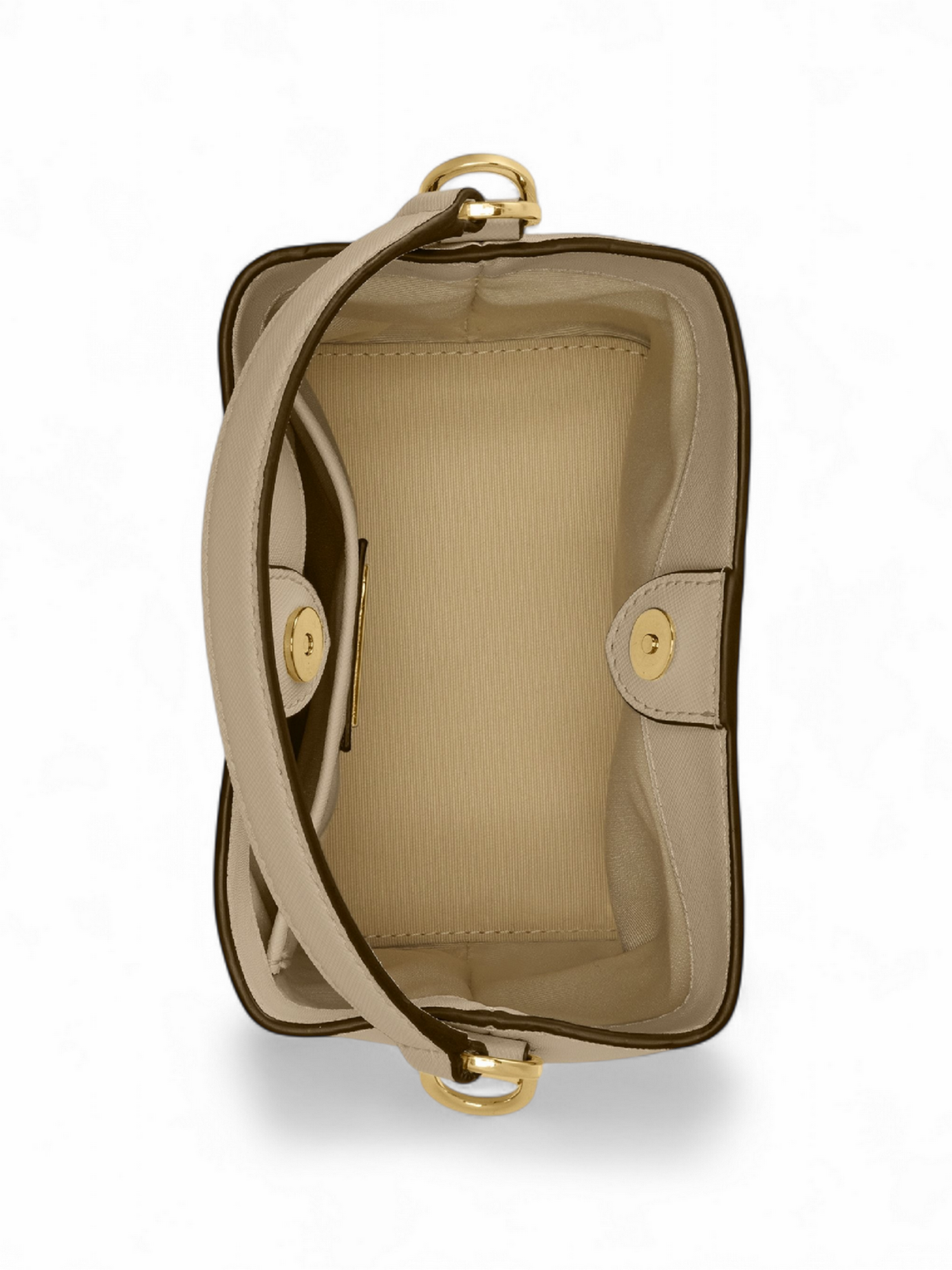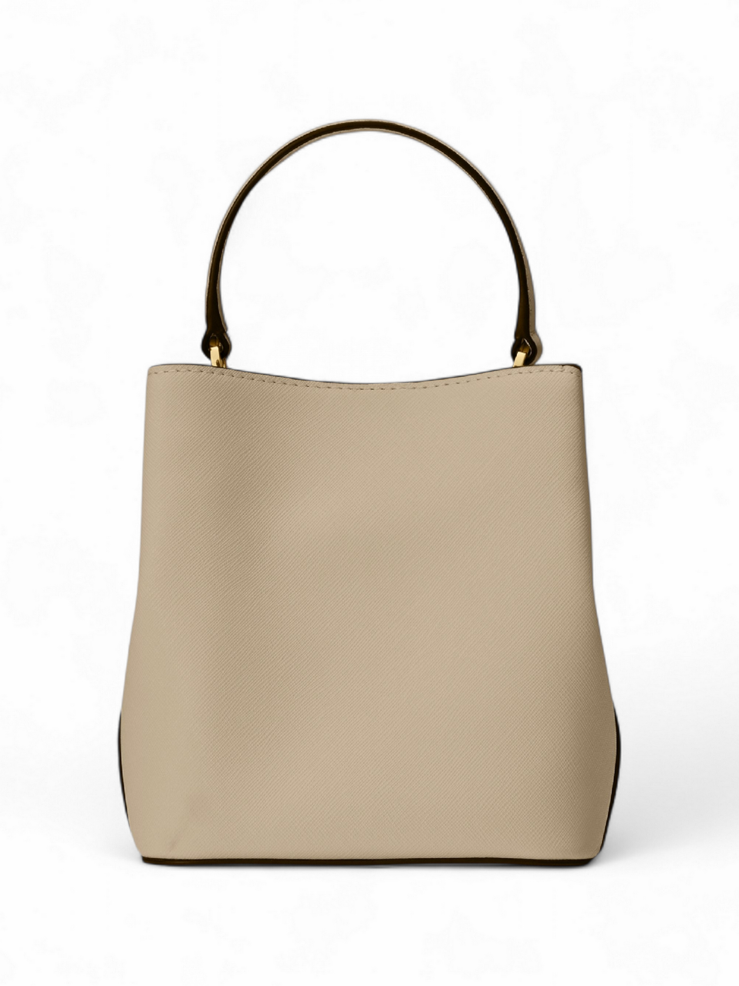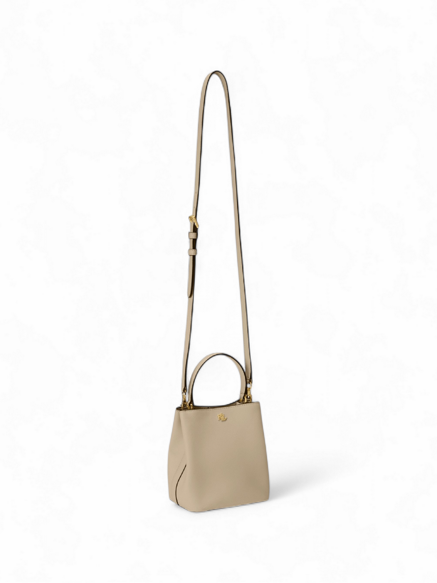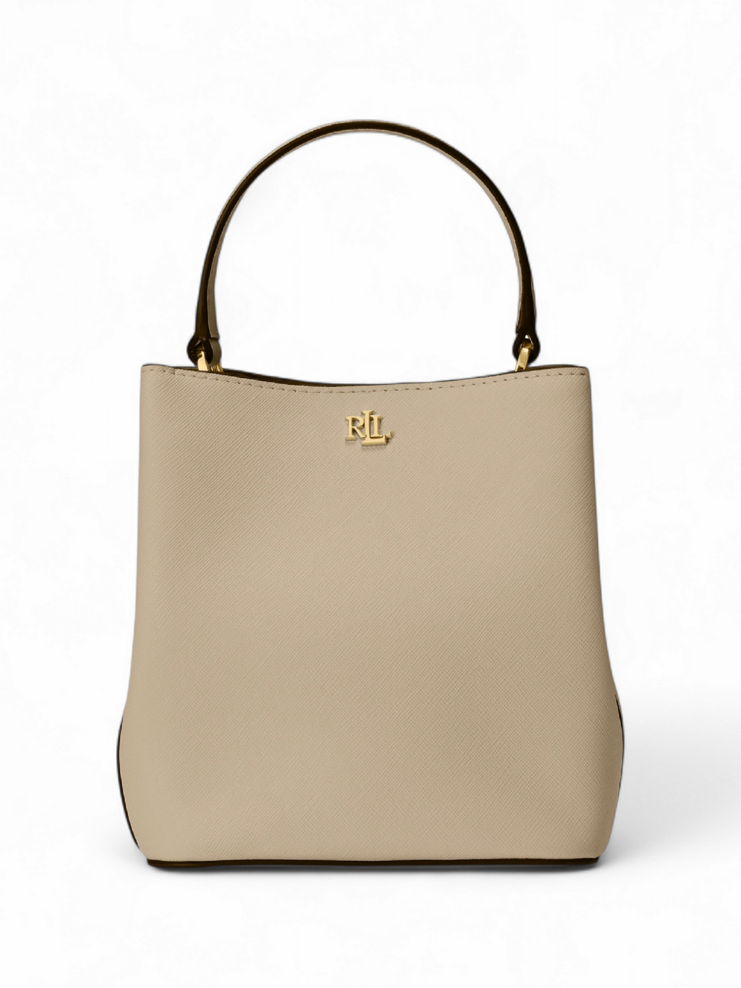 Borsa a secchiello in pelle con tracolla rimovibile e regolabile e logo "LRL" lucido sul davanti.