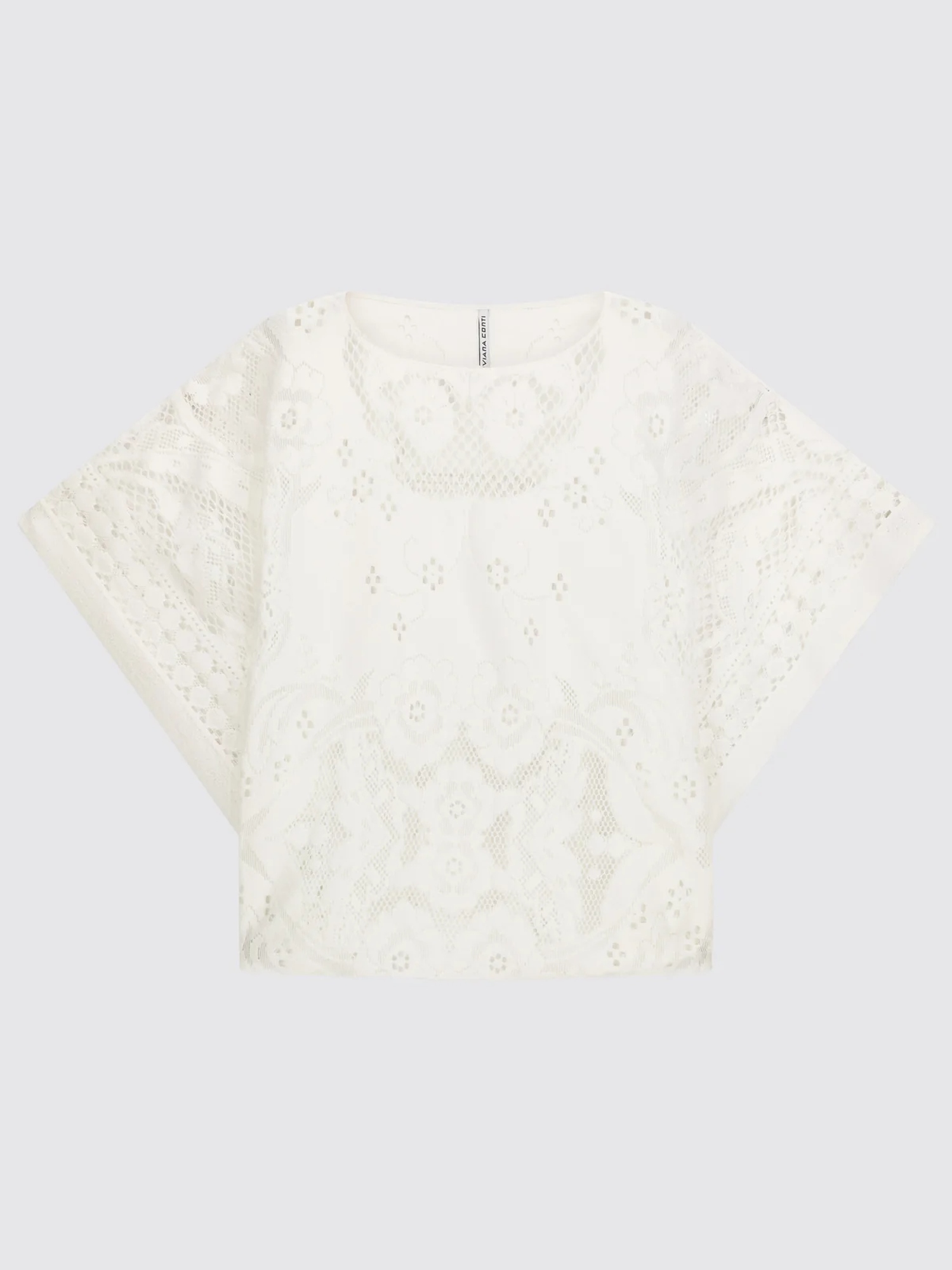 Blusa in pizzo di cotone con maniche scese ad aletta e scollo a barchetta, motivo floreale e rete con trasparenze.