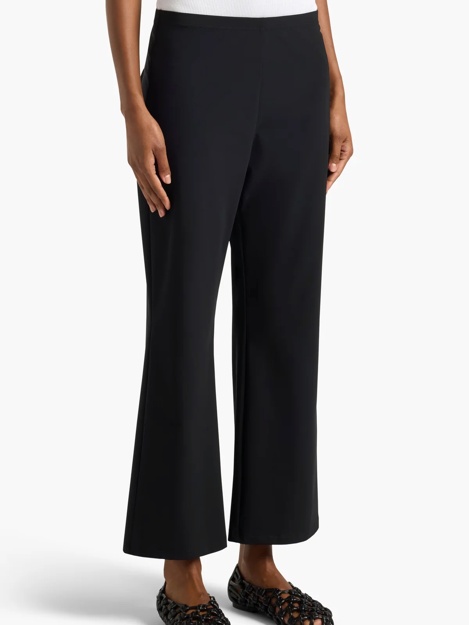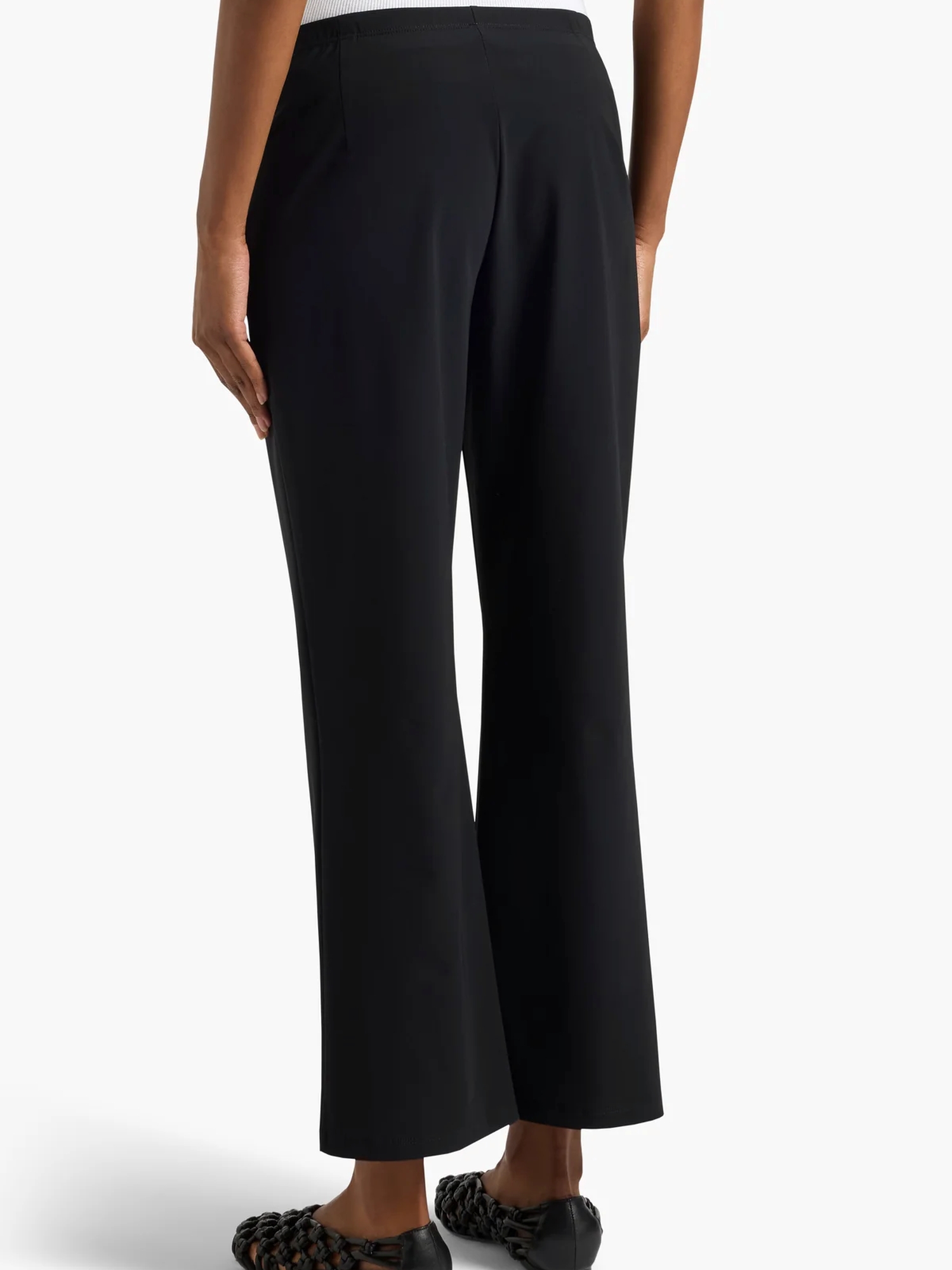 Pantaloni in tessuto elastico, a zampa, linea aderentee volume svasato al fondo.
