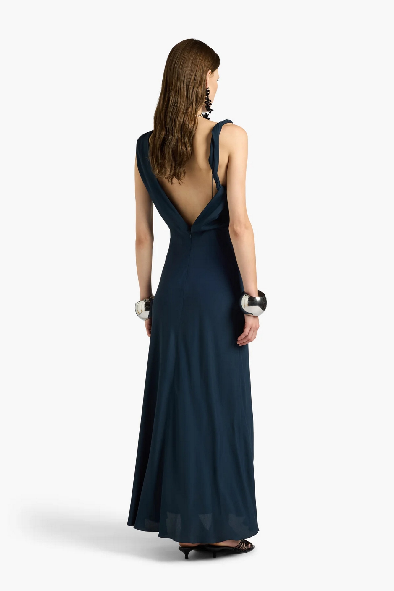 Abito lungo smanicato in crepe de chine acetato-seta, taglio in vita con parte sotto a sbieco, zip centrale con scollo a v sul dietro.